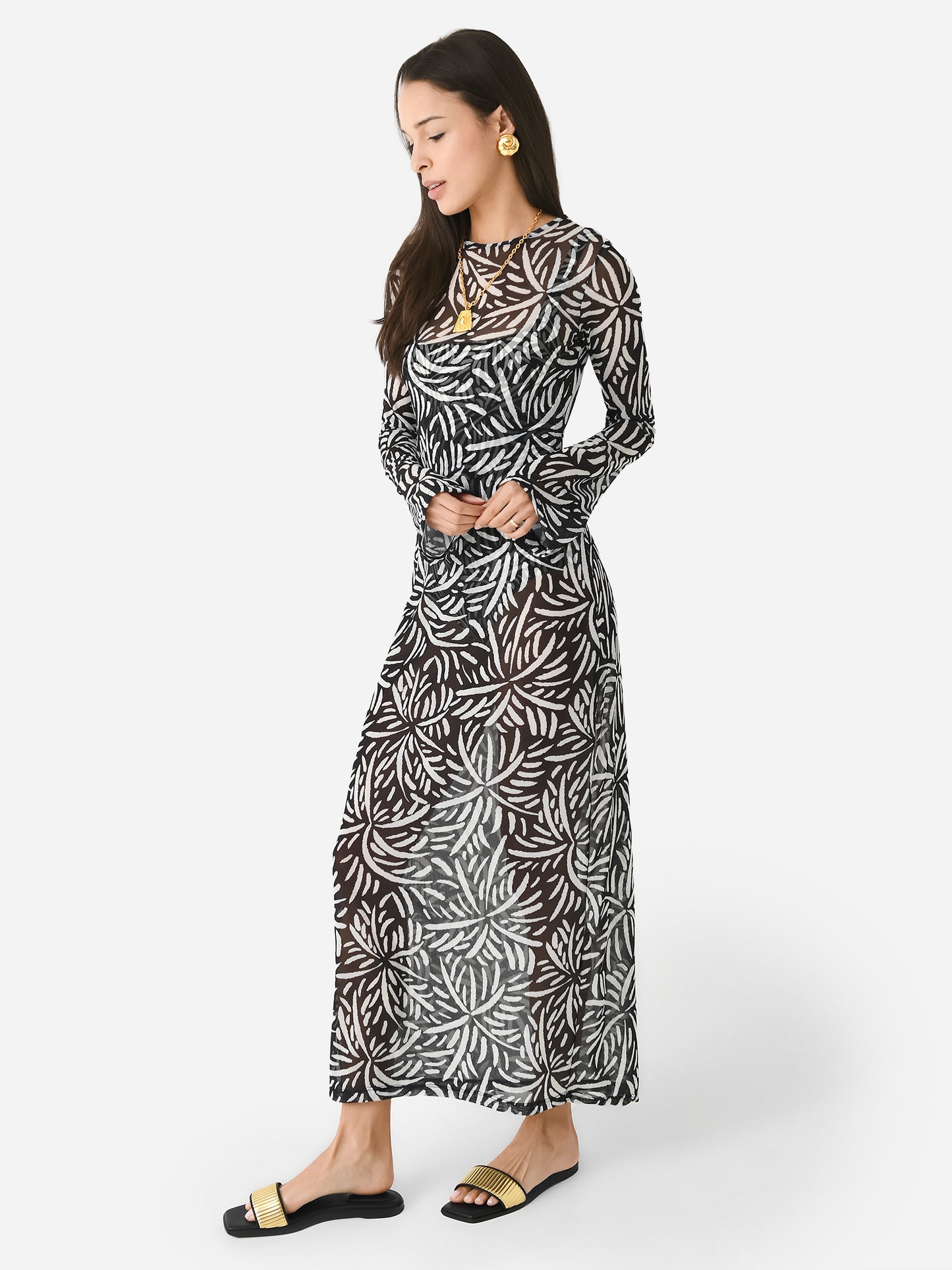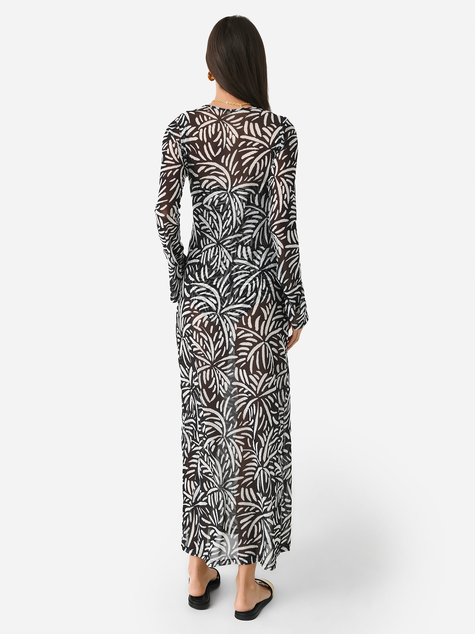 A sheer, maxi-length cover-up dress with long sleeves and a novelty print.