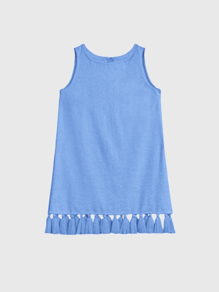 This soft cotton-terry dress features a classic shift silhouette. It is detailed with playful tassels that line the hem for added movement.