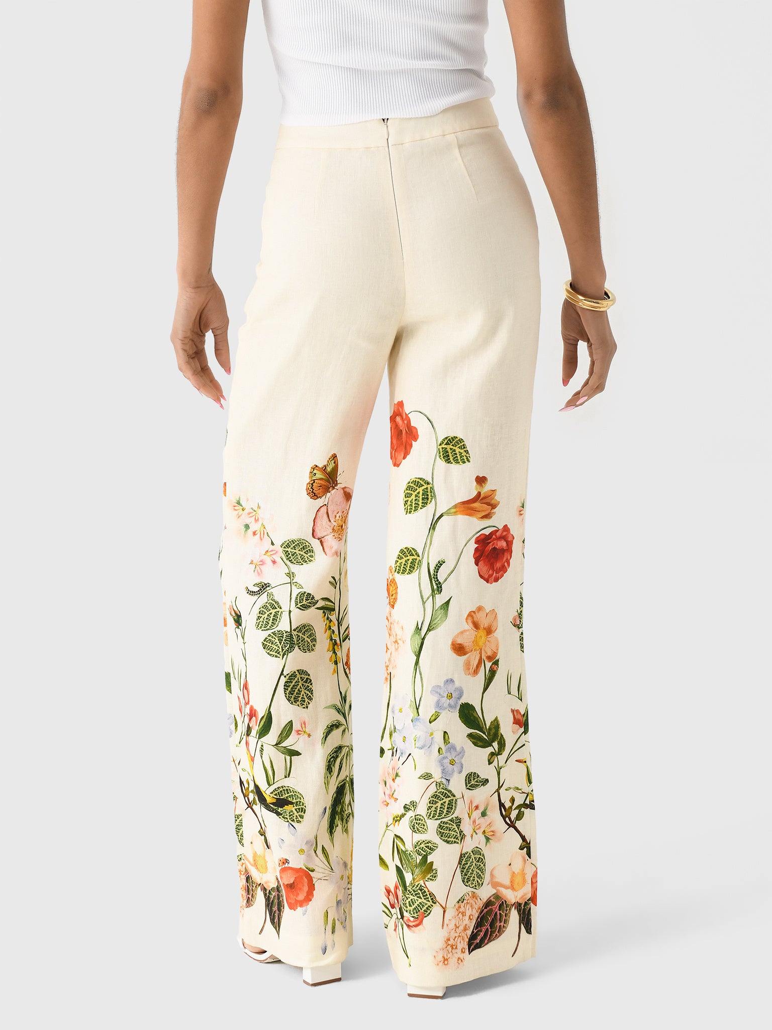 This flattering pant offers a comfortable wide-leg design made from lightweight linen with a colorful floral print.