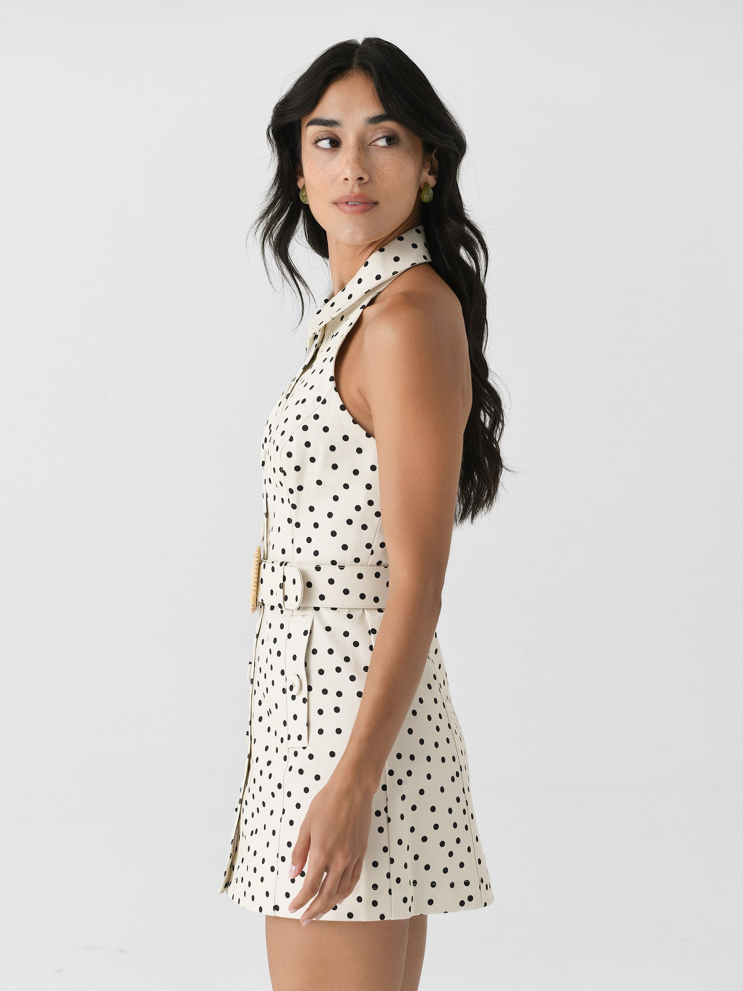 This halter mini dress is made from lightweight cotton canvas and features flattering princess seams and a self-covered belt with a raffia buckle.