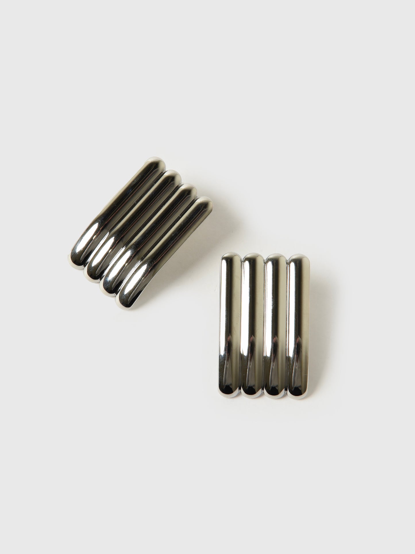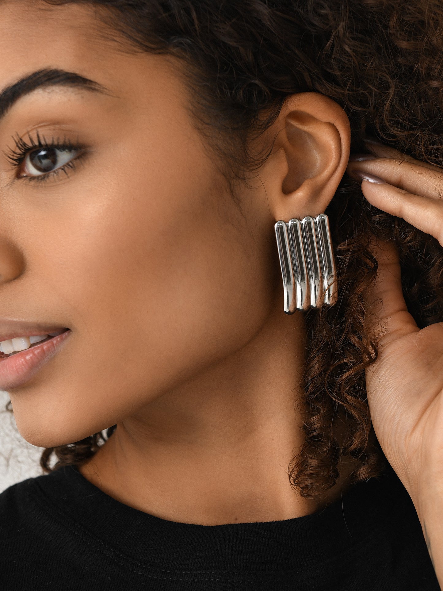 A pair of silver-toned rectangle earrings made from ribbed stainless steel.