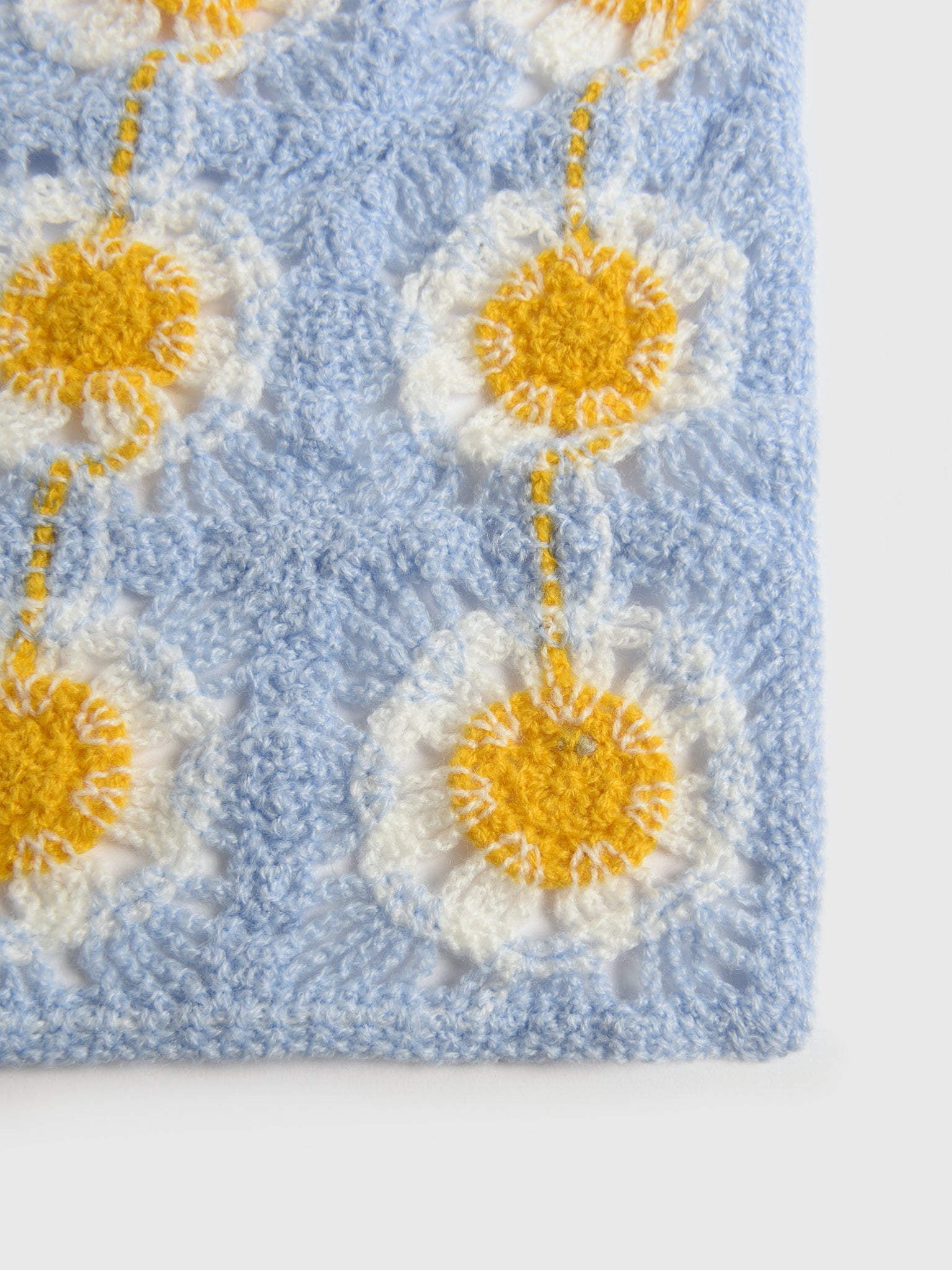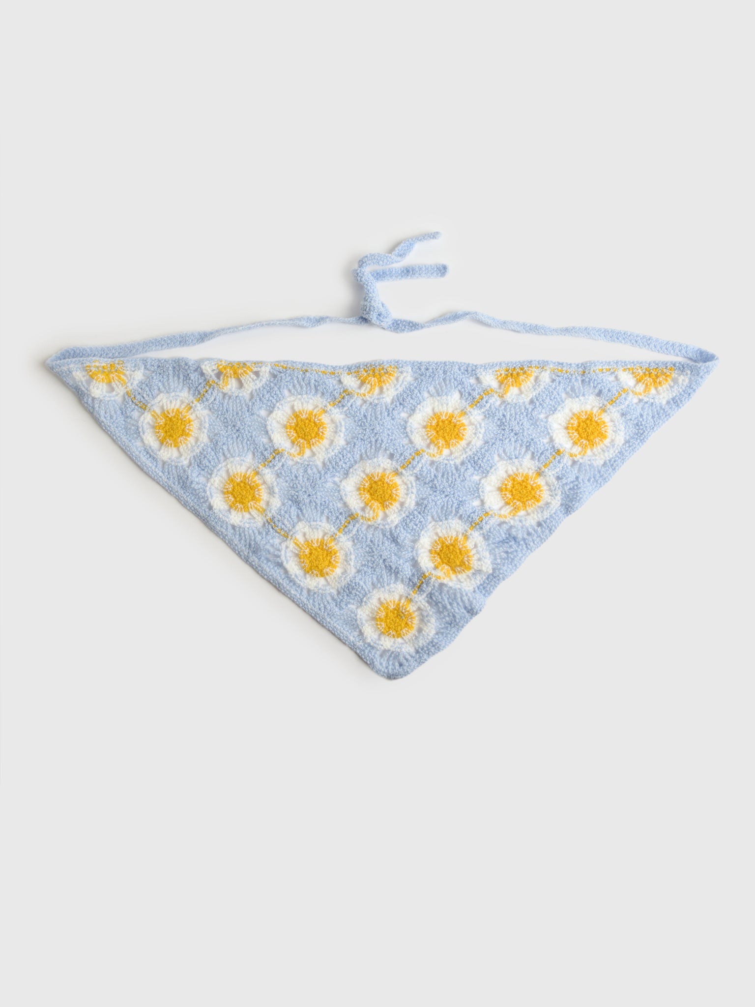 This triangle-shaped headscarf is made from soft crochet fabric with a white and yellow floral design.