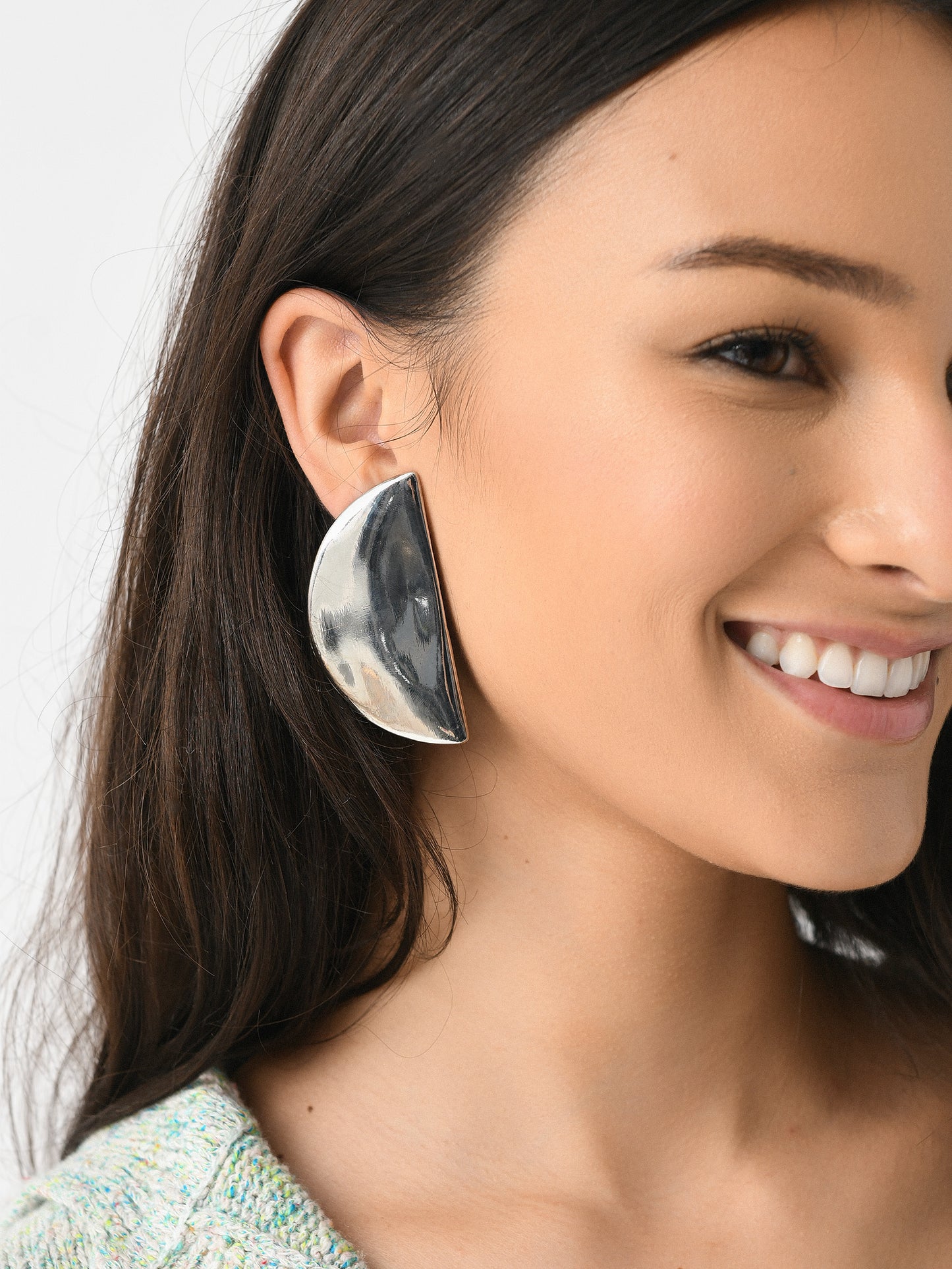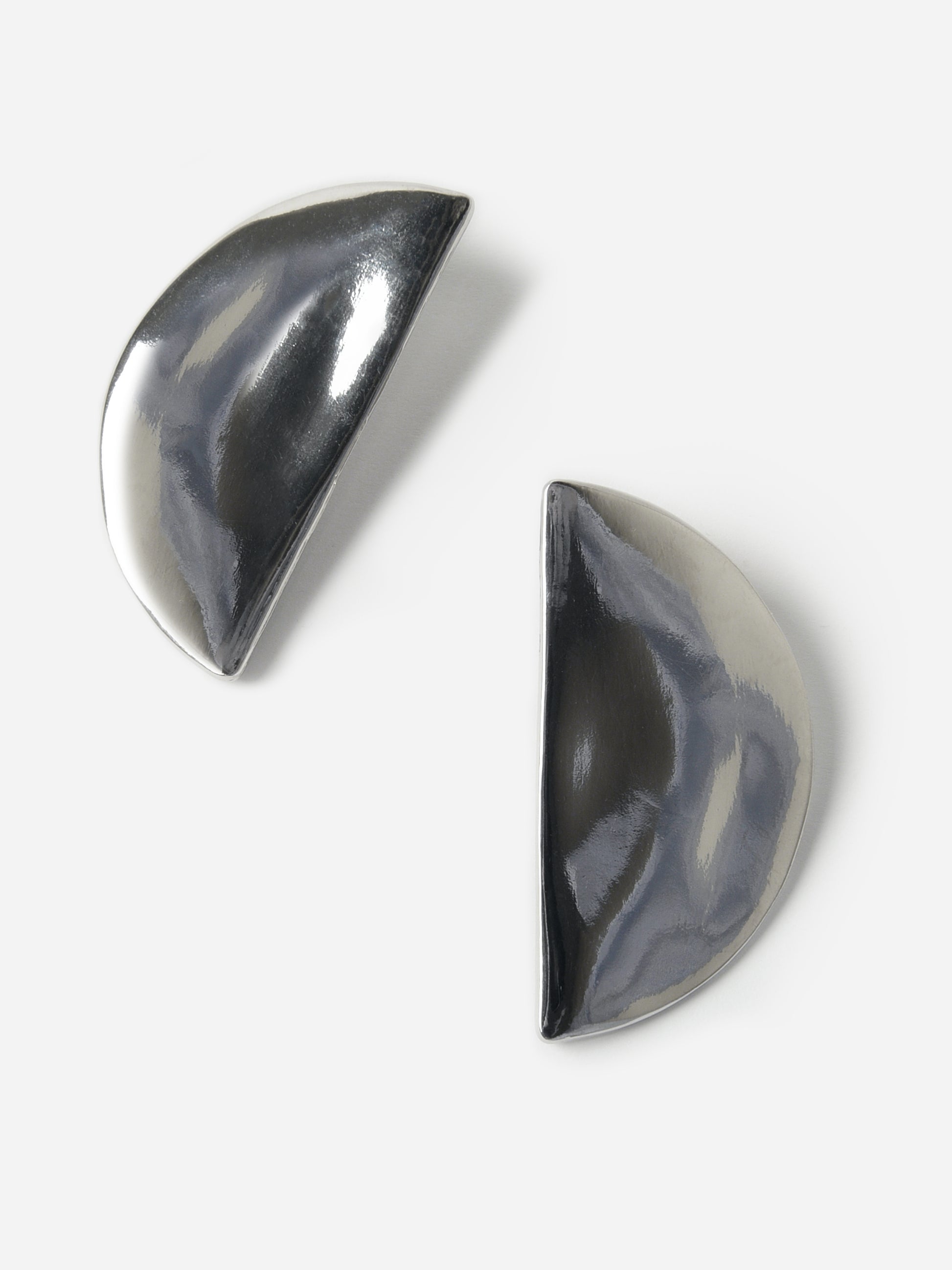 A pair of silver half-circle drop earrings.