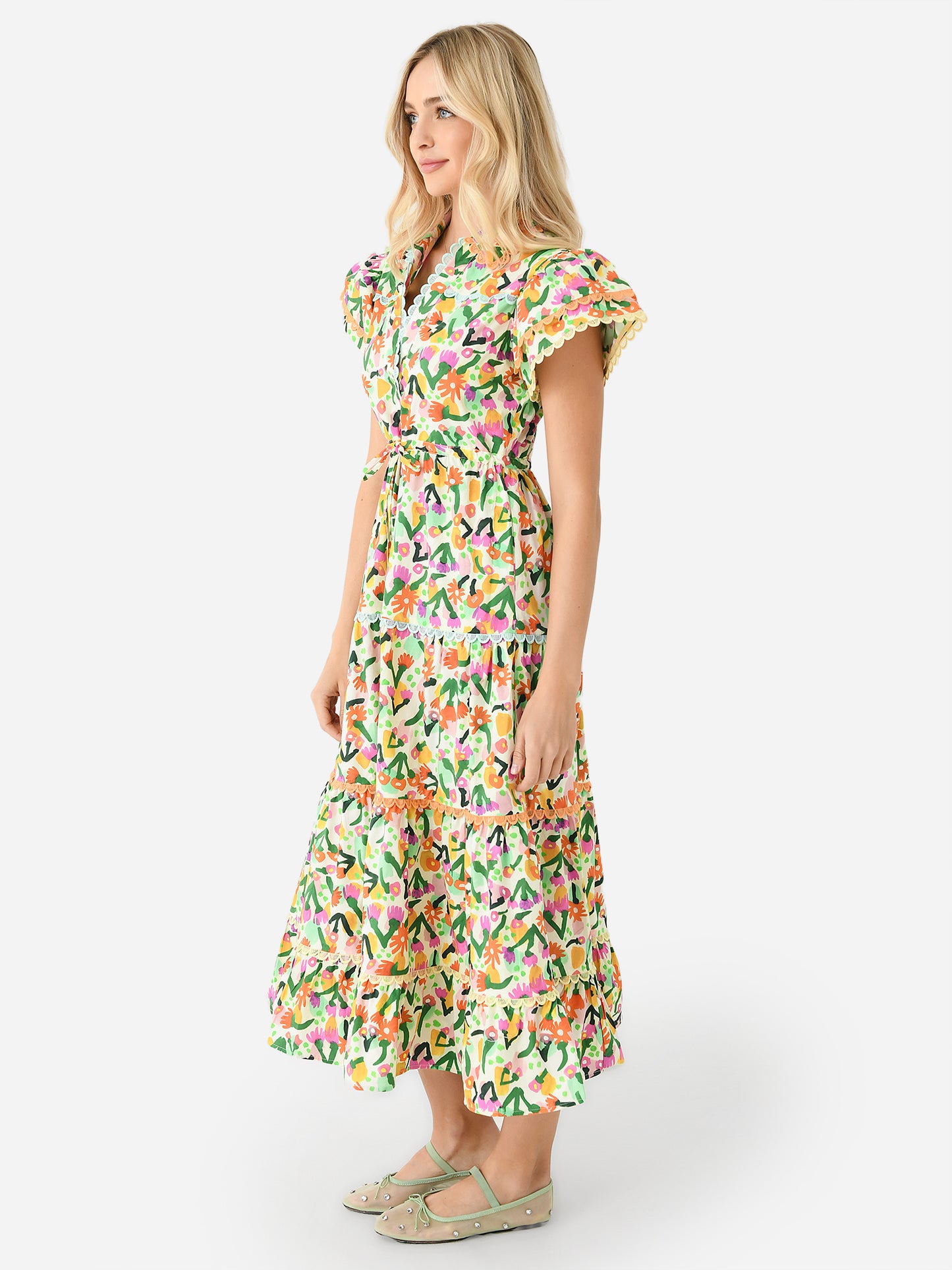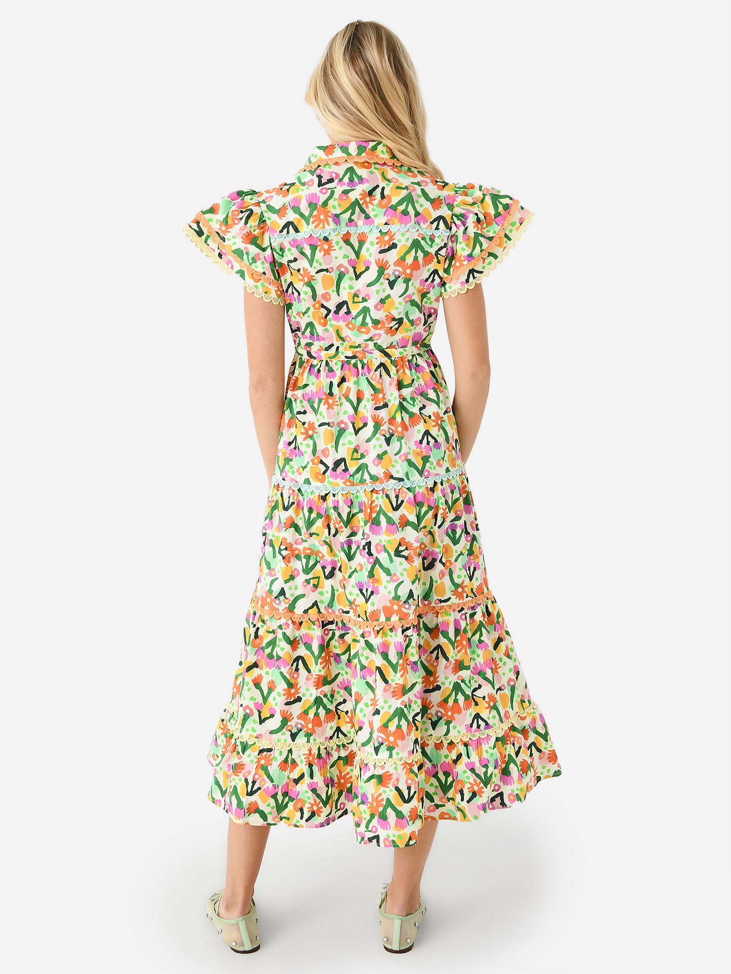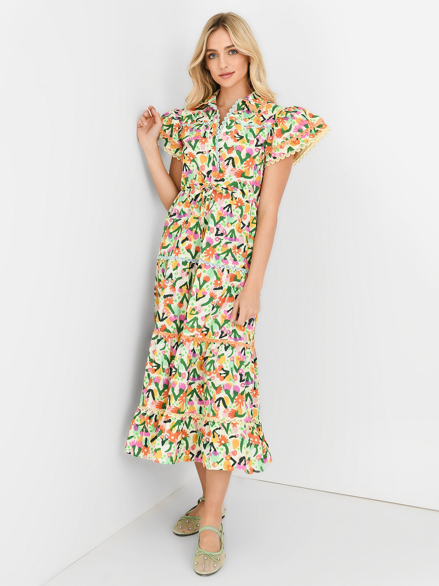 A colorful printed mid-length shirt-style dress with an adjustable waist and scalloped trims throughout.