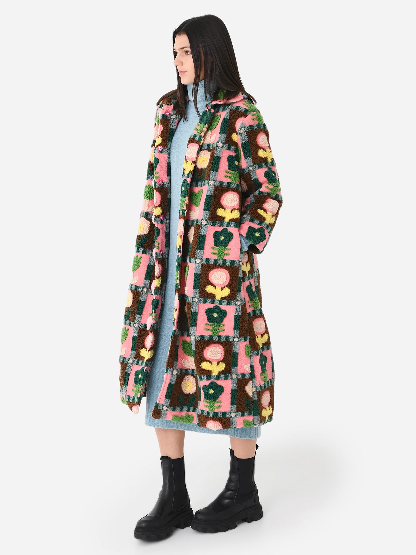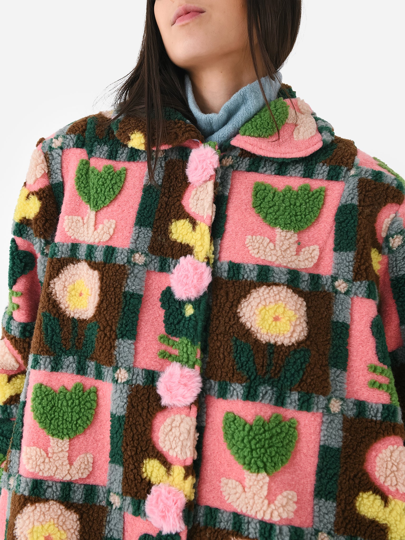 This faux fur coat features an earthy-toned flower print and unique pom buttons.