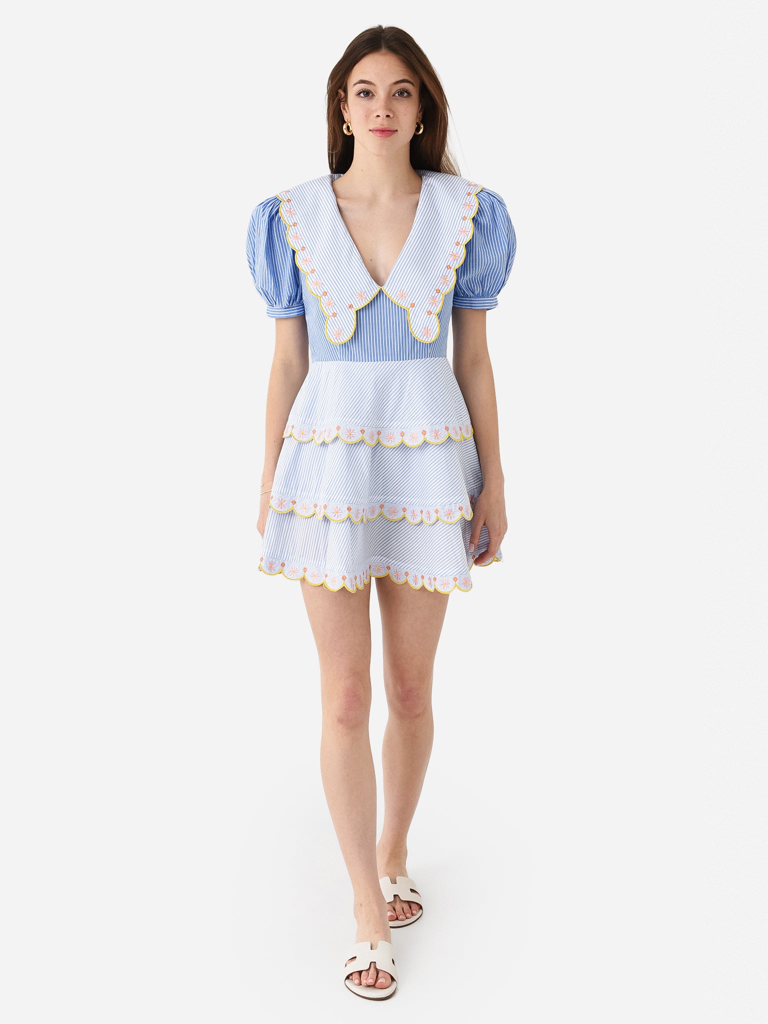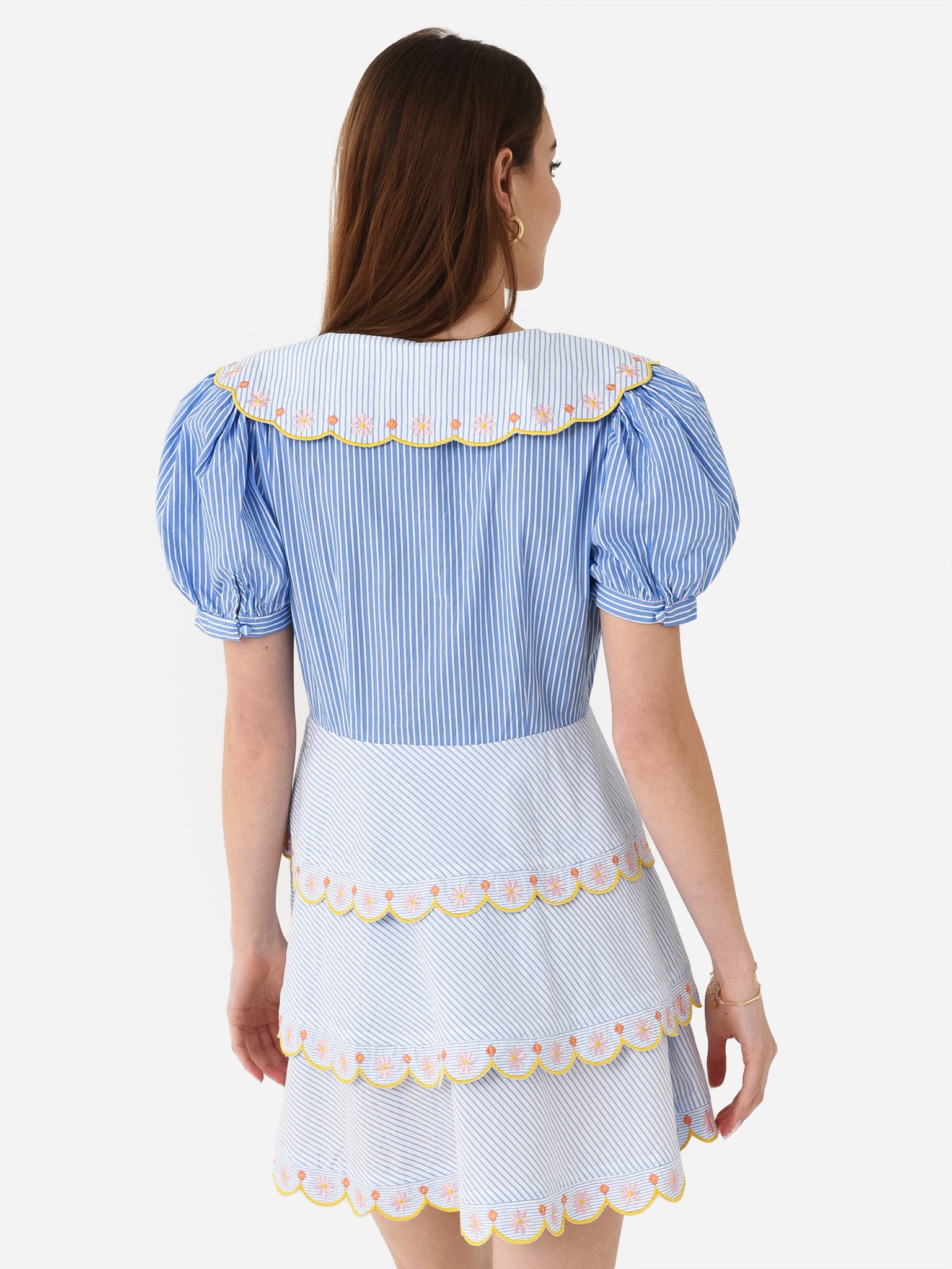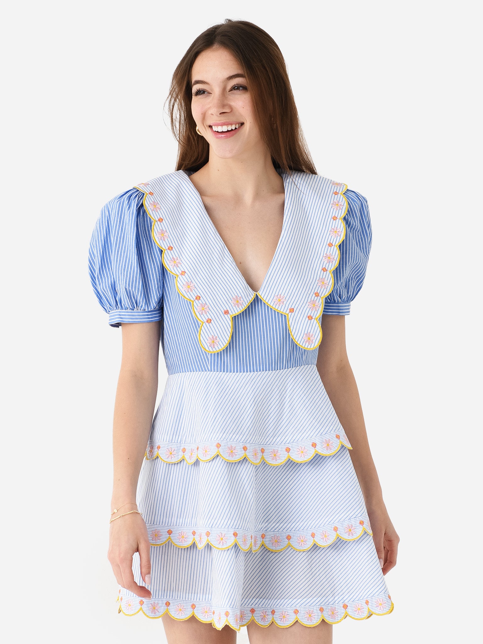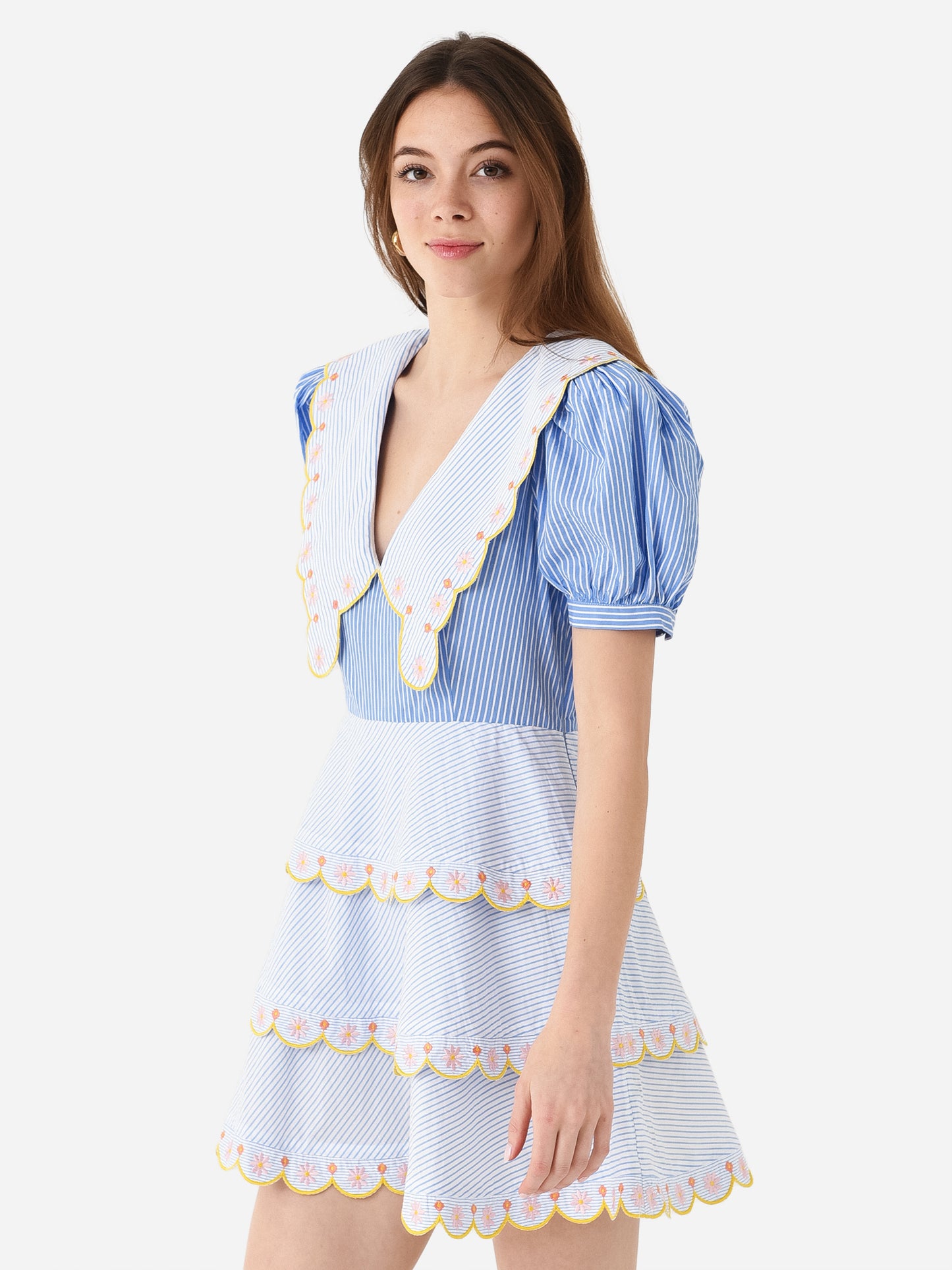 Two-tone striped mini dress with collar overlay detail and scalloped trim throughout.