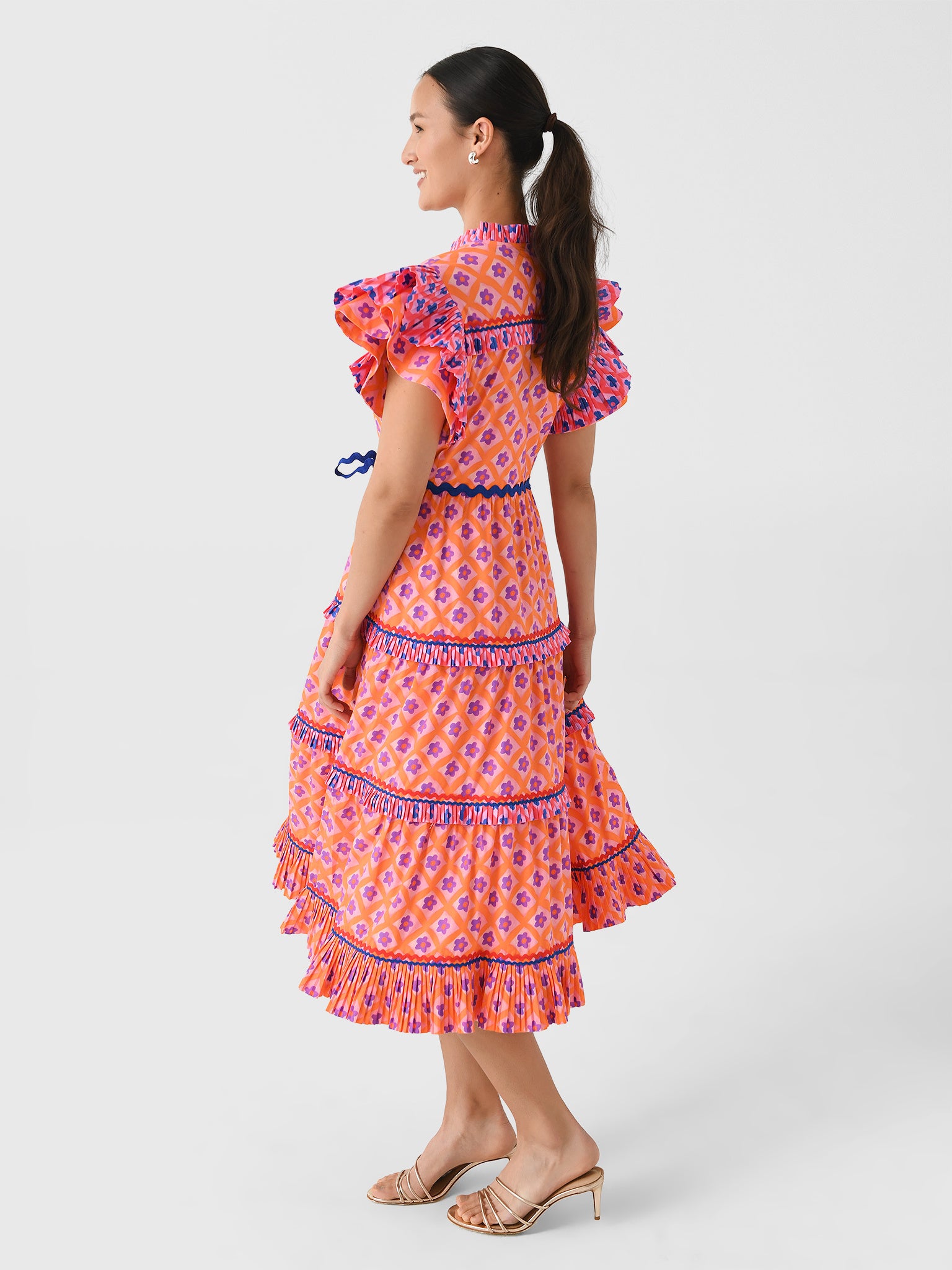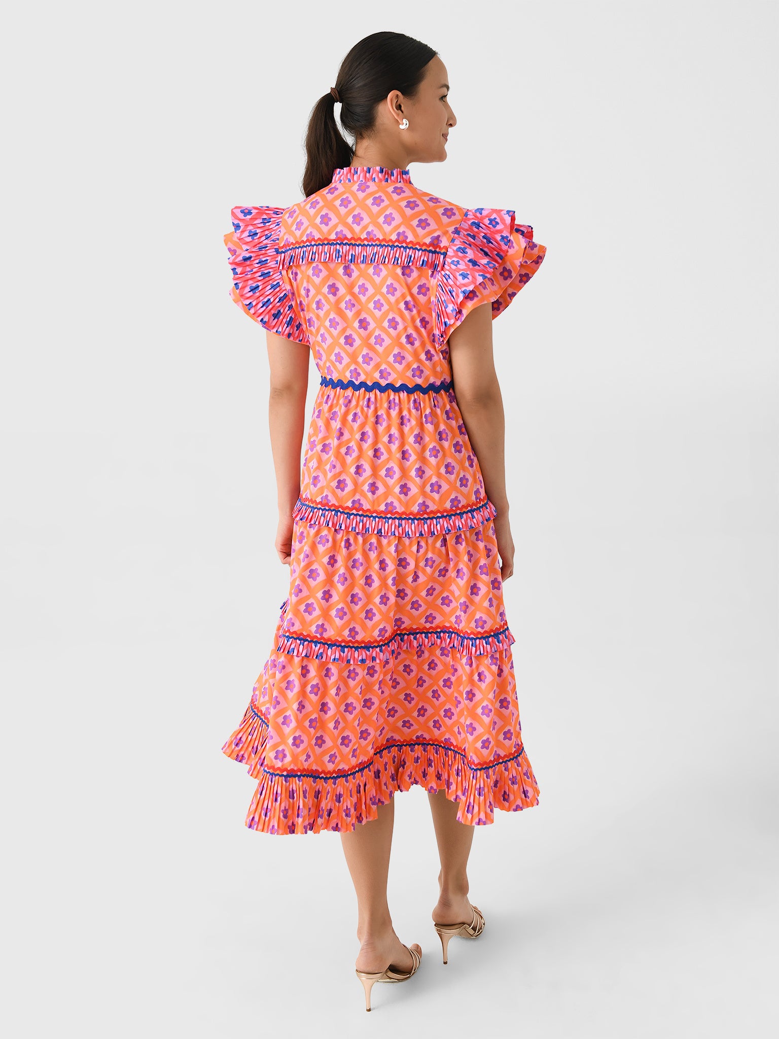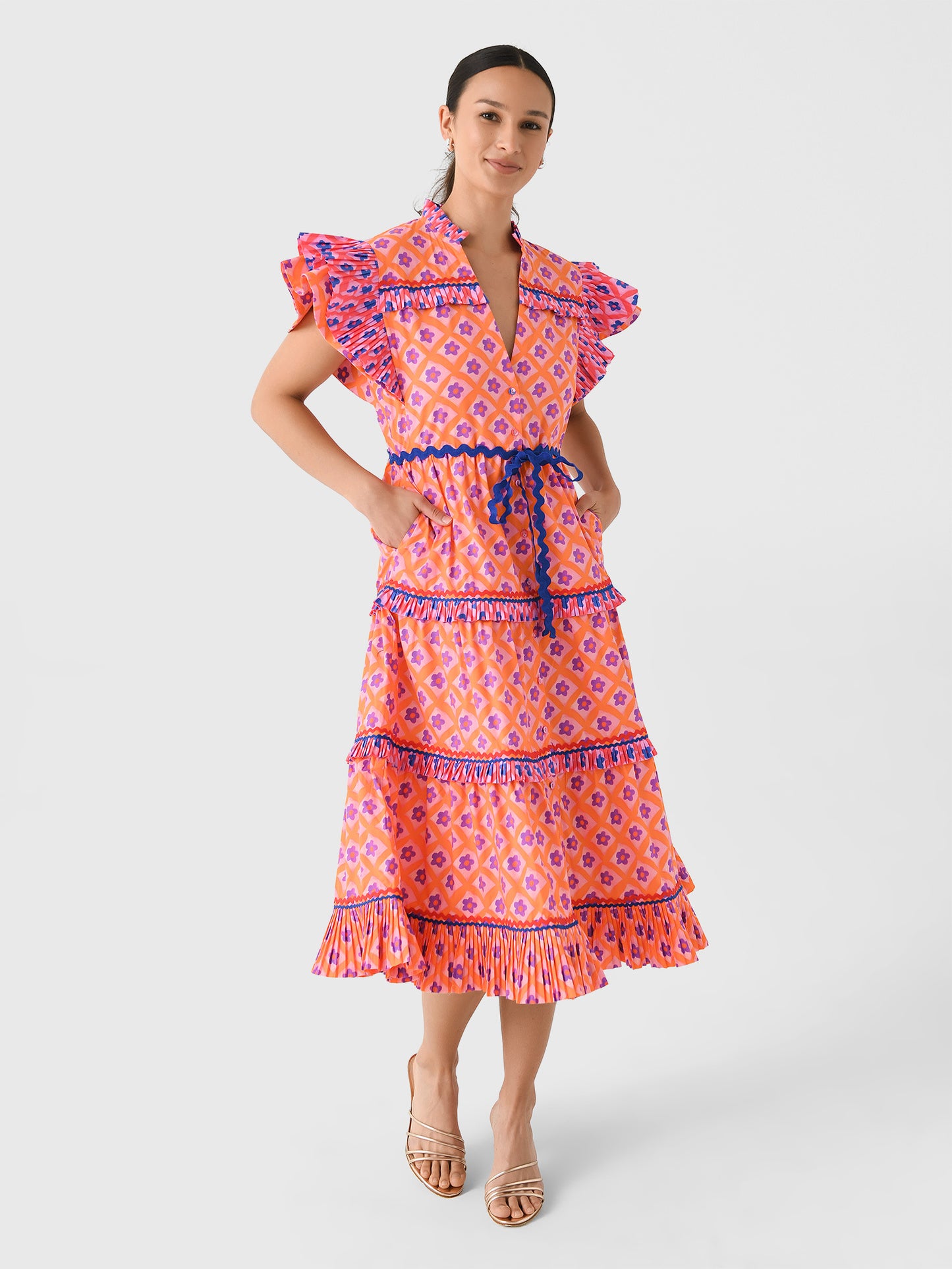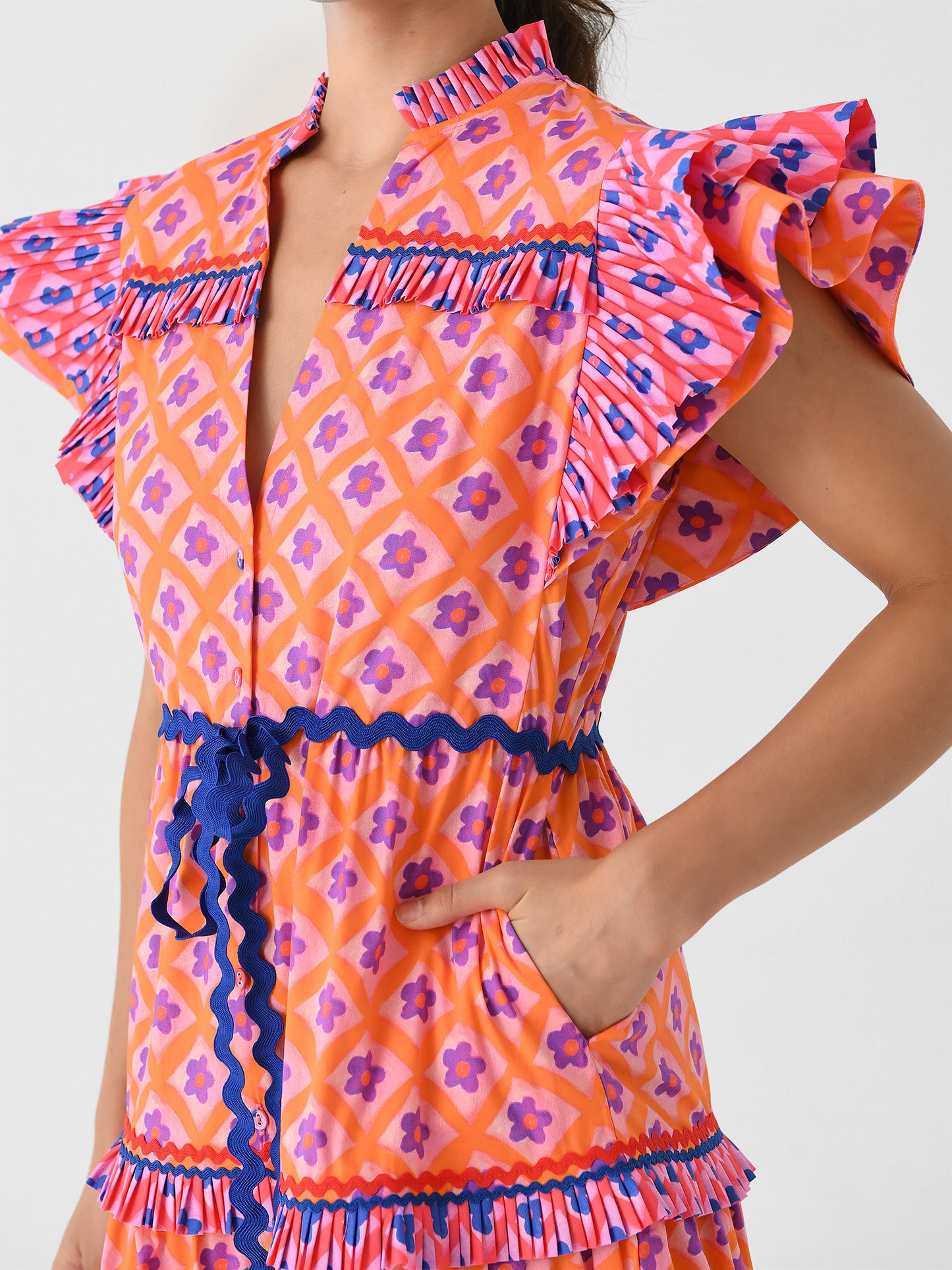 A mid-length dress made from a comfortable cotton blend with a floral print, flutter sleeves, pleated ruffle trims, and an adjustable drawstring waist.