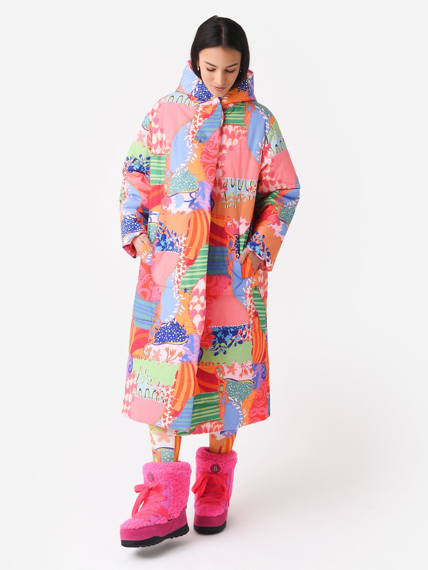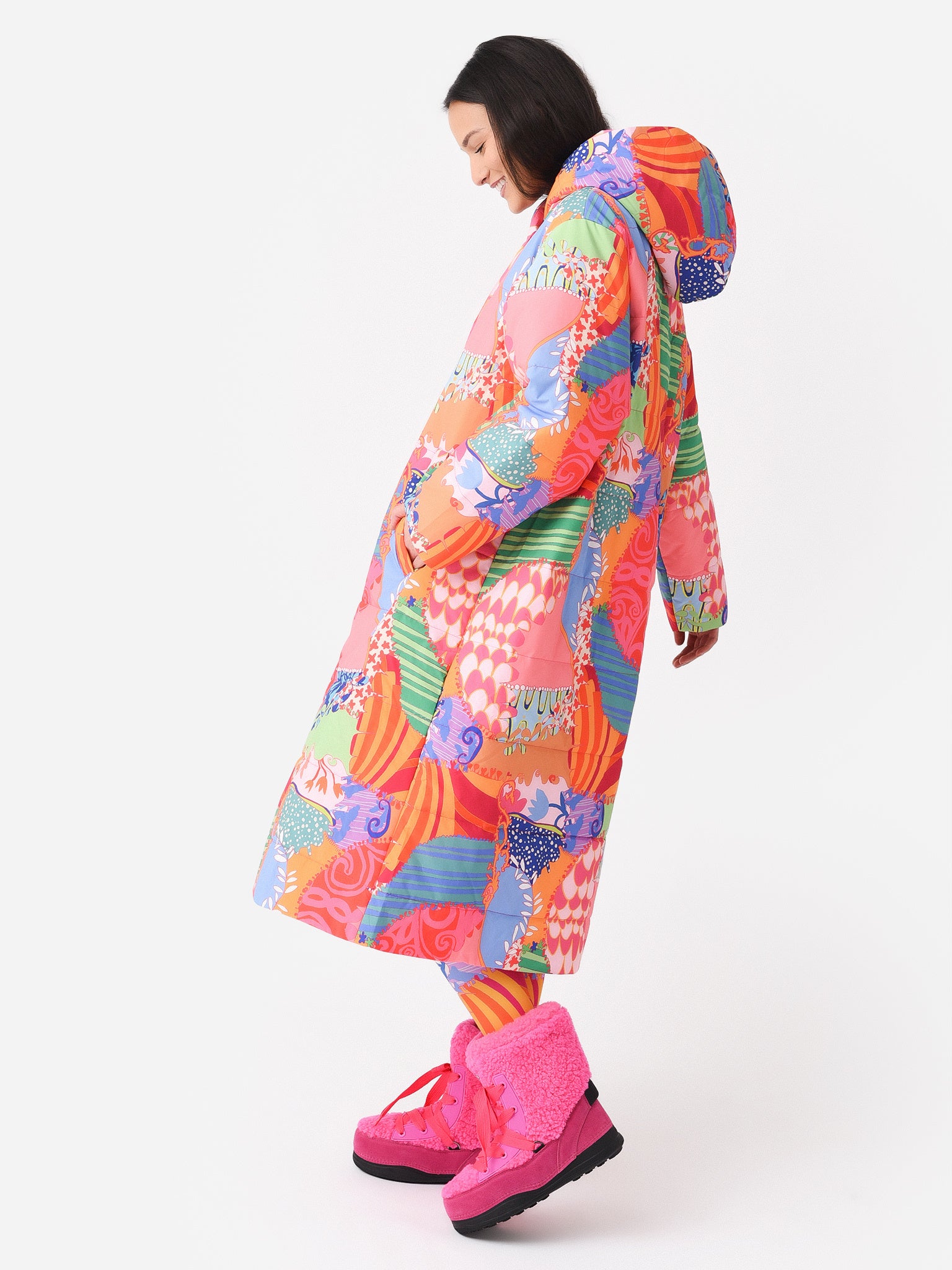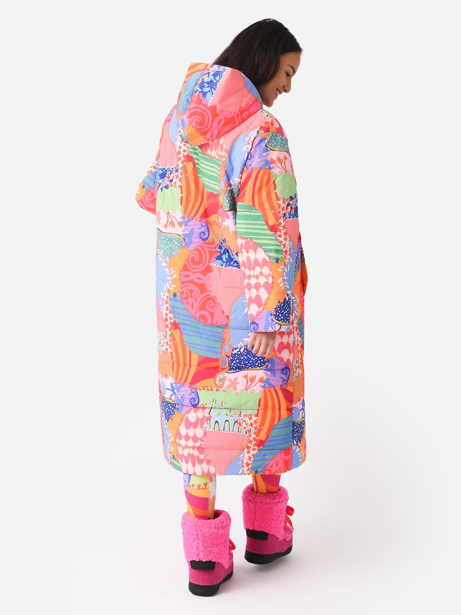 Reversible quilted coat with a colorful print and long silhouette.