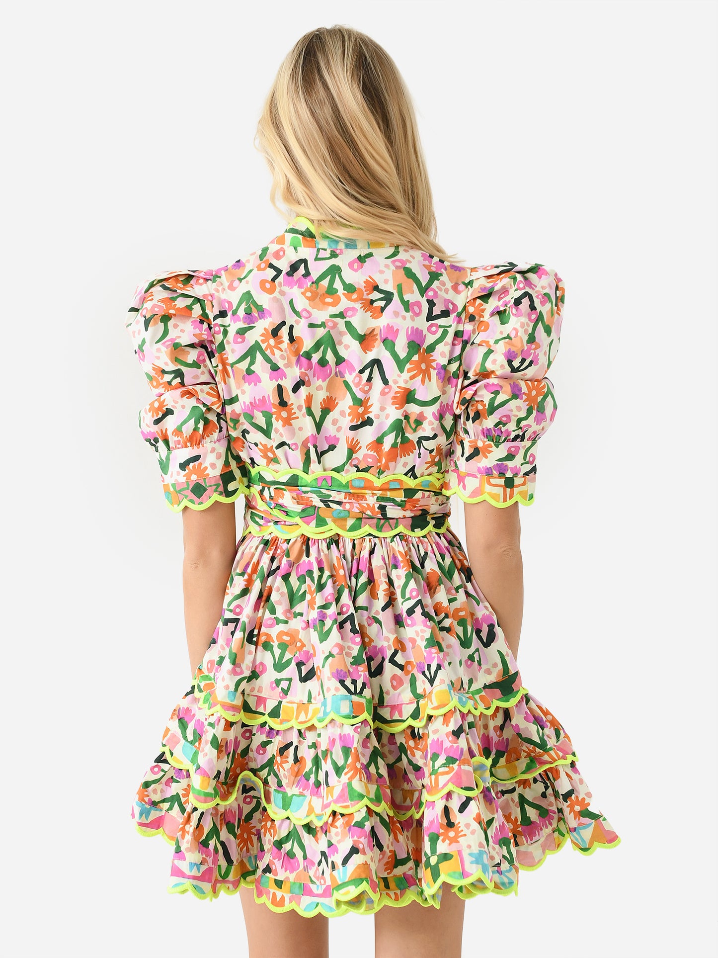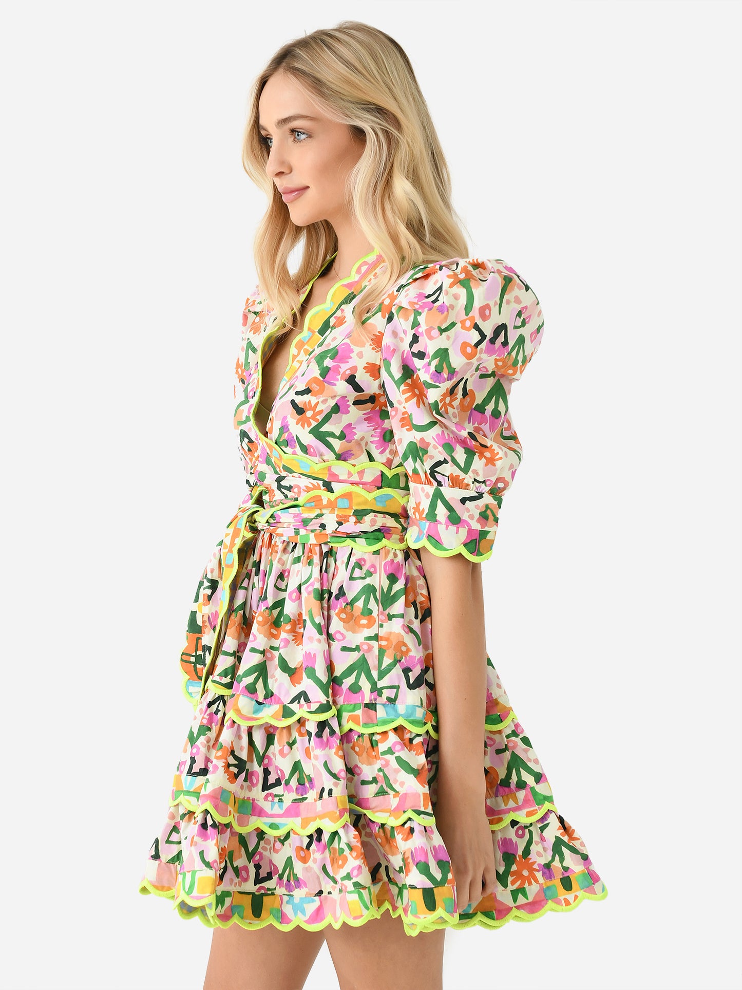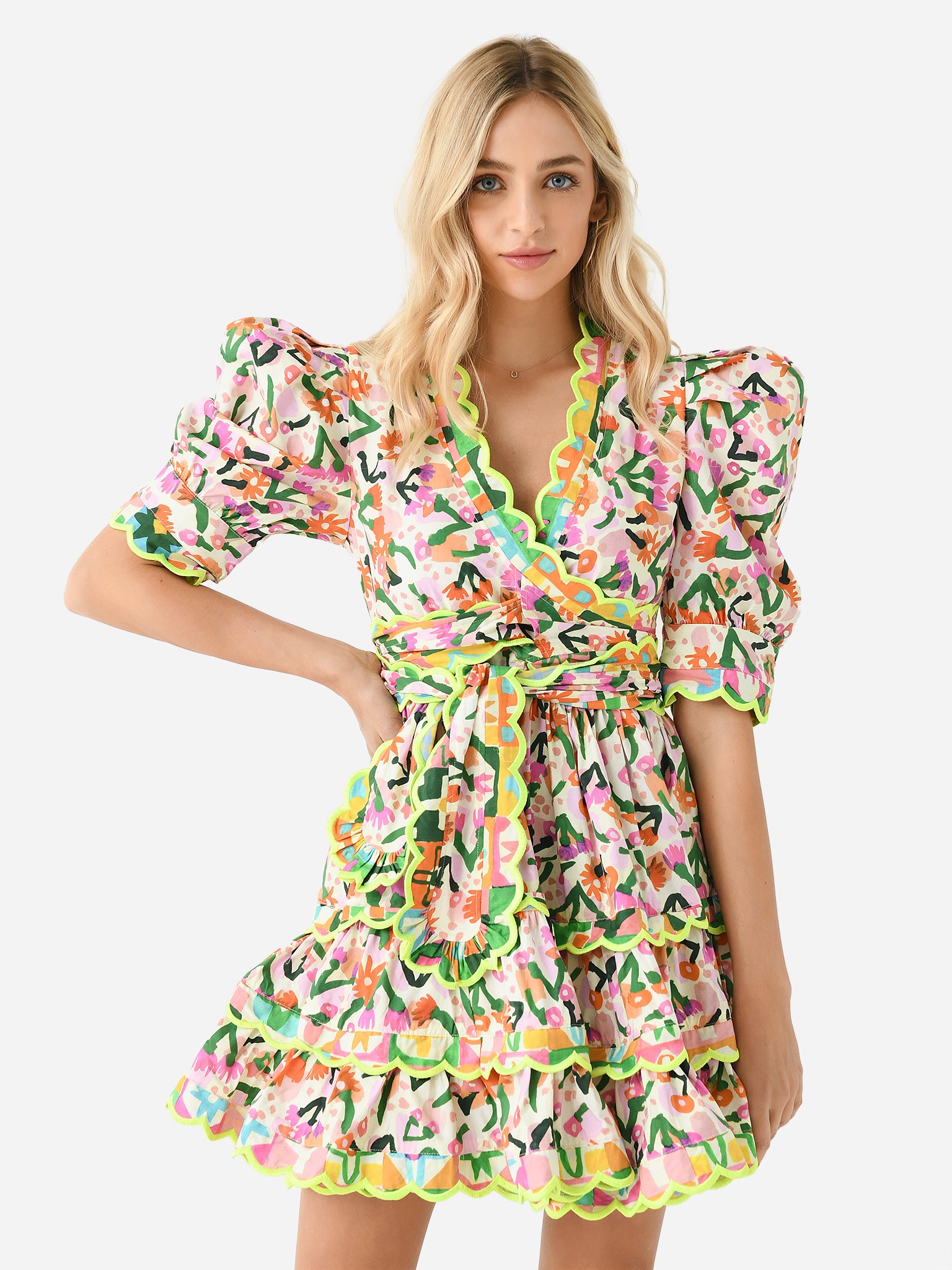 A colorful printed mini dress featuring puff sleeves, a self-tie belt, and scalloped edges.