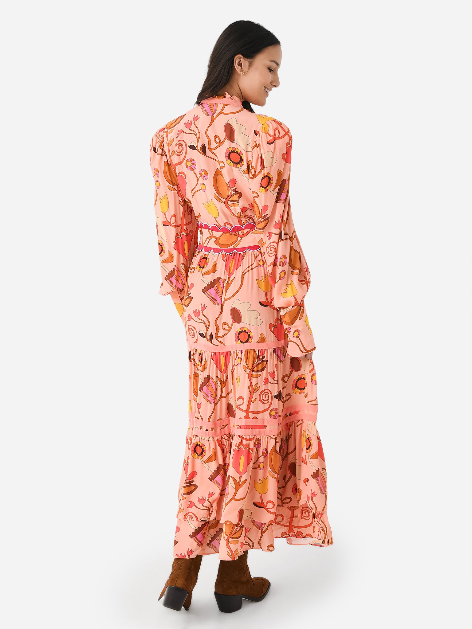 A multi-colored floral dress featuring puff sleeves, a covered button placket, and a mid-length flowy design.