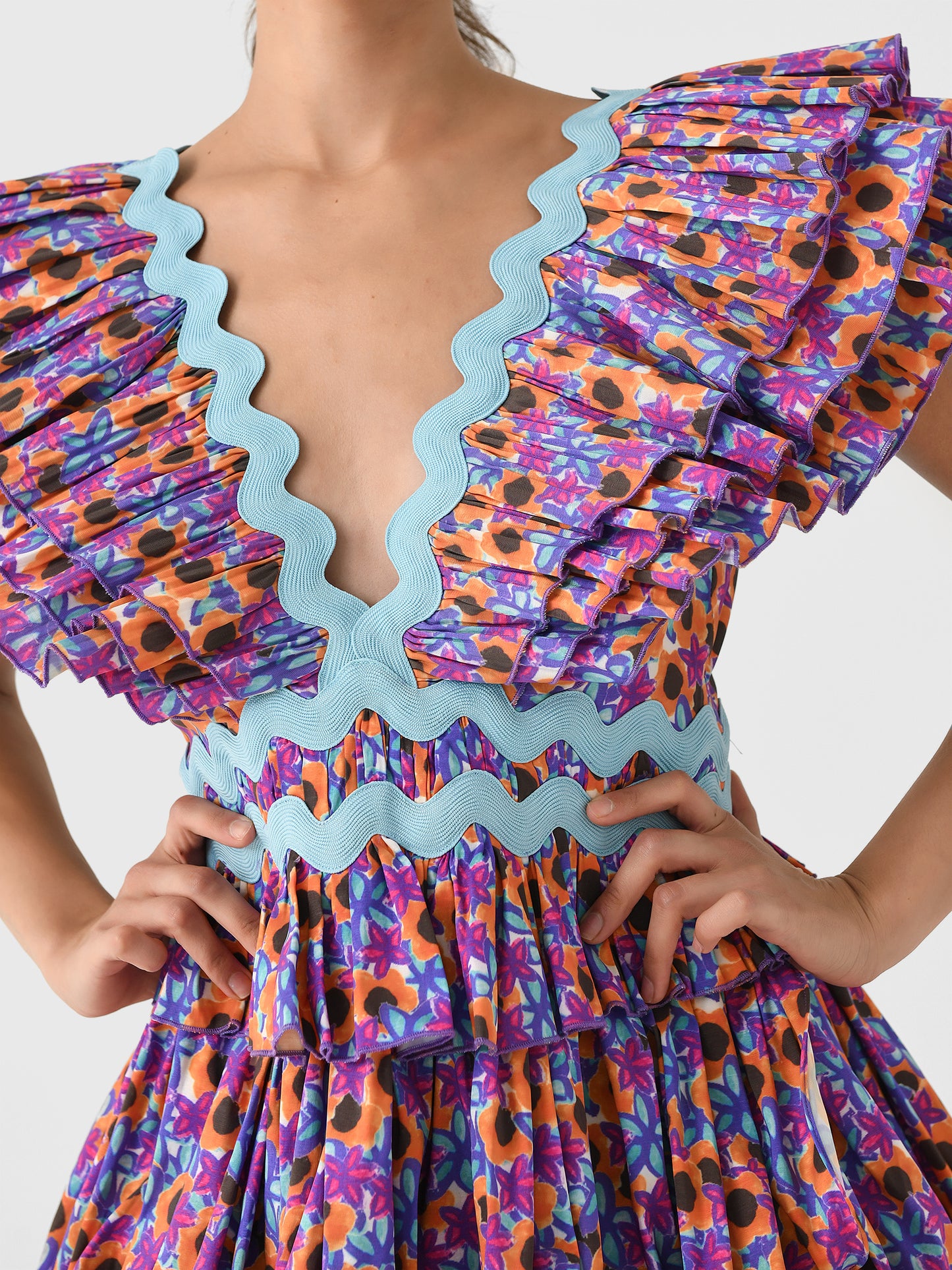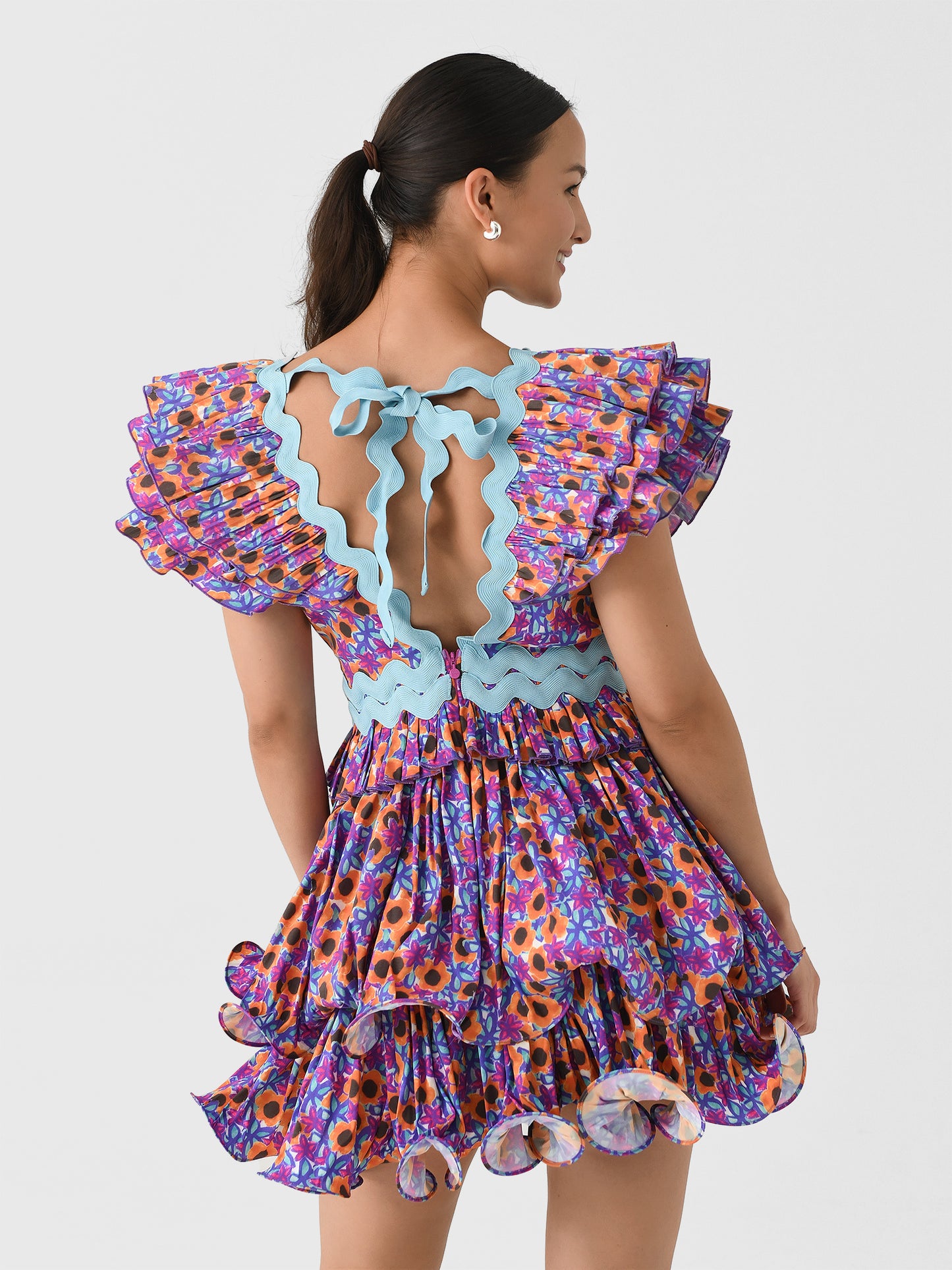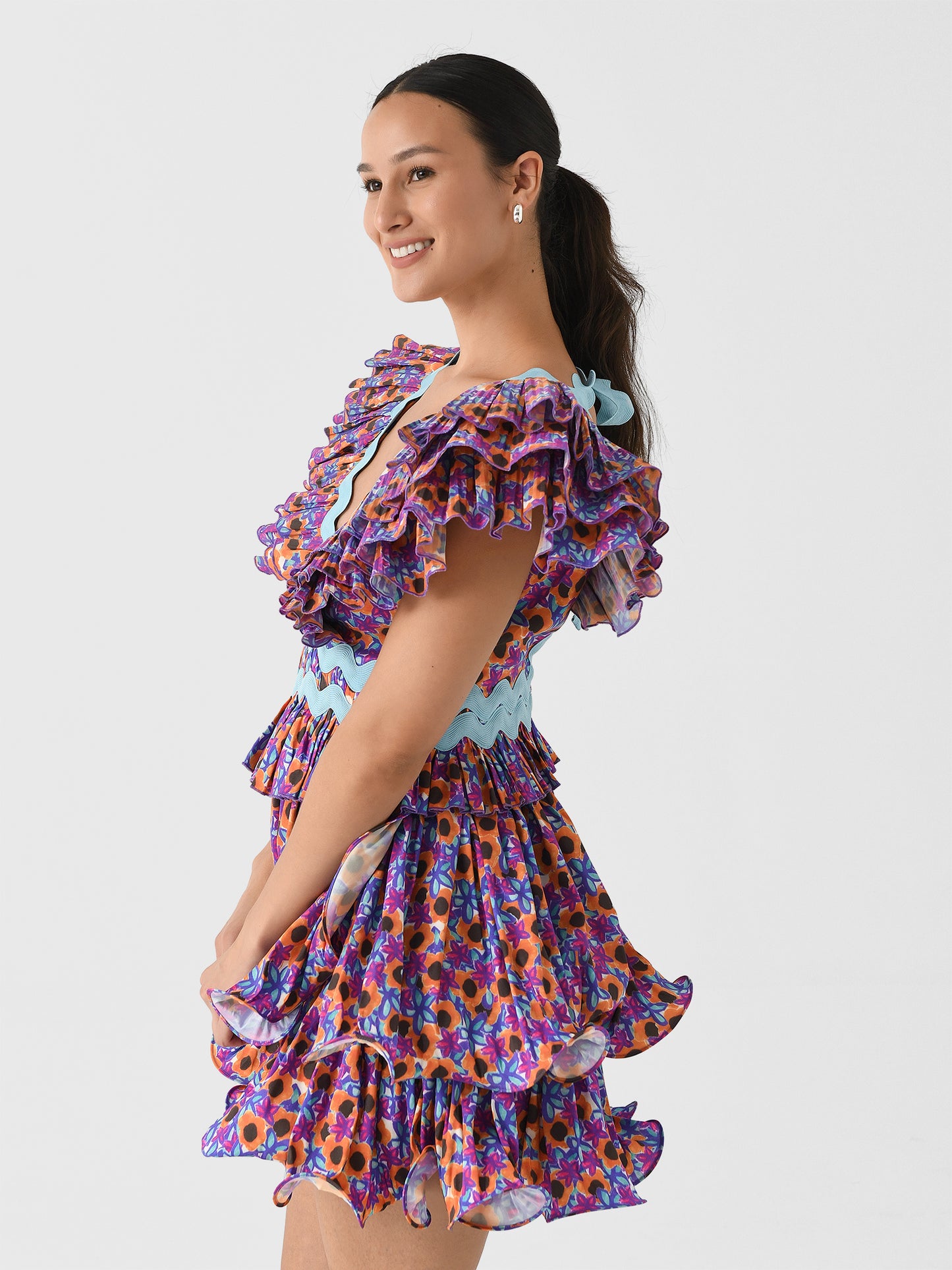 This stand-out dress features a pleated design with voluminous sleeves, a layered flounce skirt, contrasting ric-rac trims, and a colorful floral print.