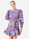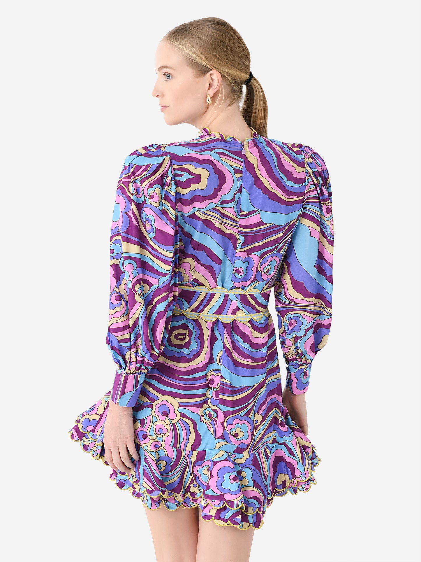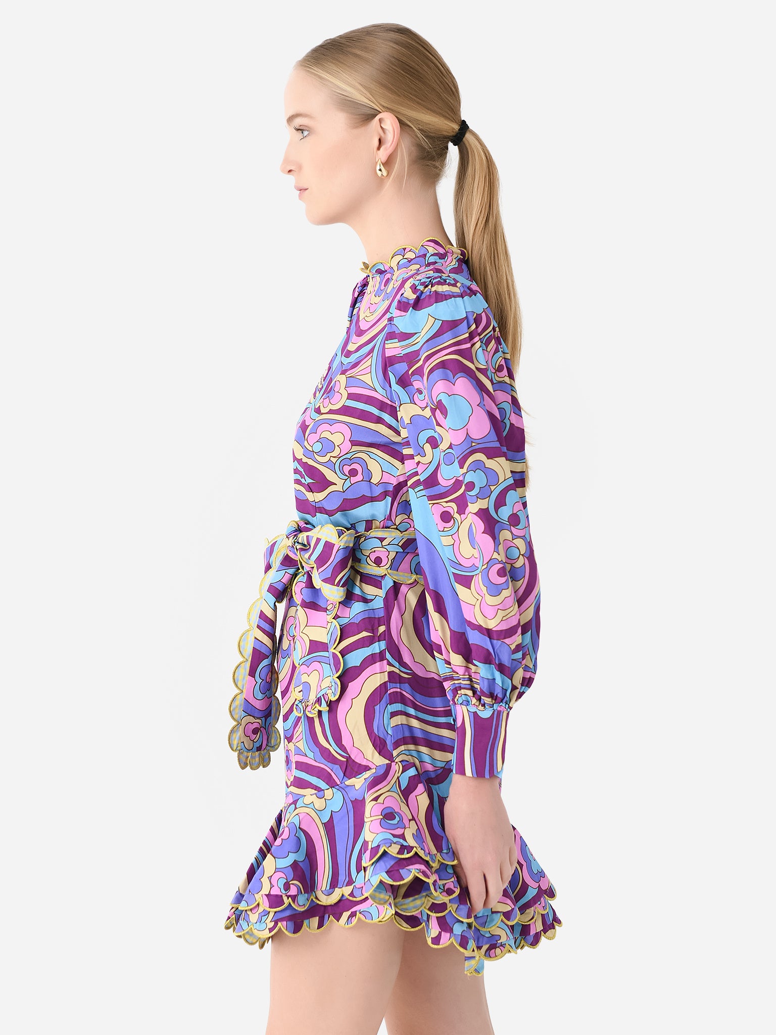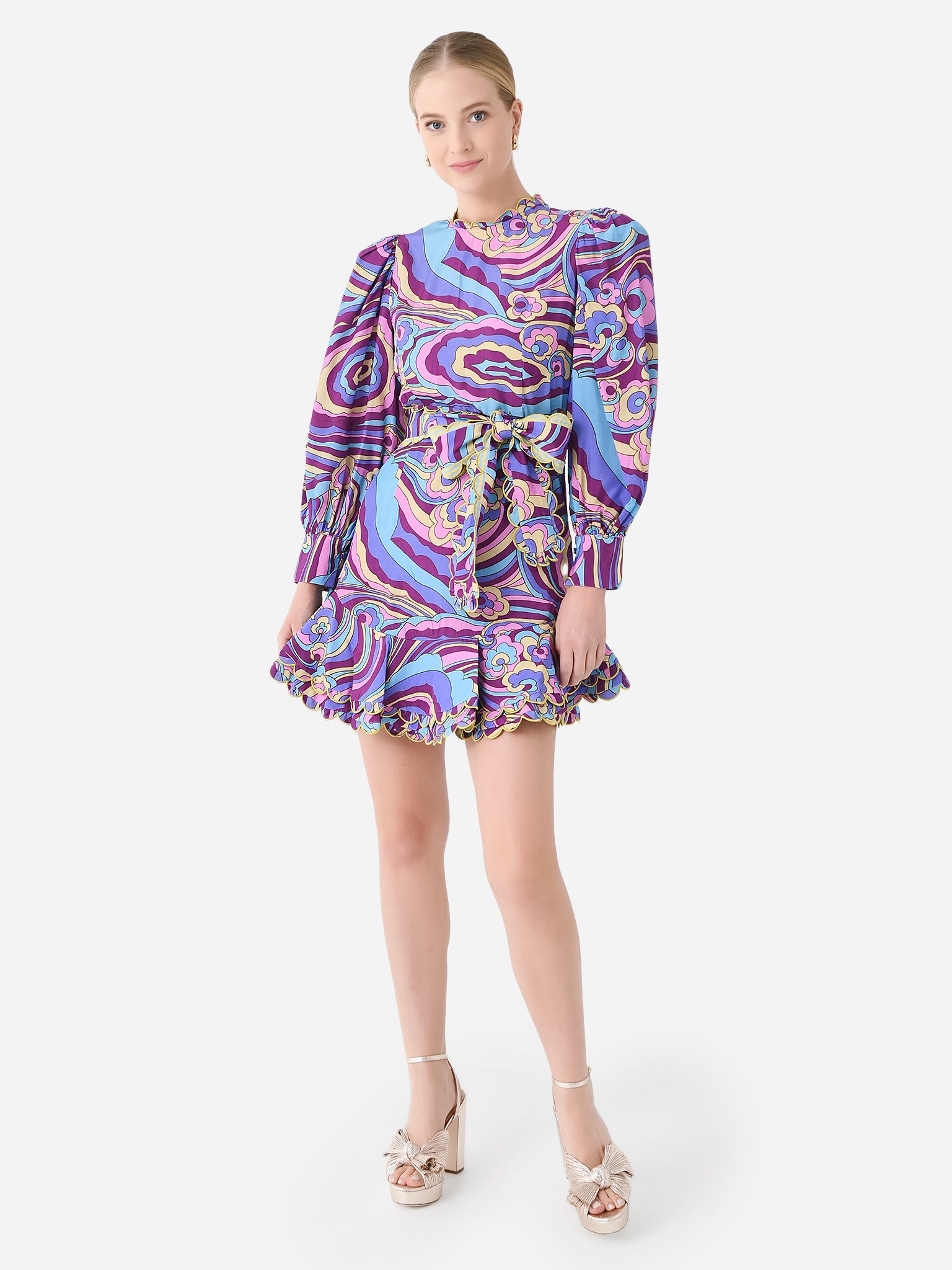 Puff sleeve mini dress featuring scalloped trim detailing and a bold print.