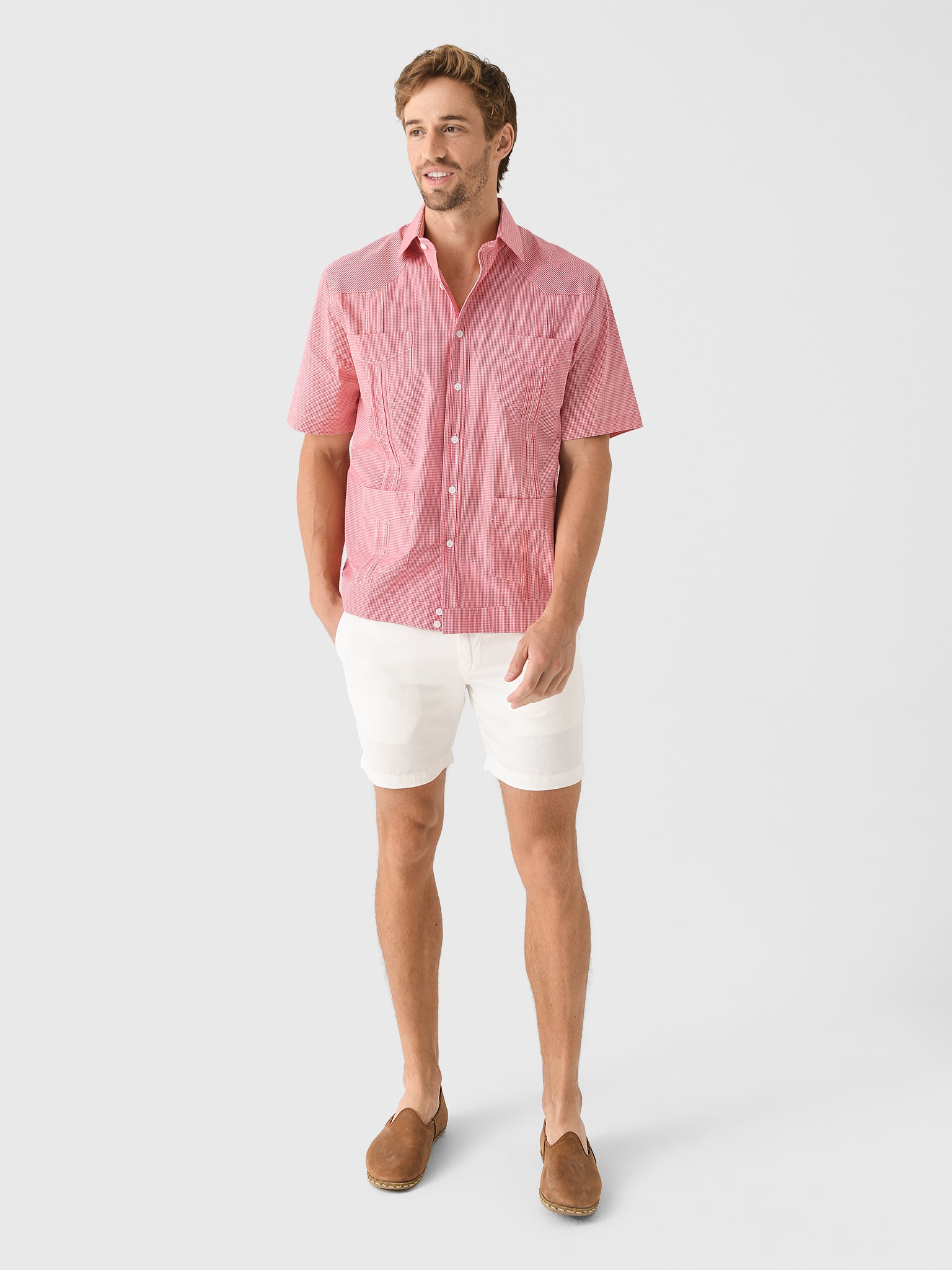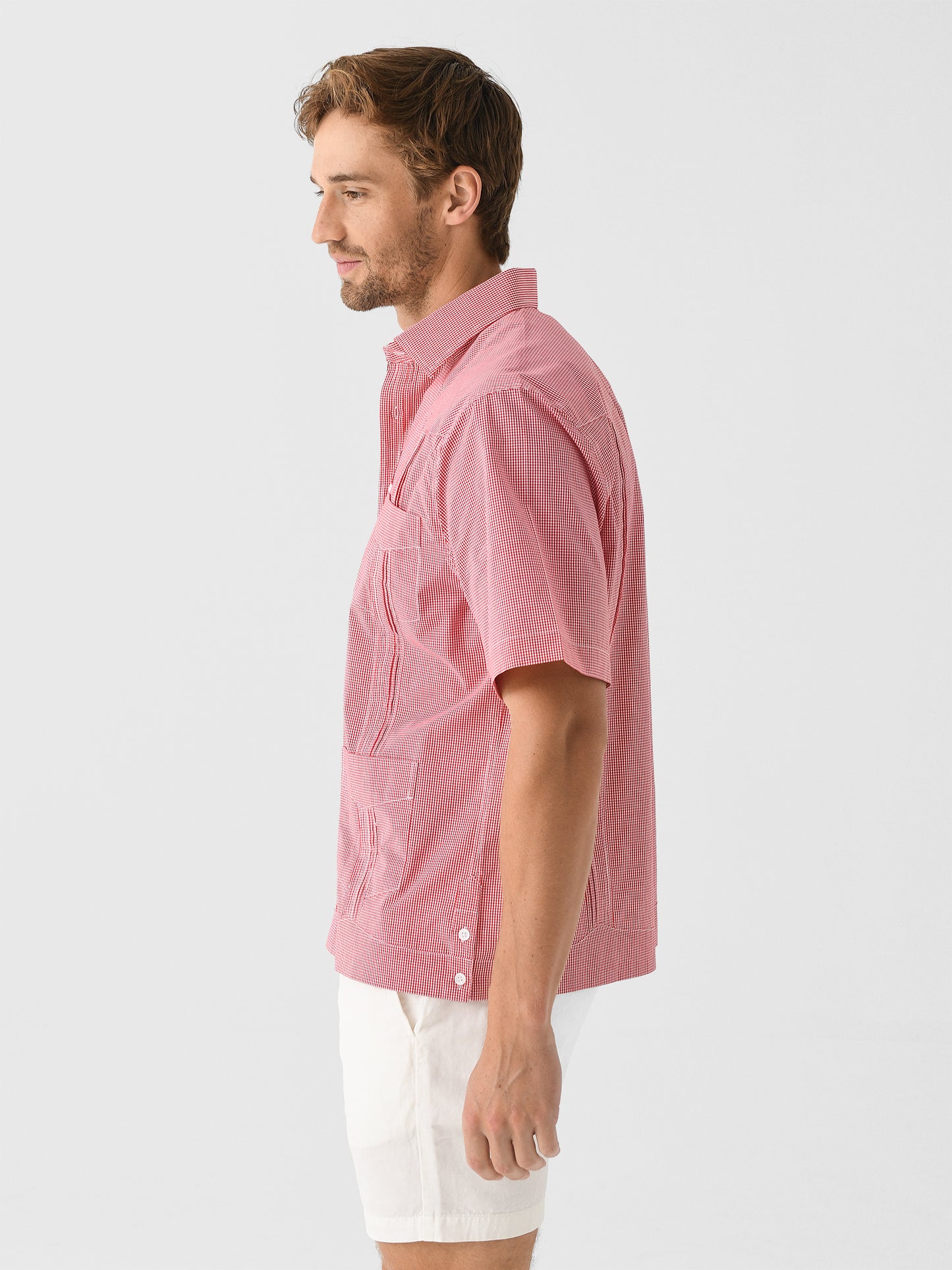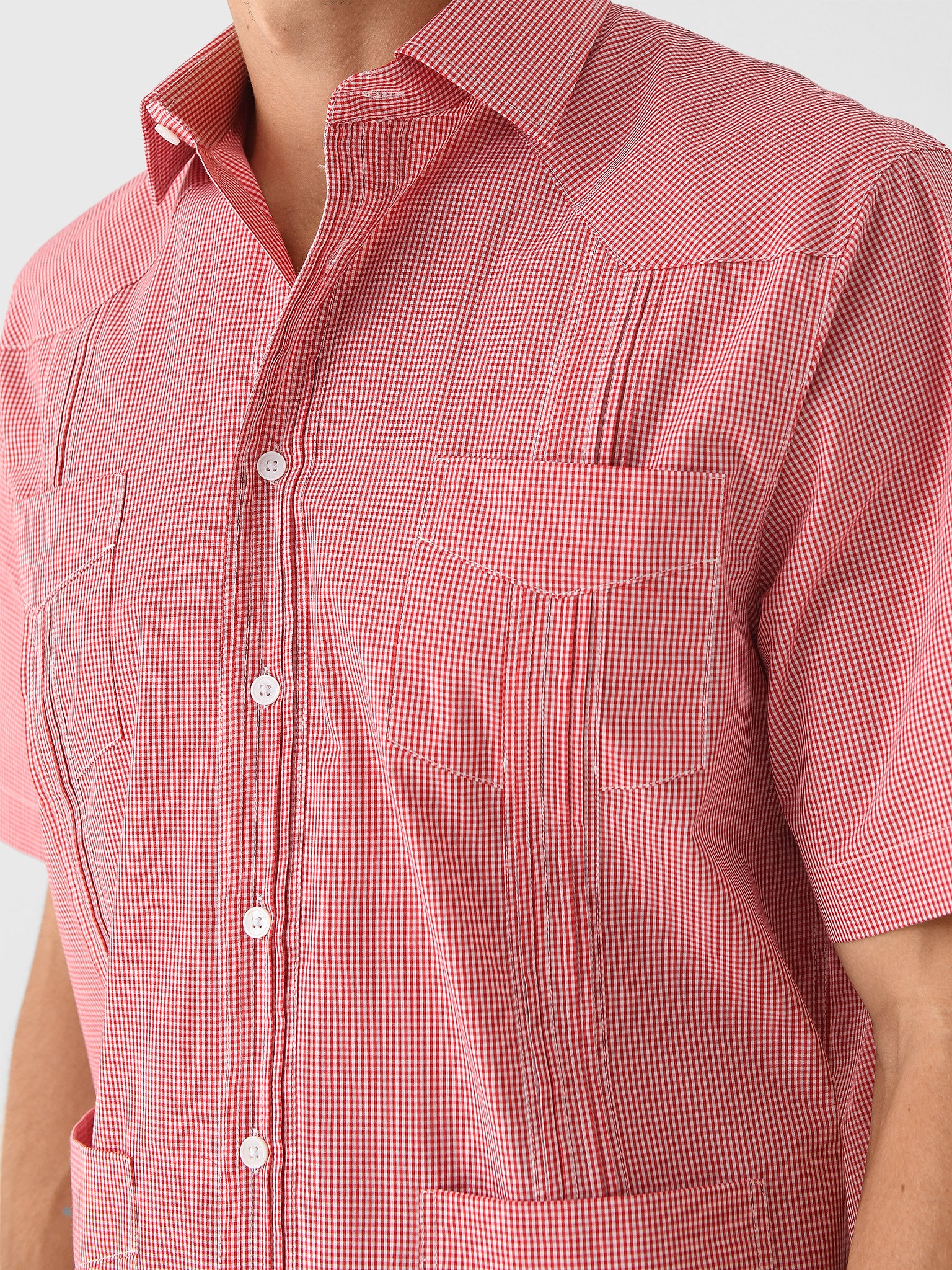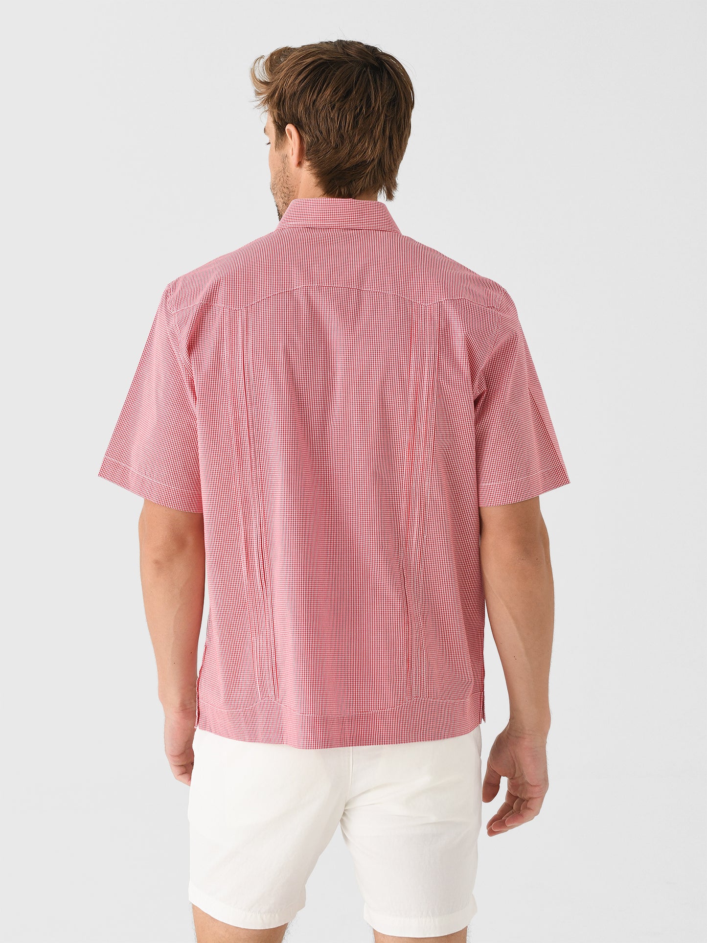 A comfortable button-down shirt made from lightweight cotton with guayabera details and a micro gingham print.