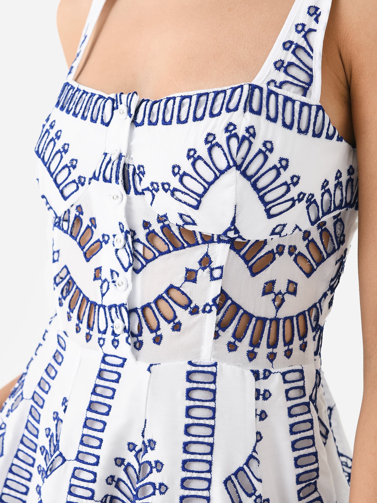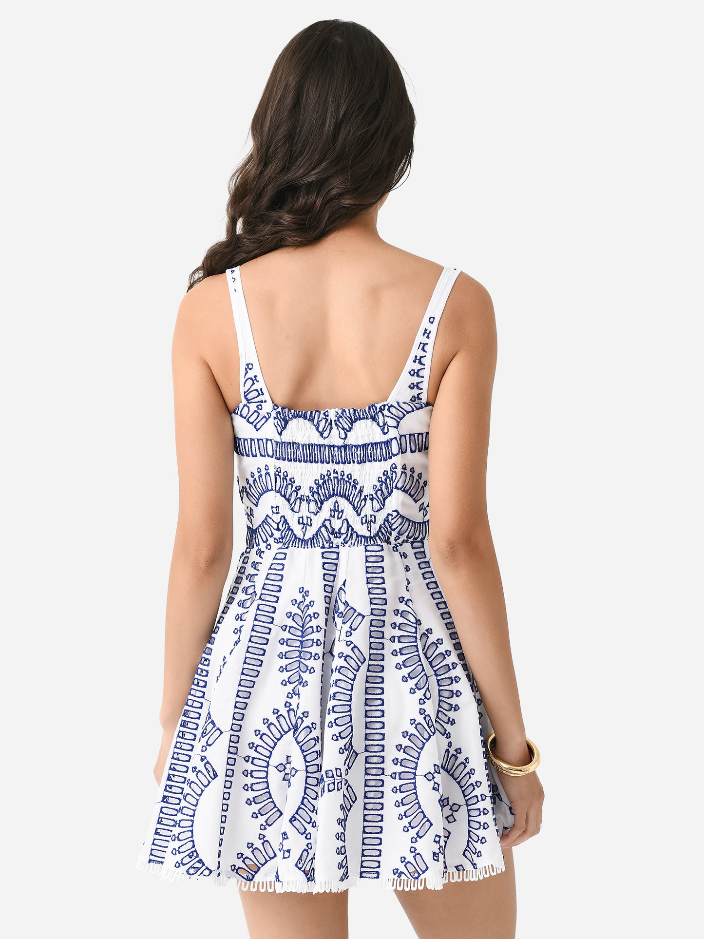 A flattering mini dress constructed from delicate embroidered fabric with a feminine flared skirt.
