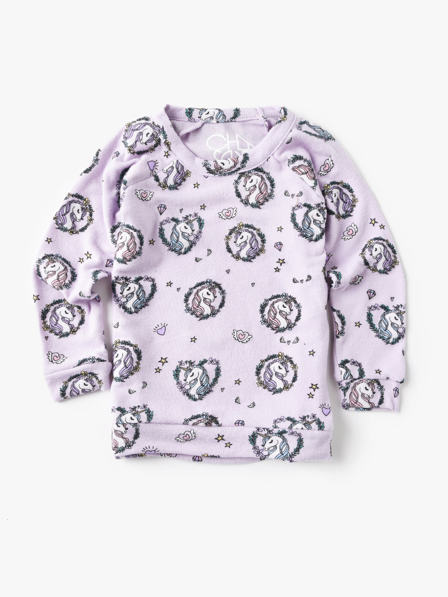 She'll be living her unicorn princess fantasy in the super-soft and cute Chaser Girls' Love Knit Raglan Pullover Sweater.