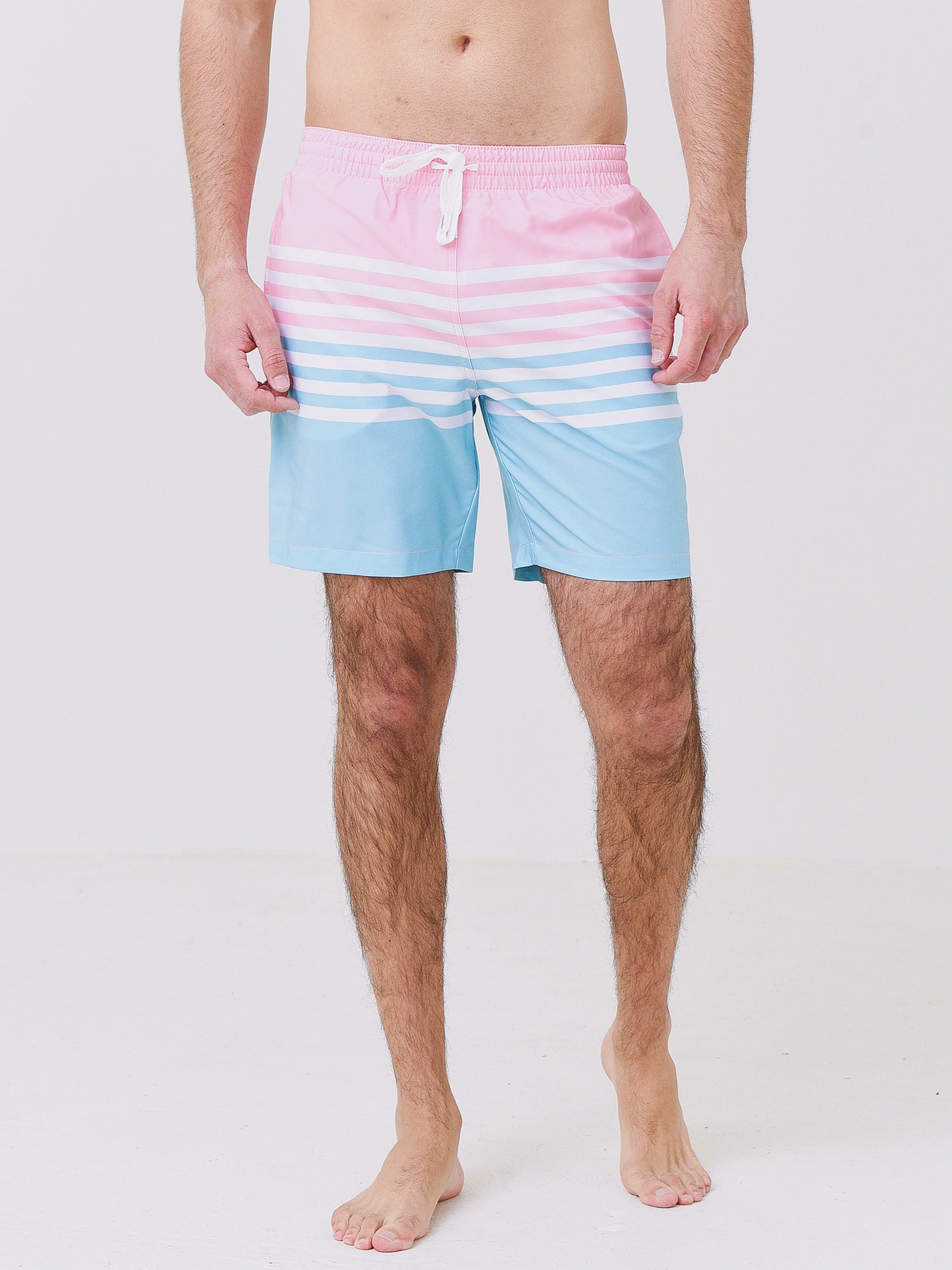 Novelty-printed swim trunk with an elastic waistband, stretch mesh liner, and moisture-wicking technology.