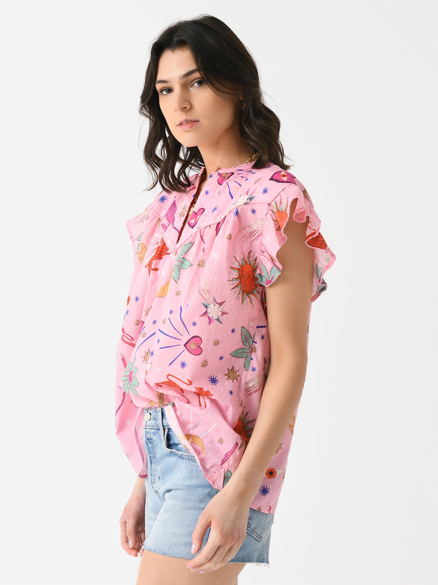 A loose, flowing blouse made from cotton Swiss dot fabric with a custom print.