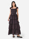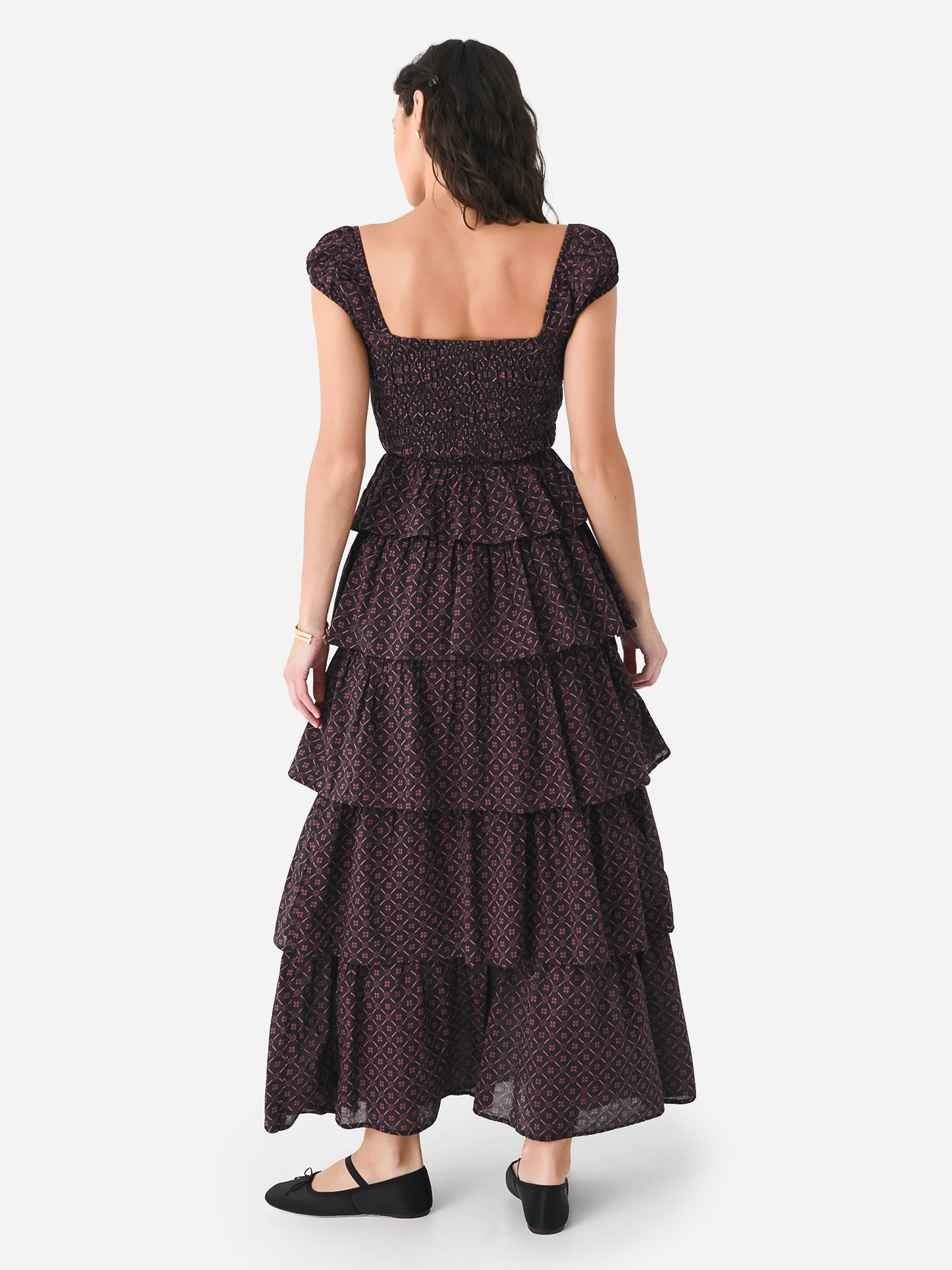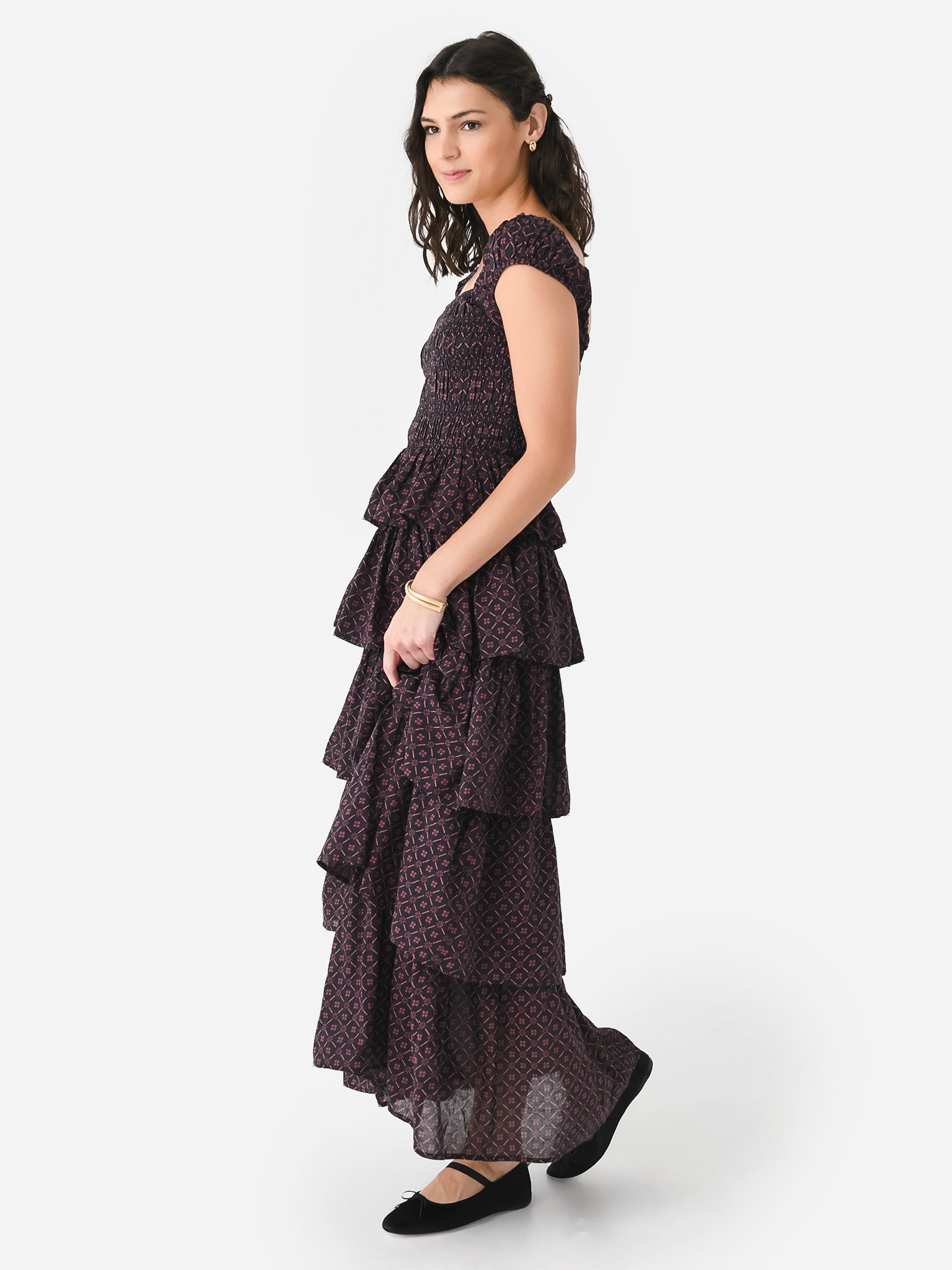 Cotton voile cap-sleeve maxi dress with a smocked bodice and tiered skirt.