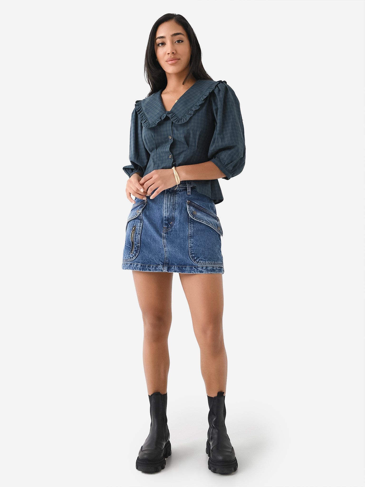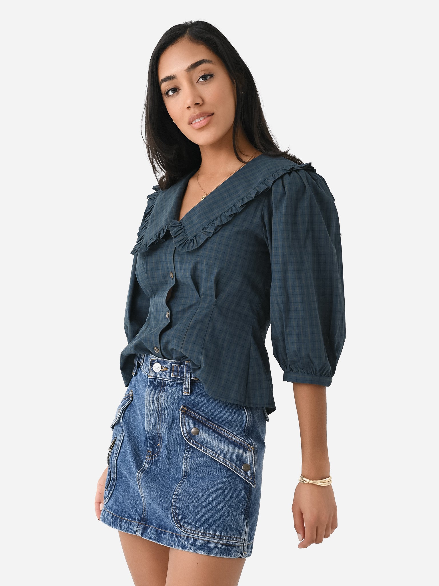 A plaid top featuring an exaggerated collar, three-quarter length sleeves, and a slight peplum hem.