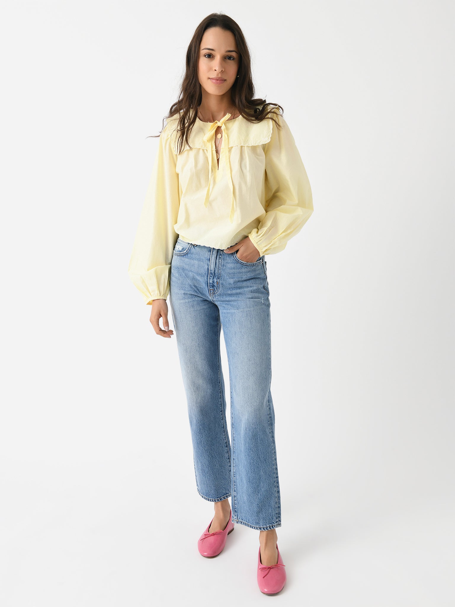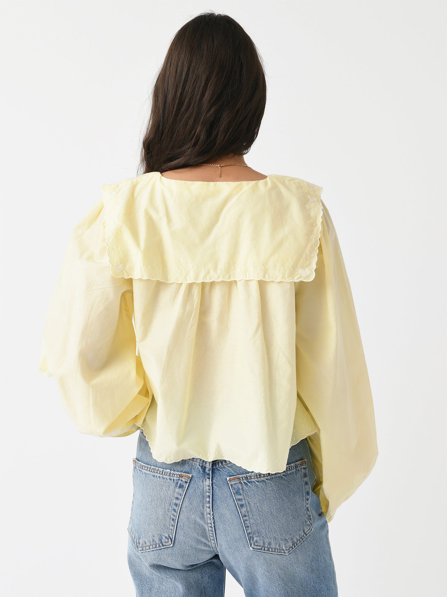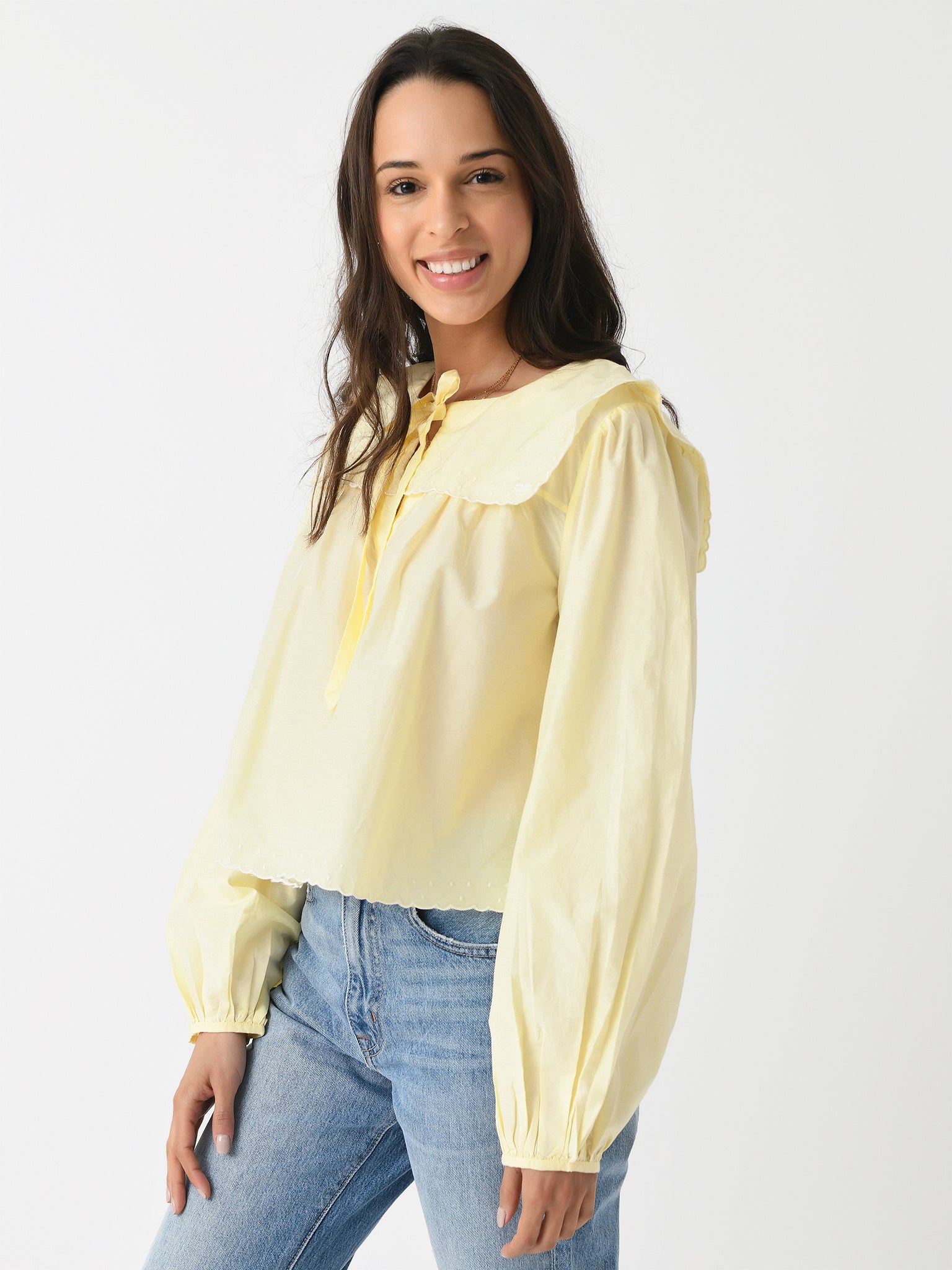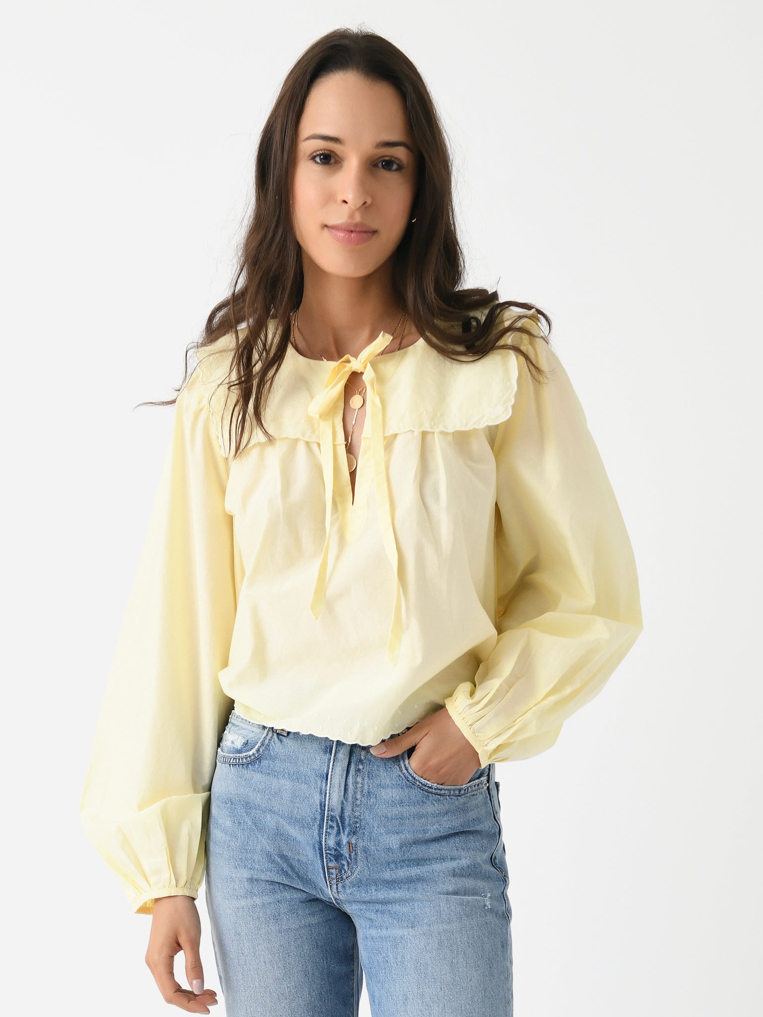 A cotton-silk blouse with a bib overlay, scalloped trims, and long, billowy sleeves.