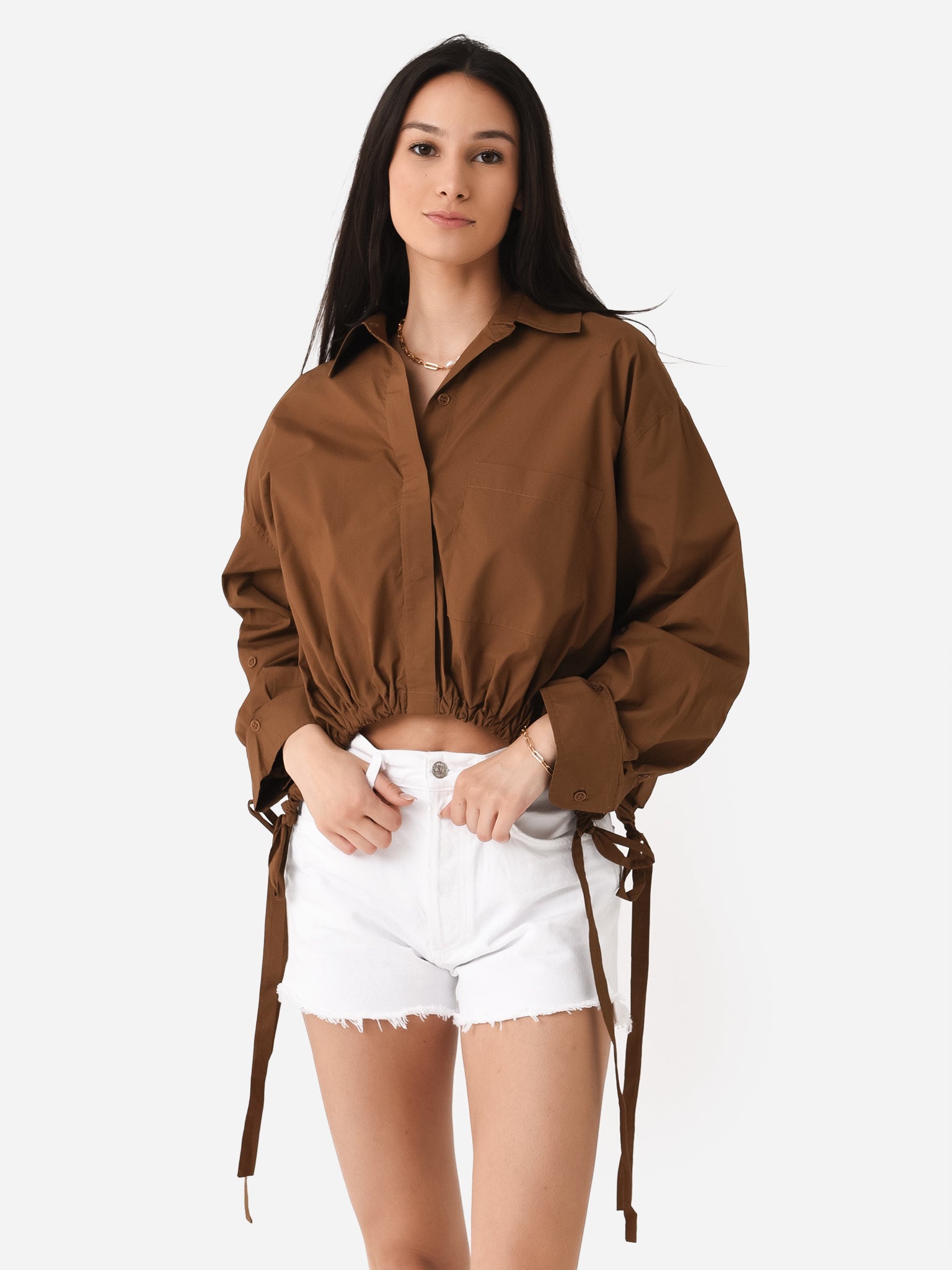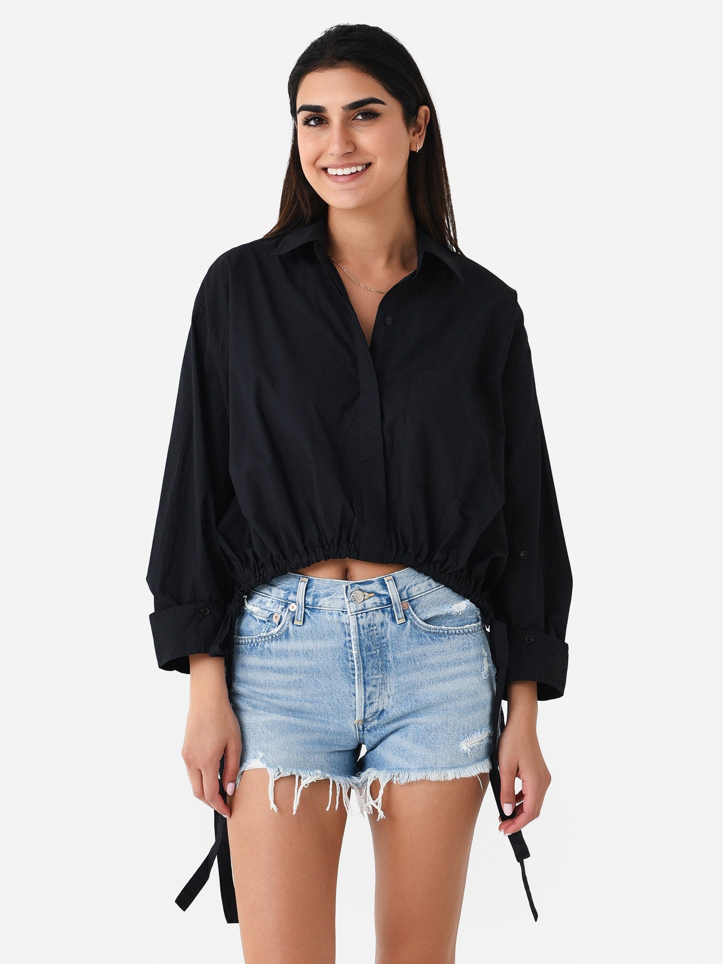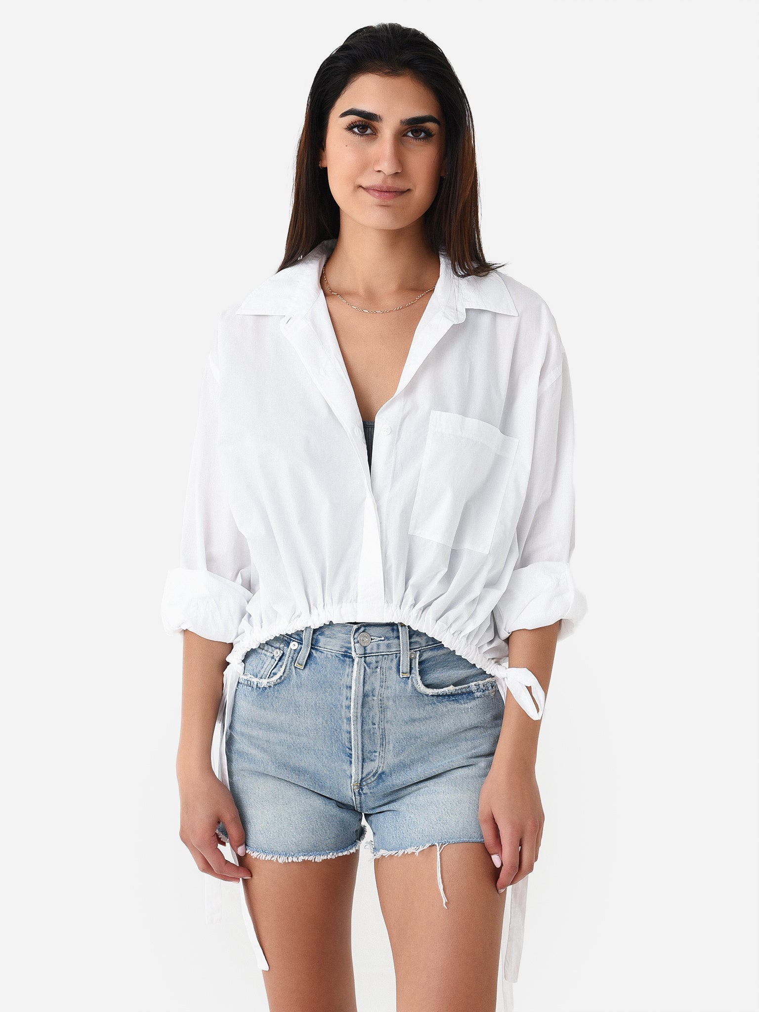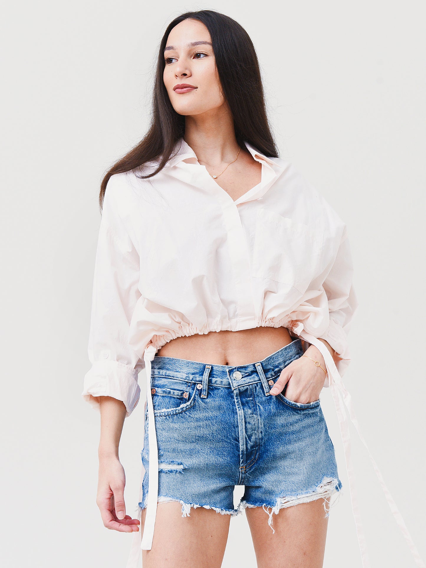 Cropped button-down shirt with a unique cinched waist.