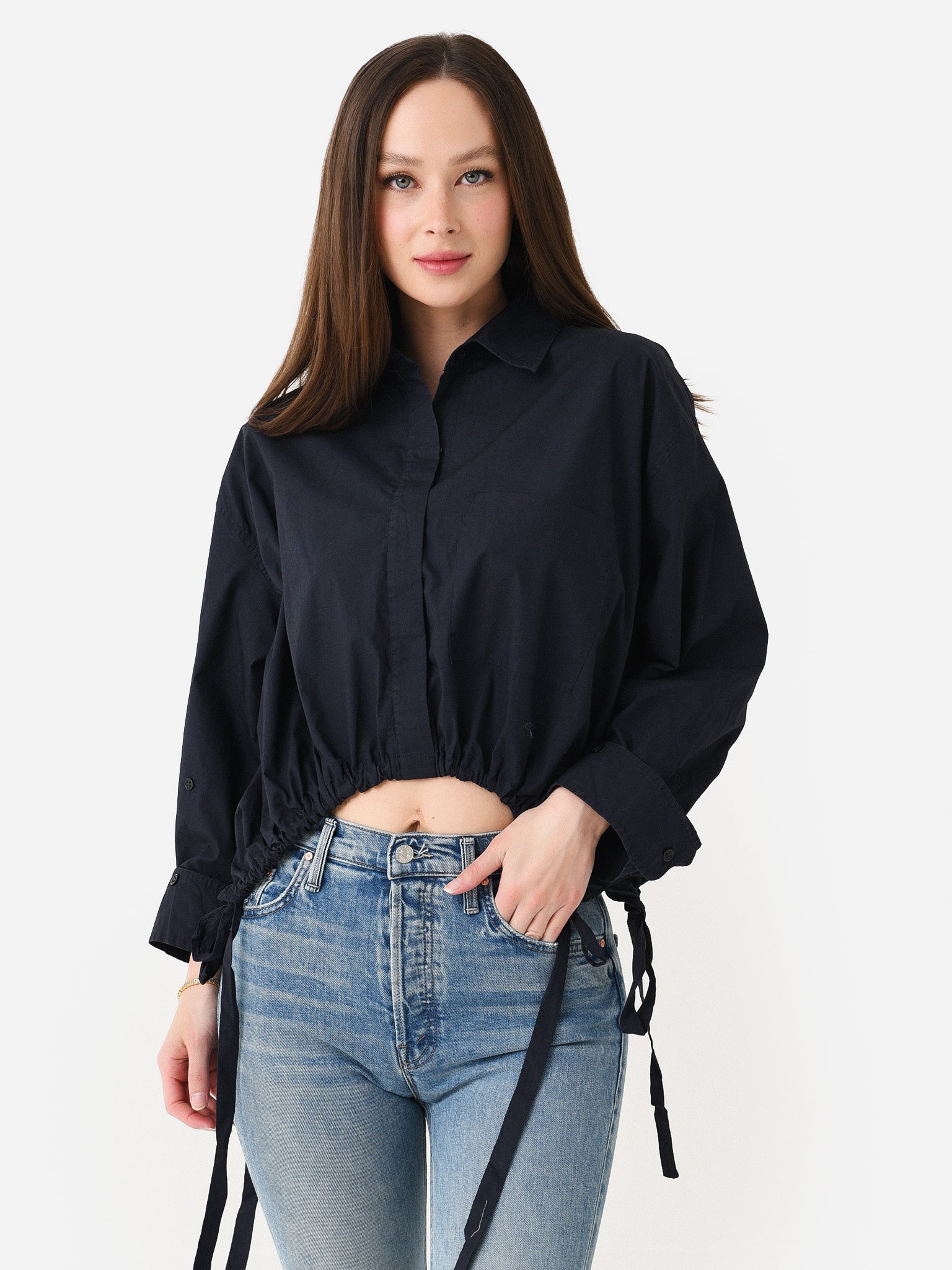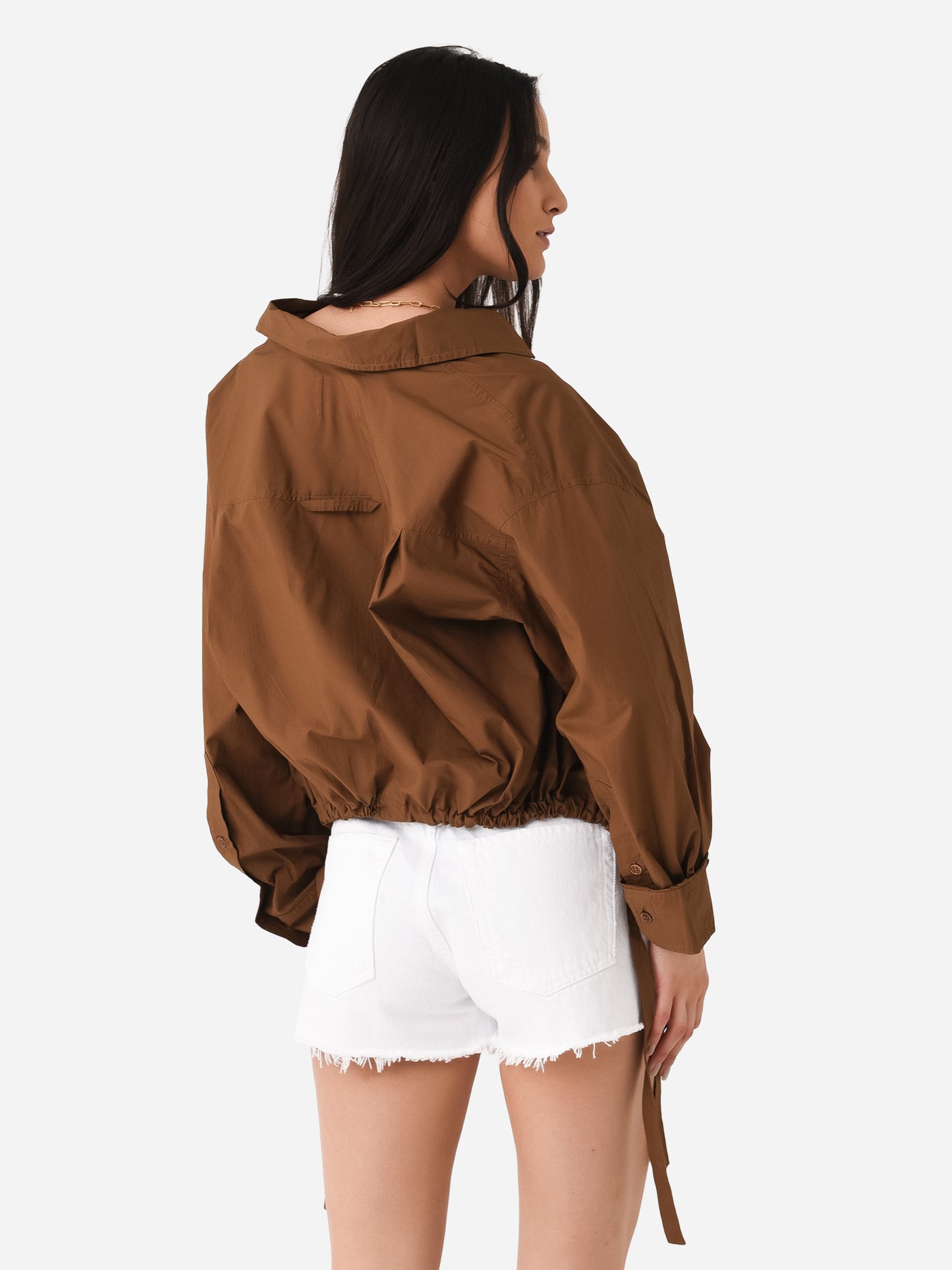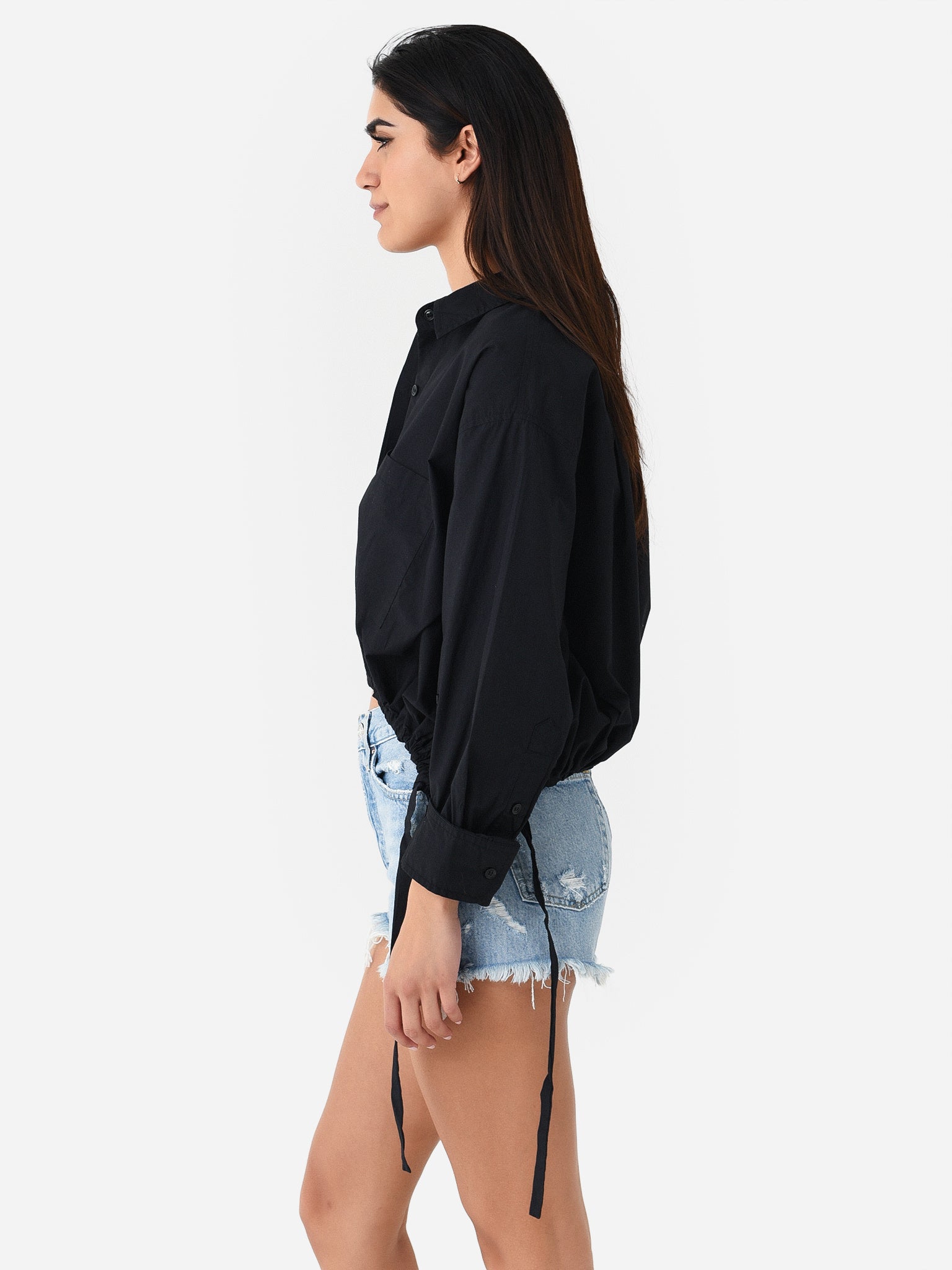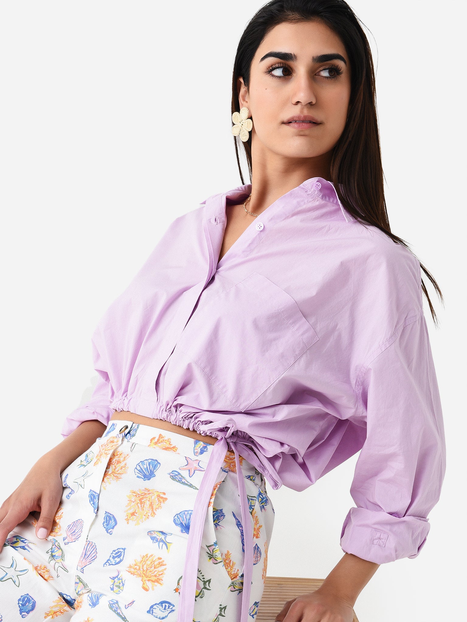 Cropped button-down shirt with a unique cinched waist.