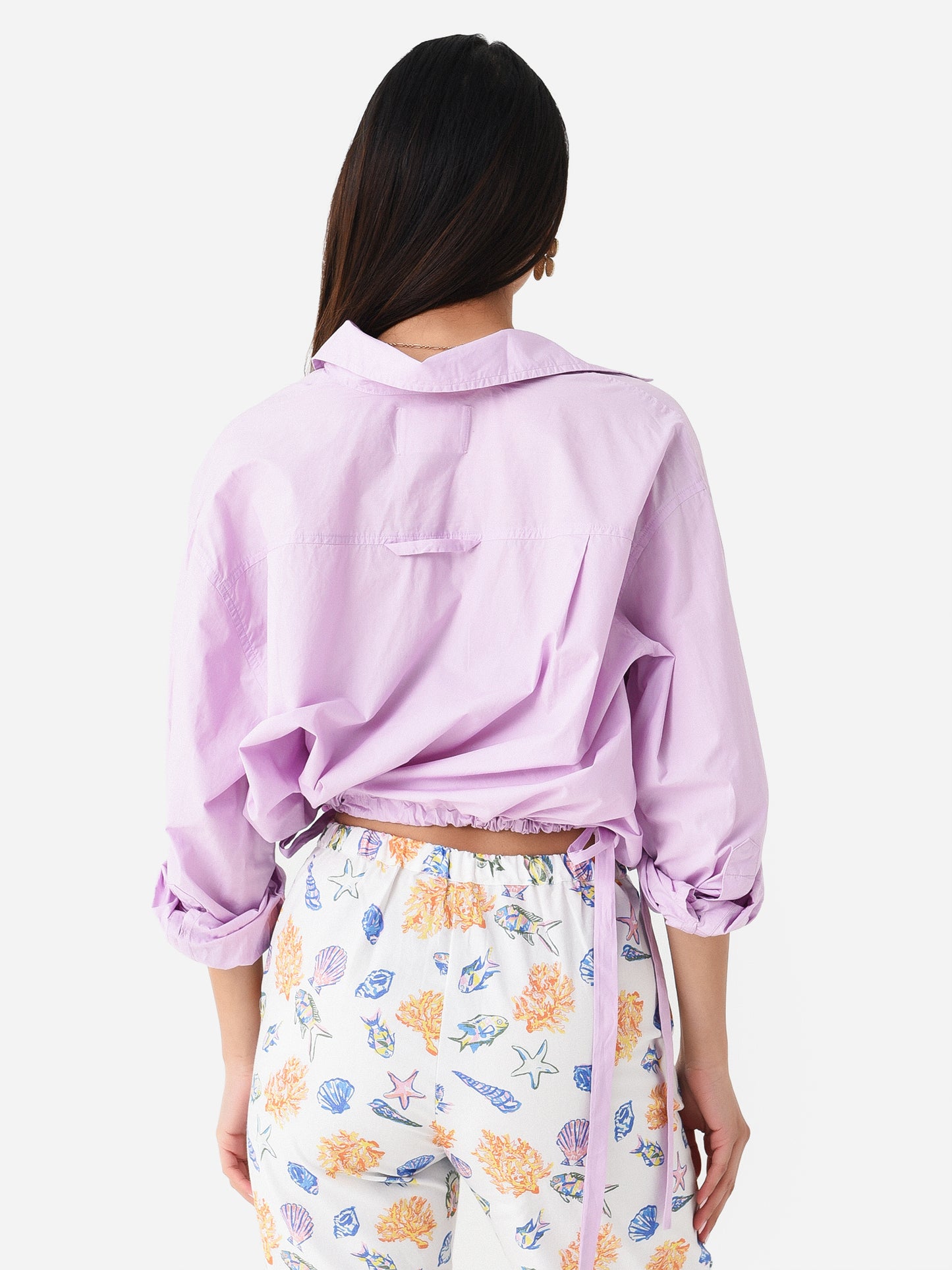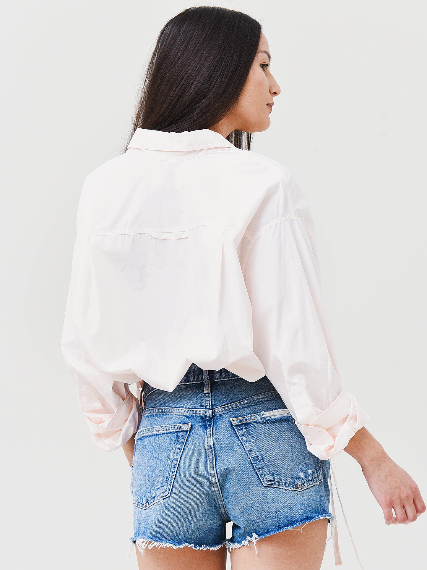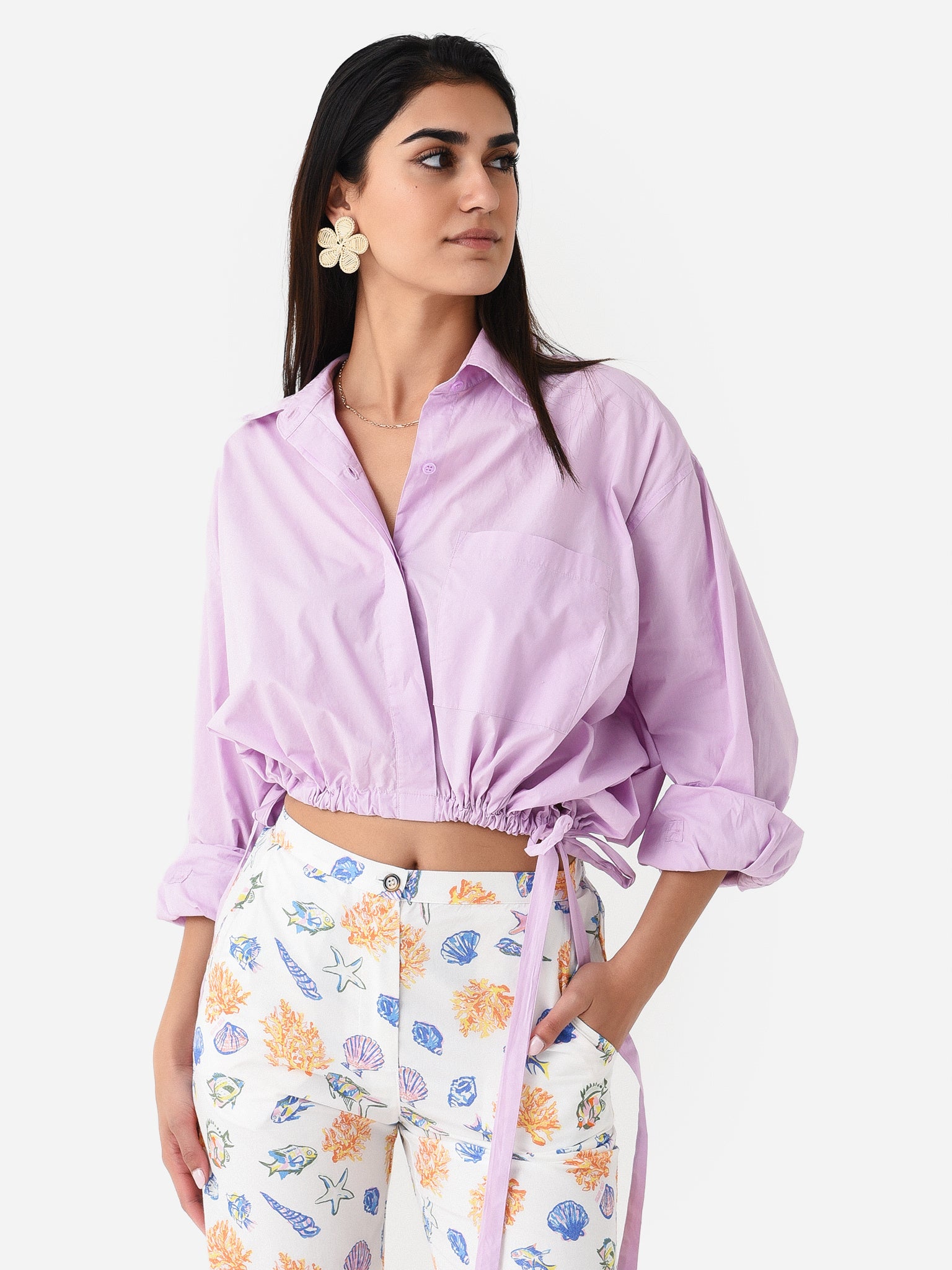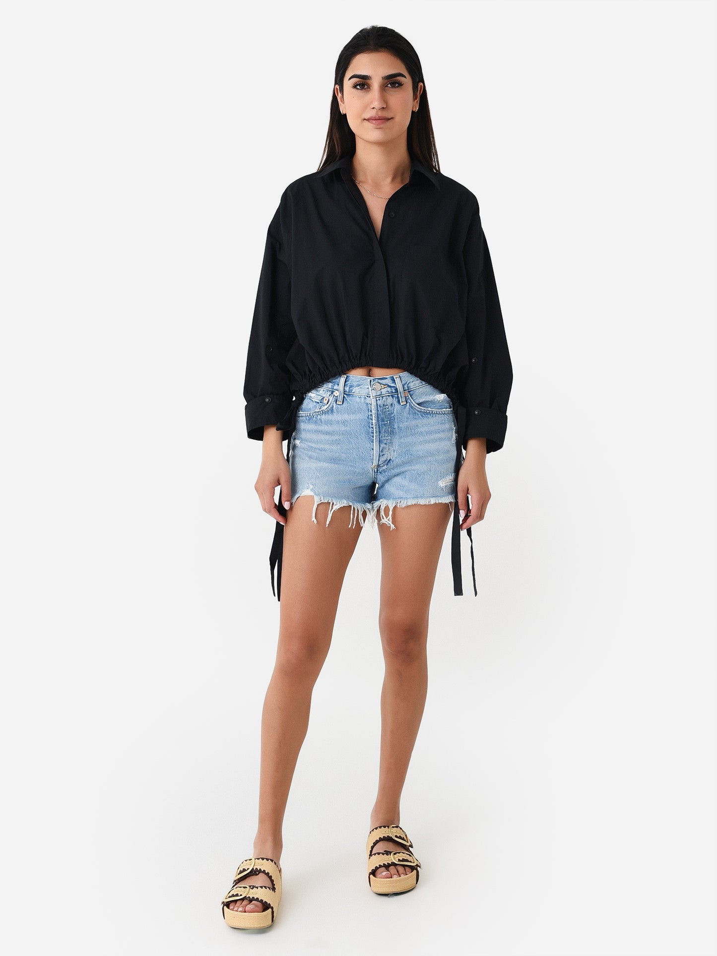 Cropped button-down shirt with a unique cinched waist.