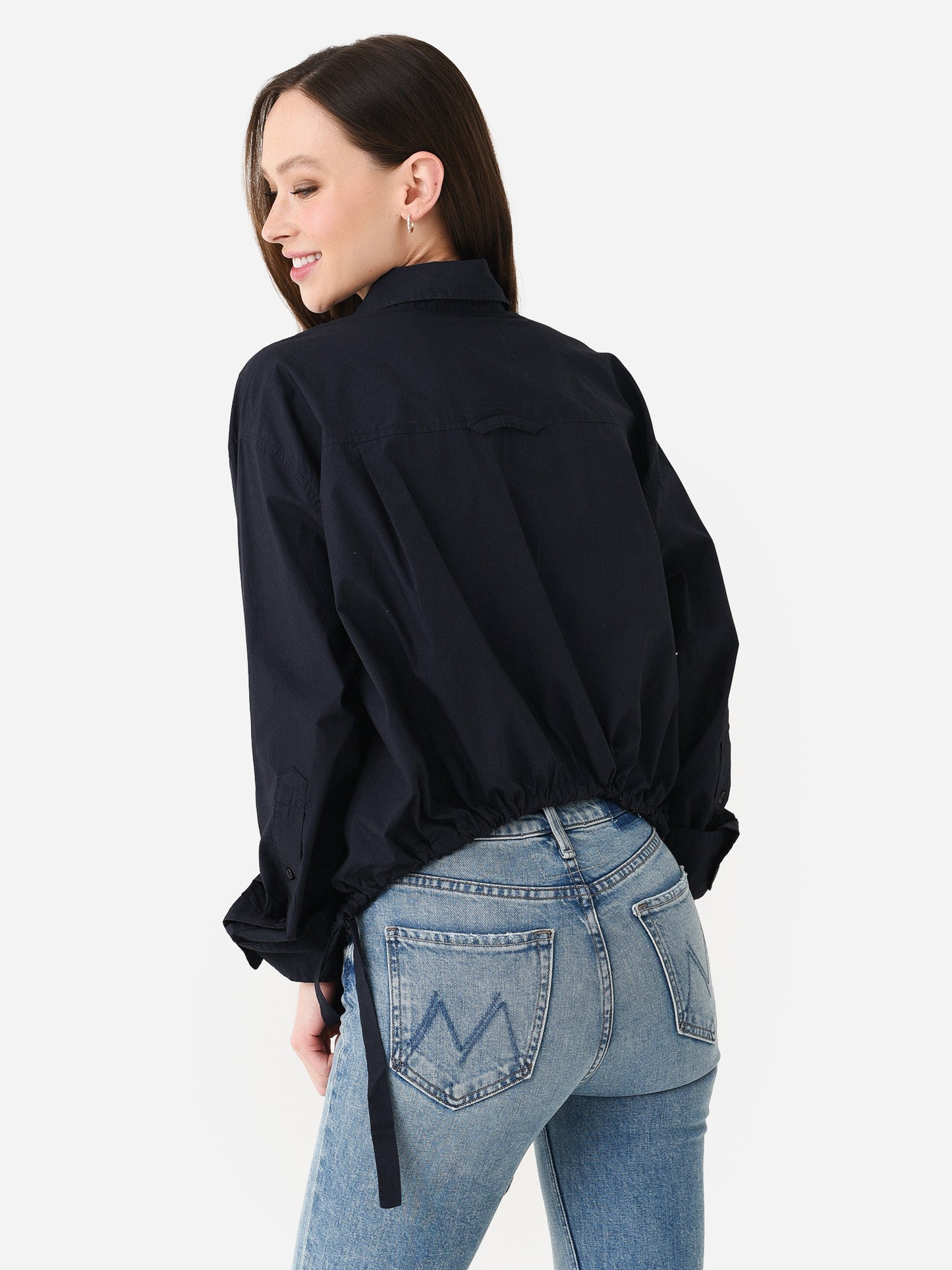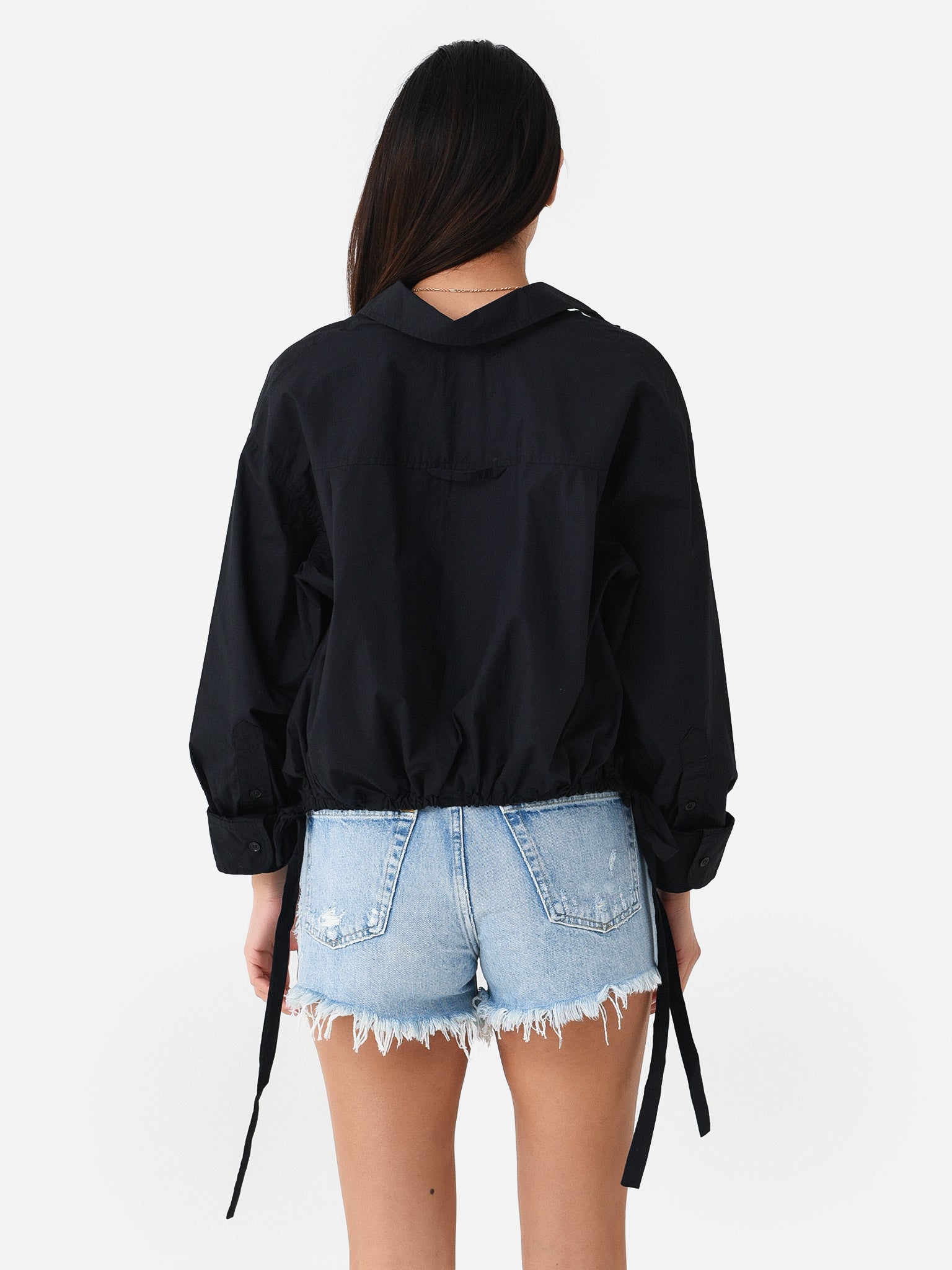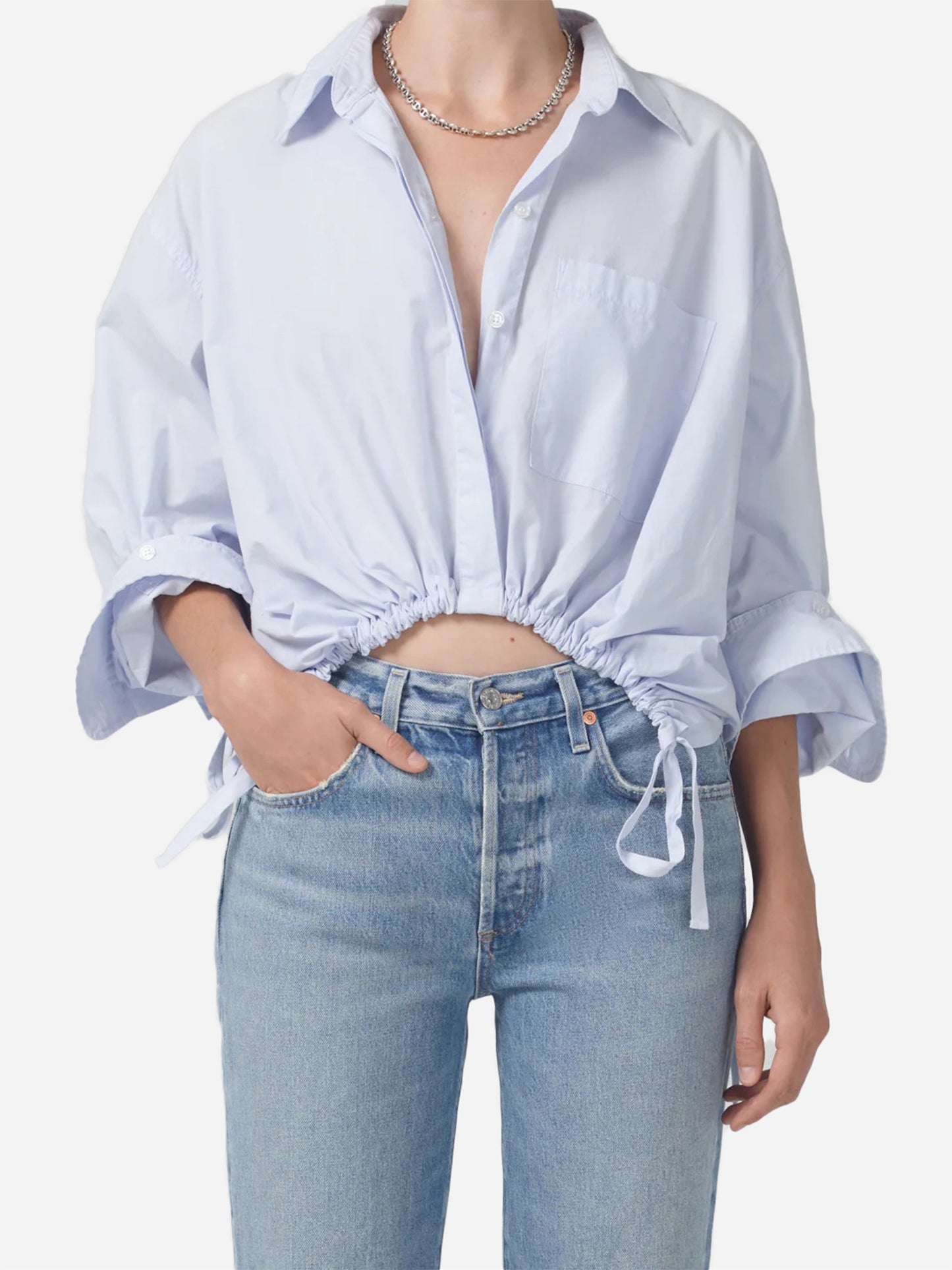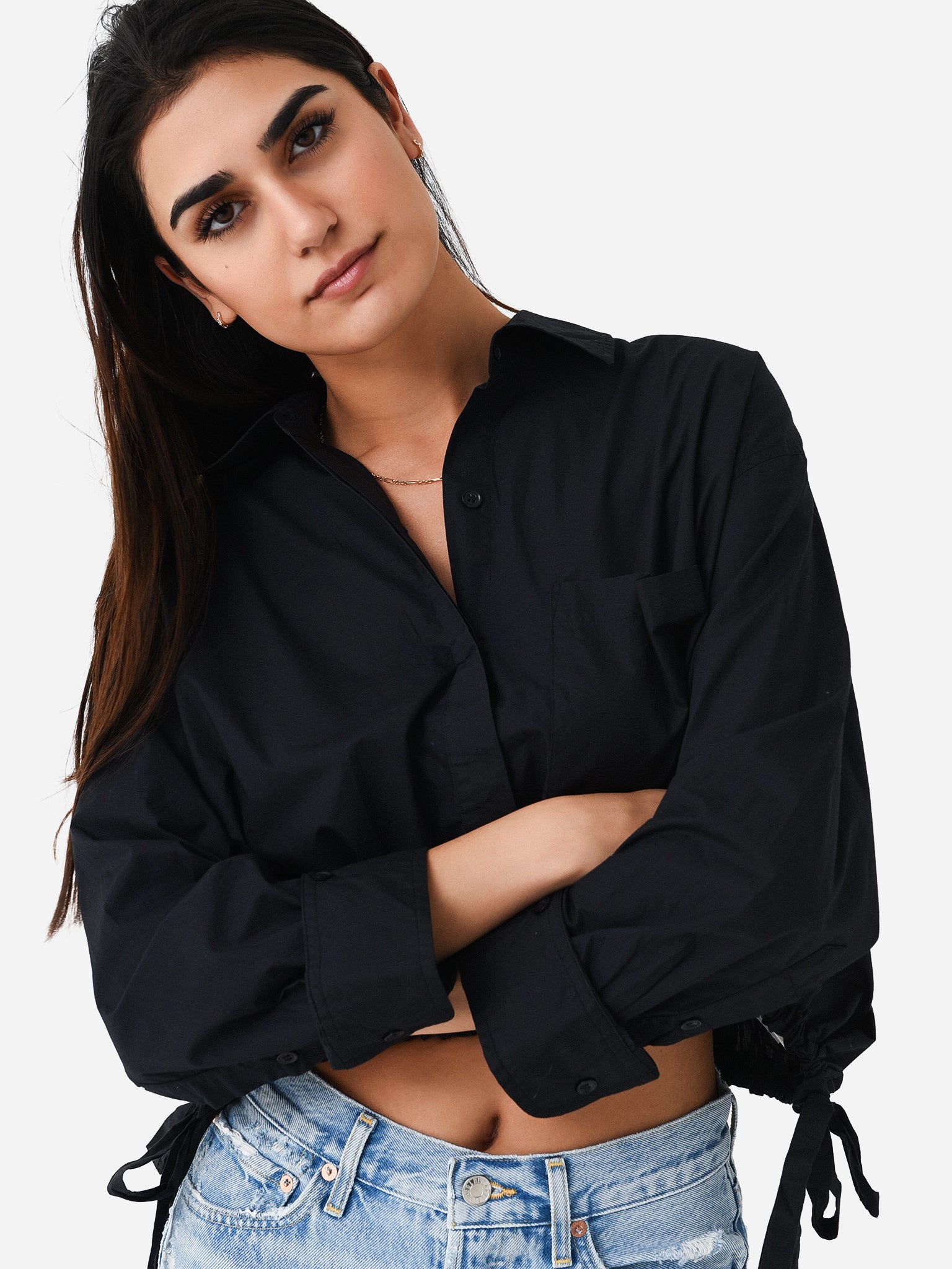 Cropped button-down shirt with a unique cinched waist.