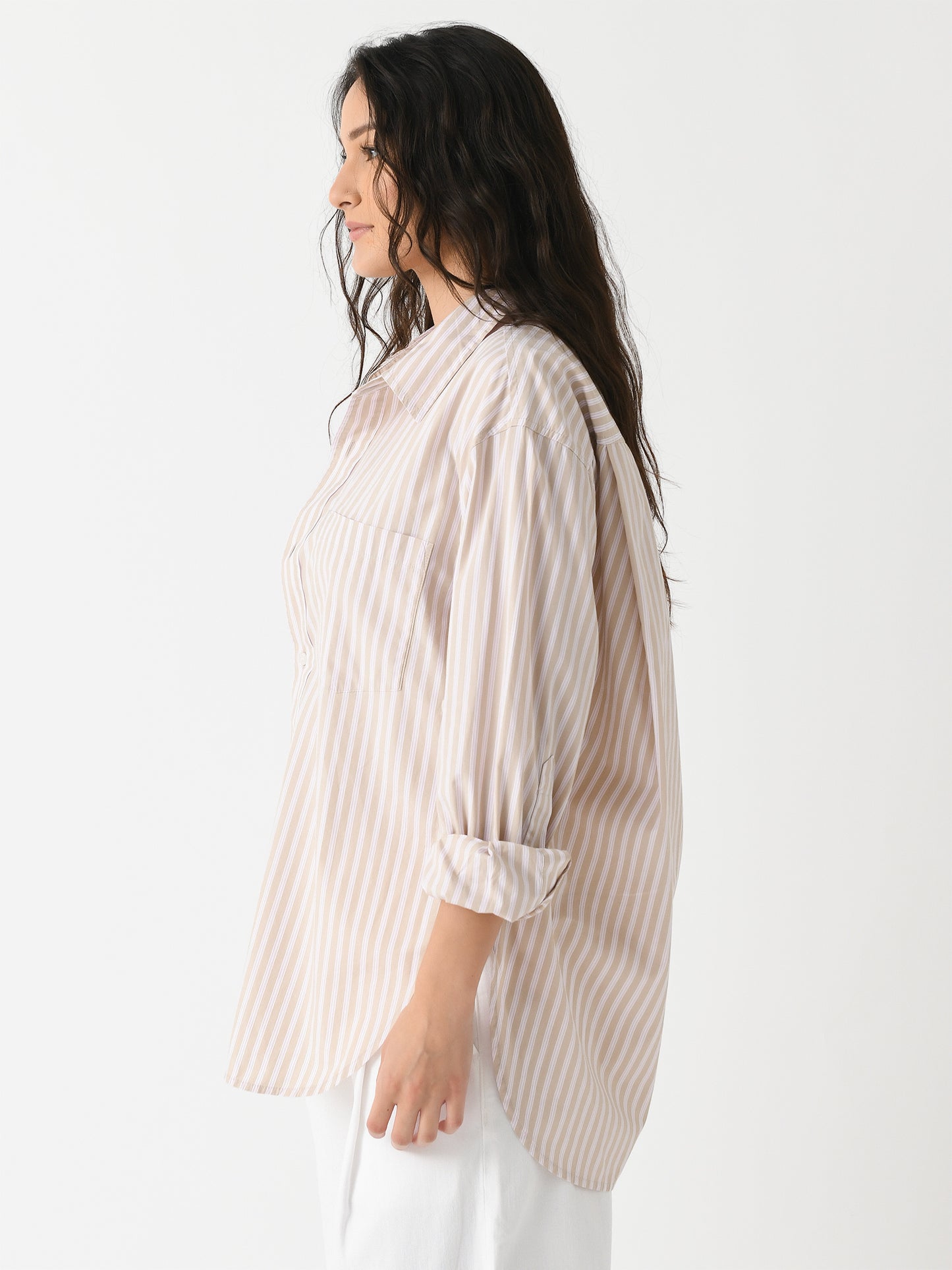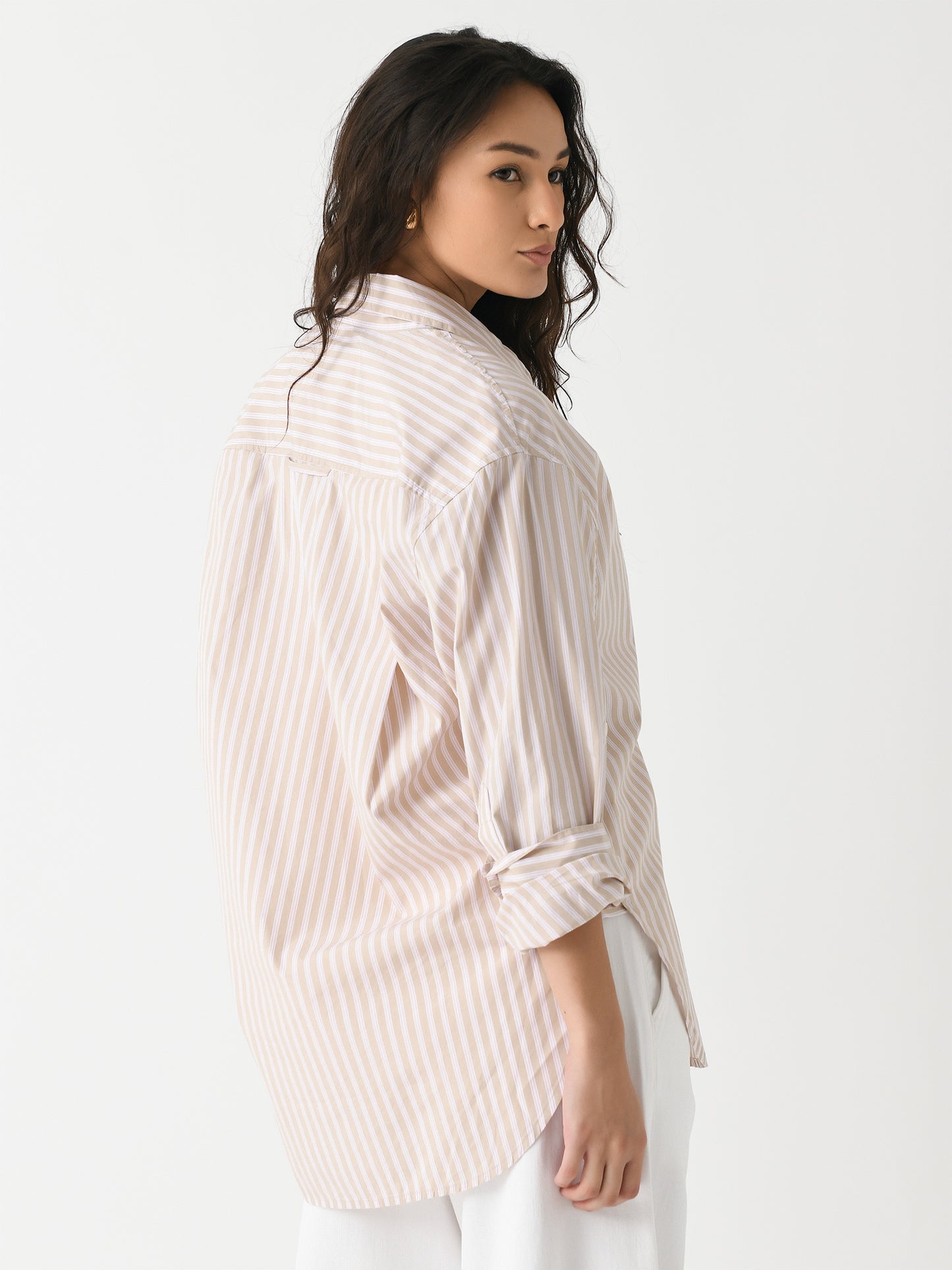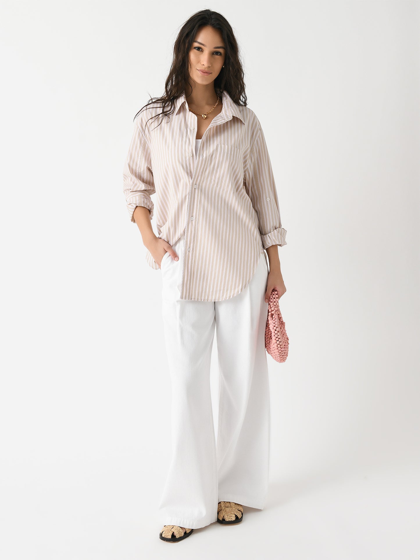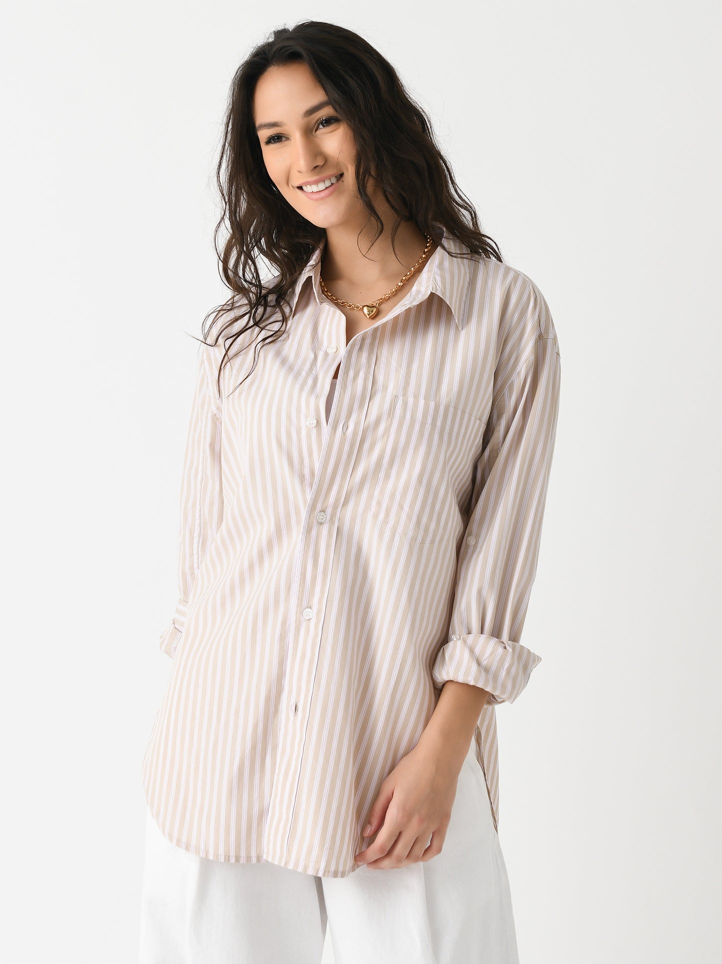 An oversized button-down shirt made from crisp cotton with a vertical striped print.