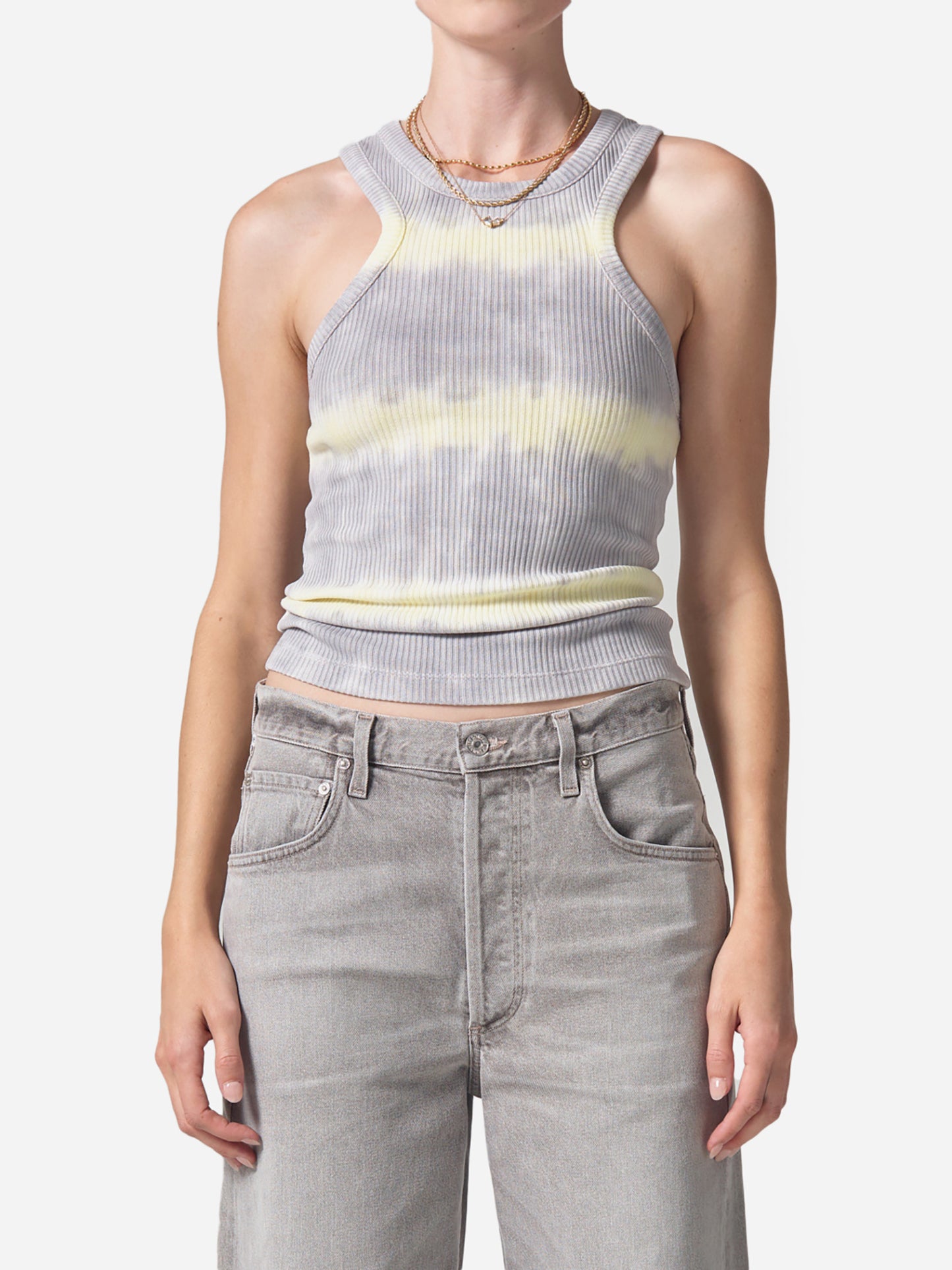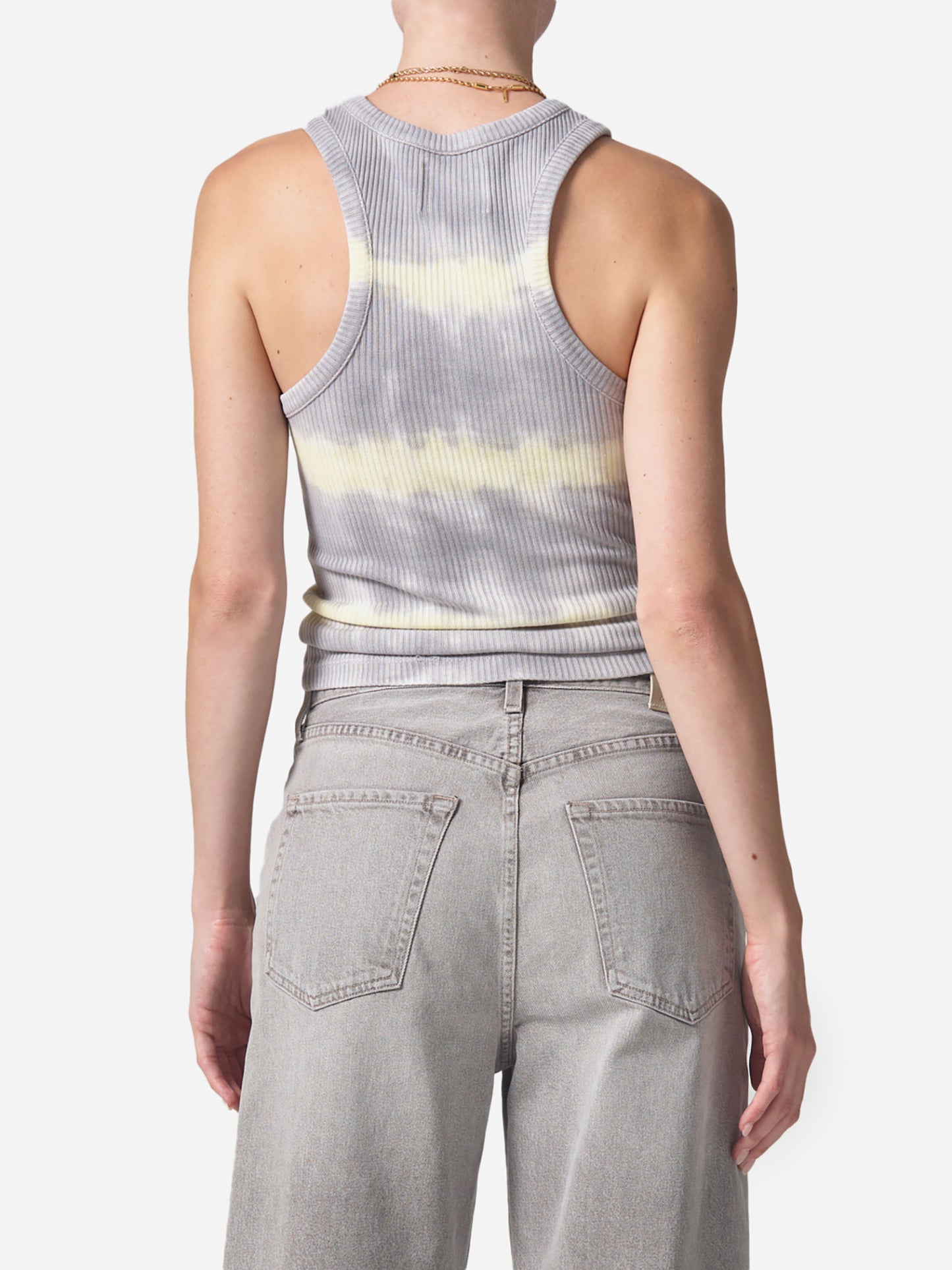 A form-fitting tank top with sculpted straps and a tie-dye print.