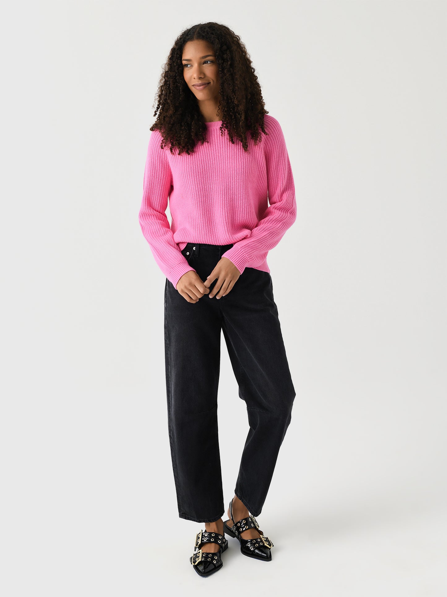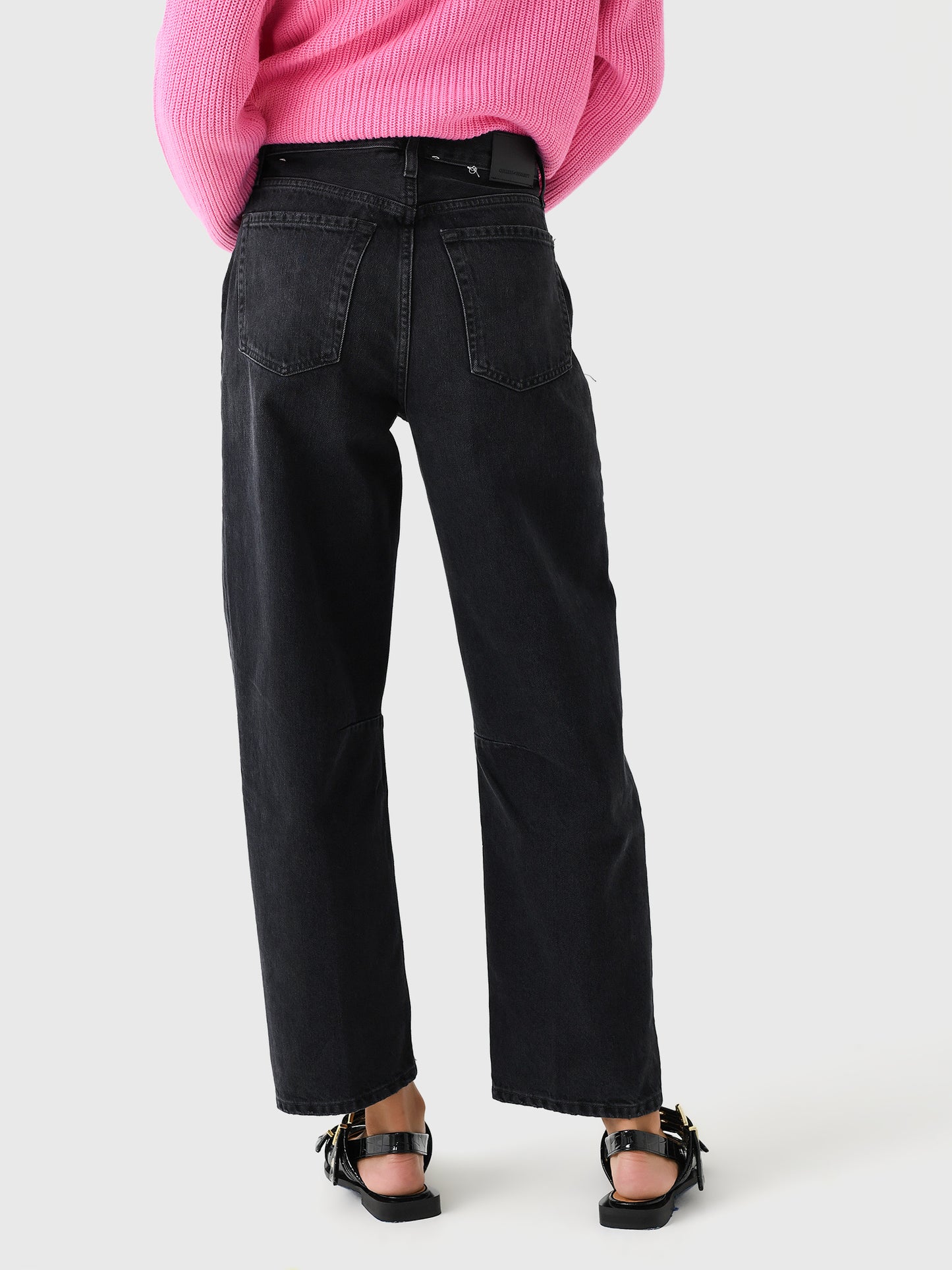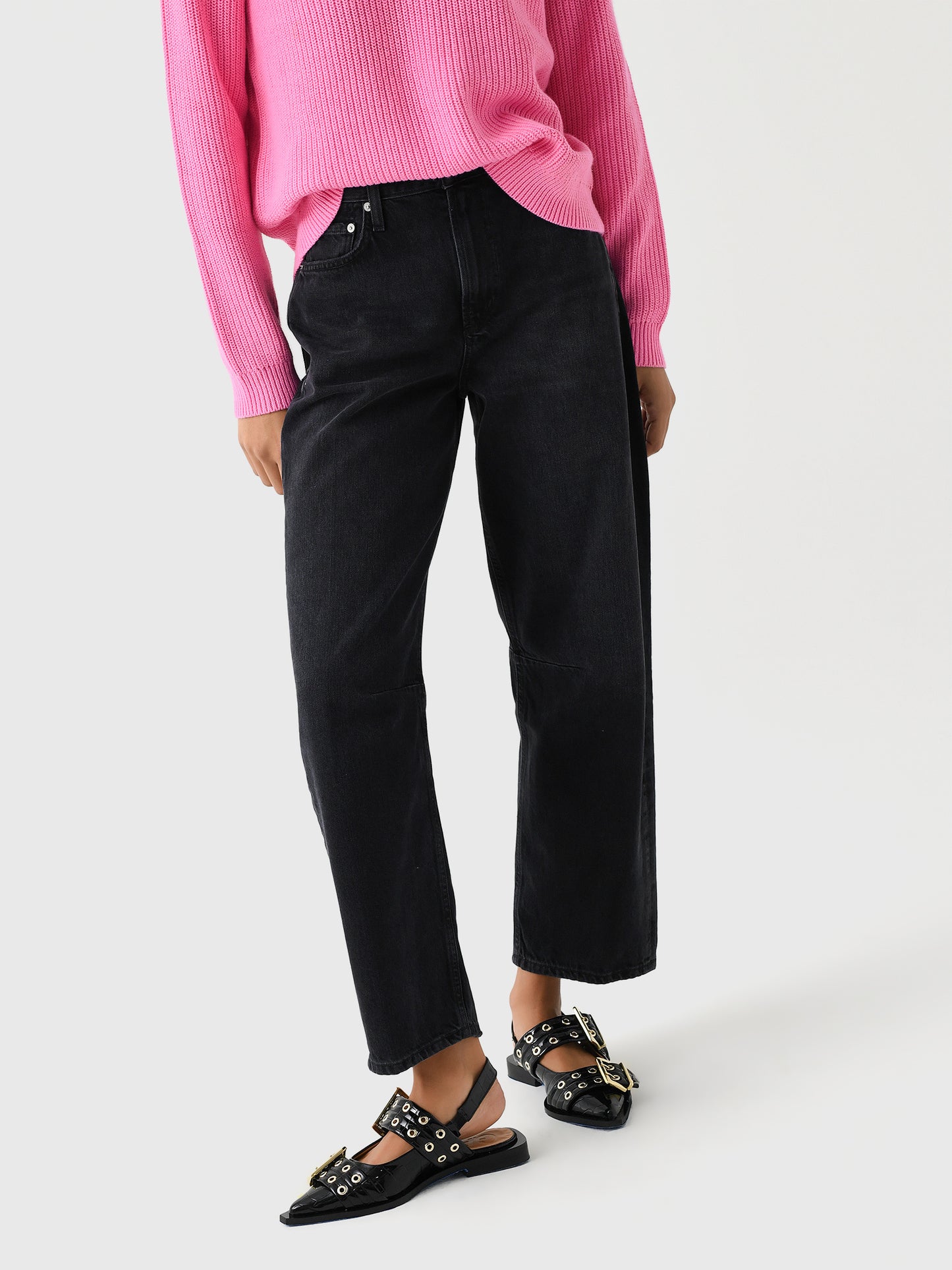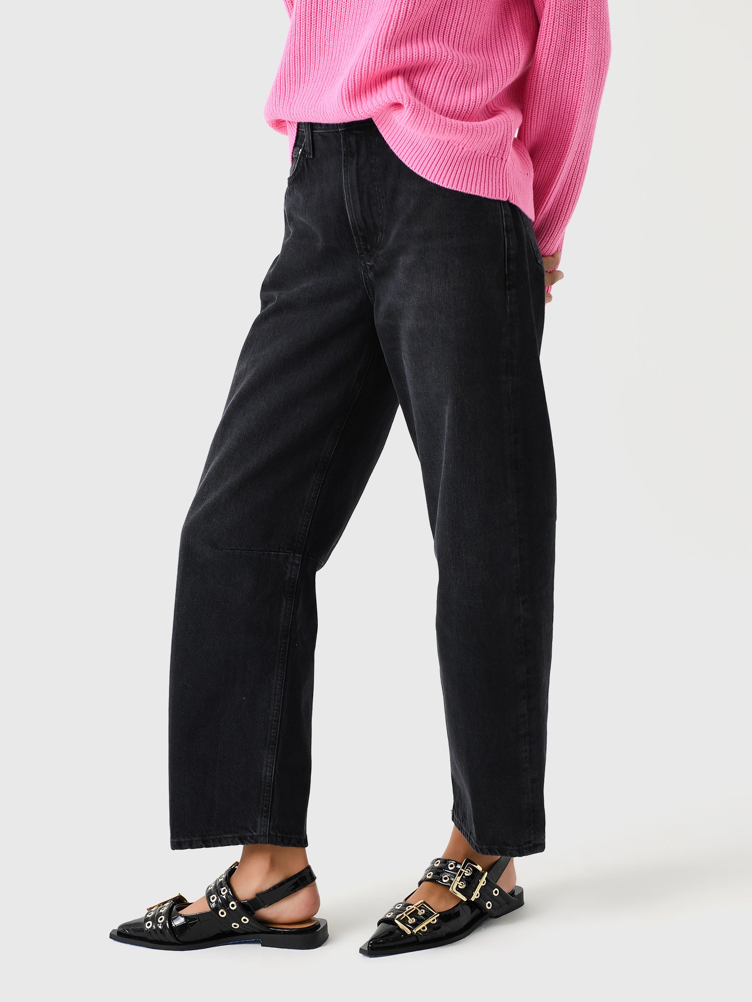 A relaxed crop jean made from regenerative cotton featuring a tapered barrel leg design.