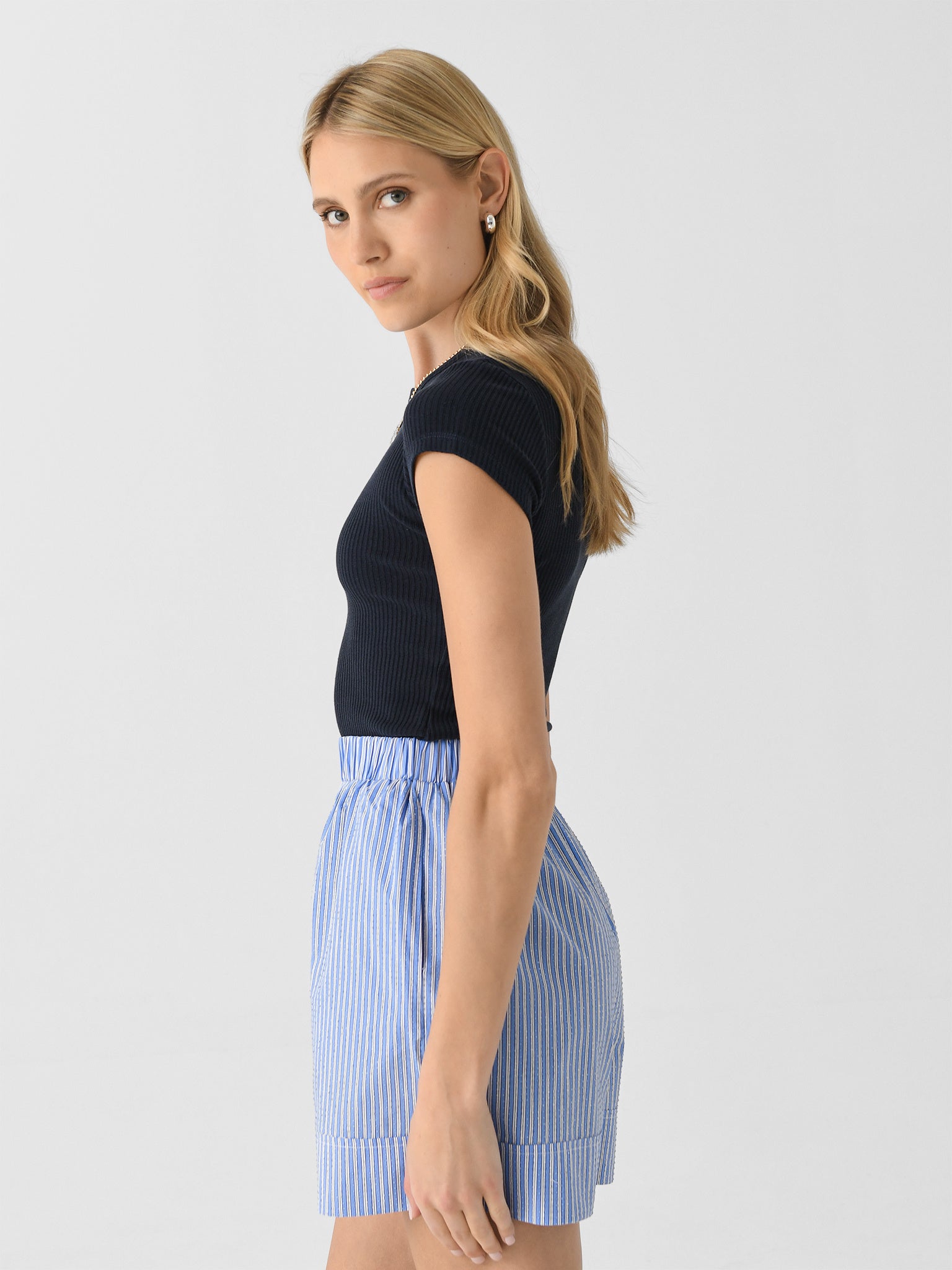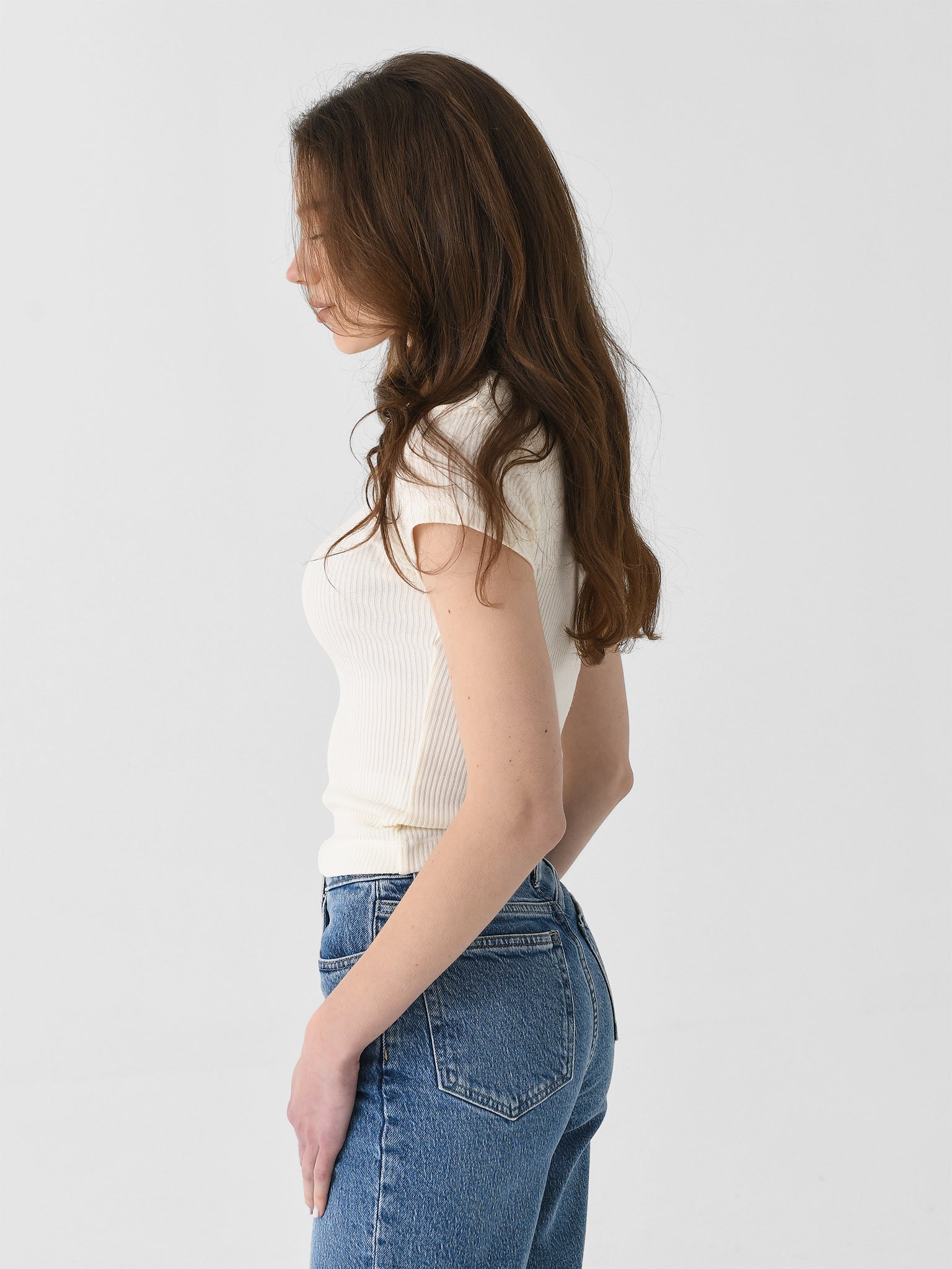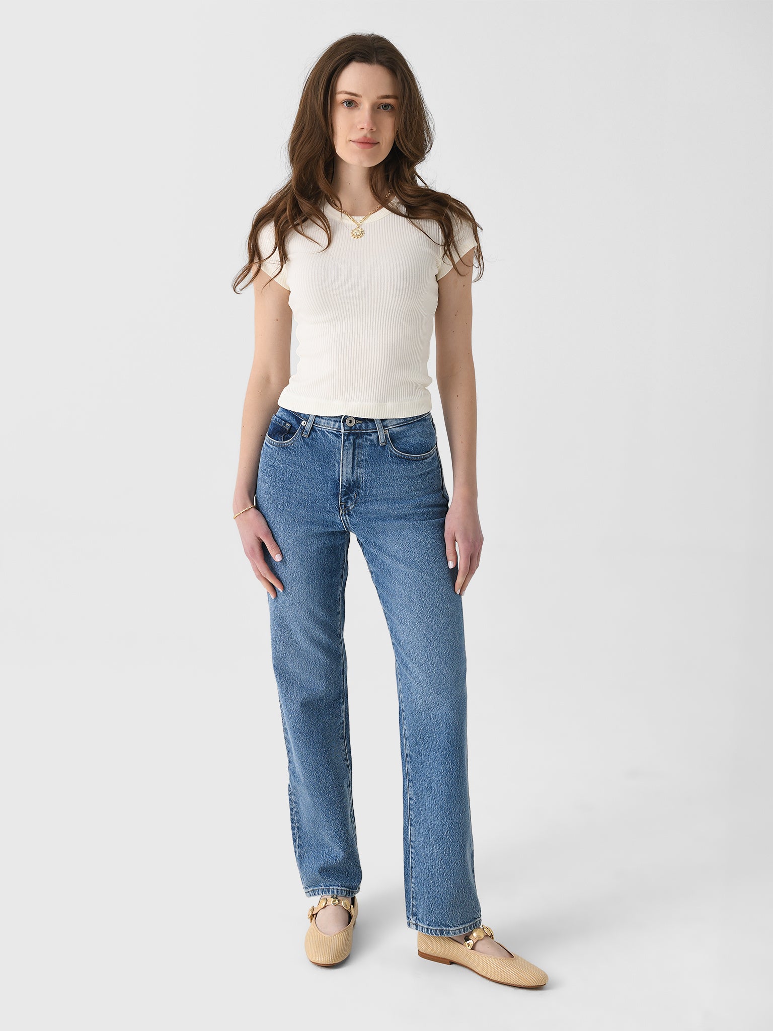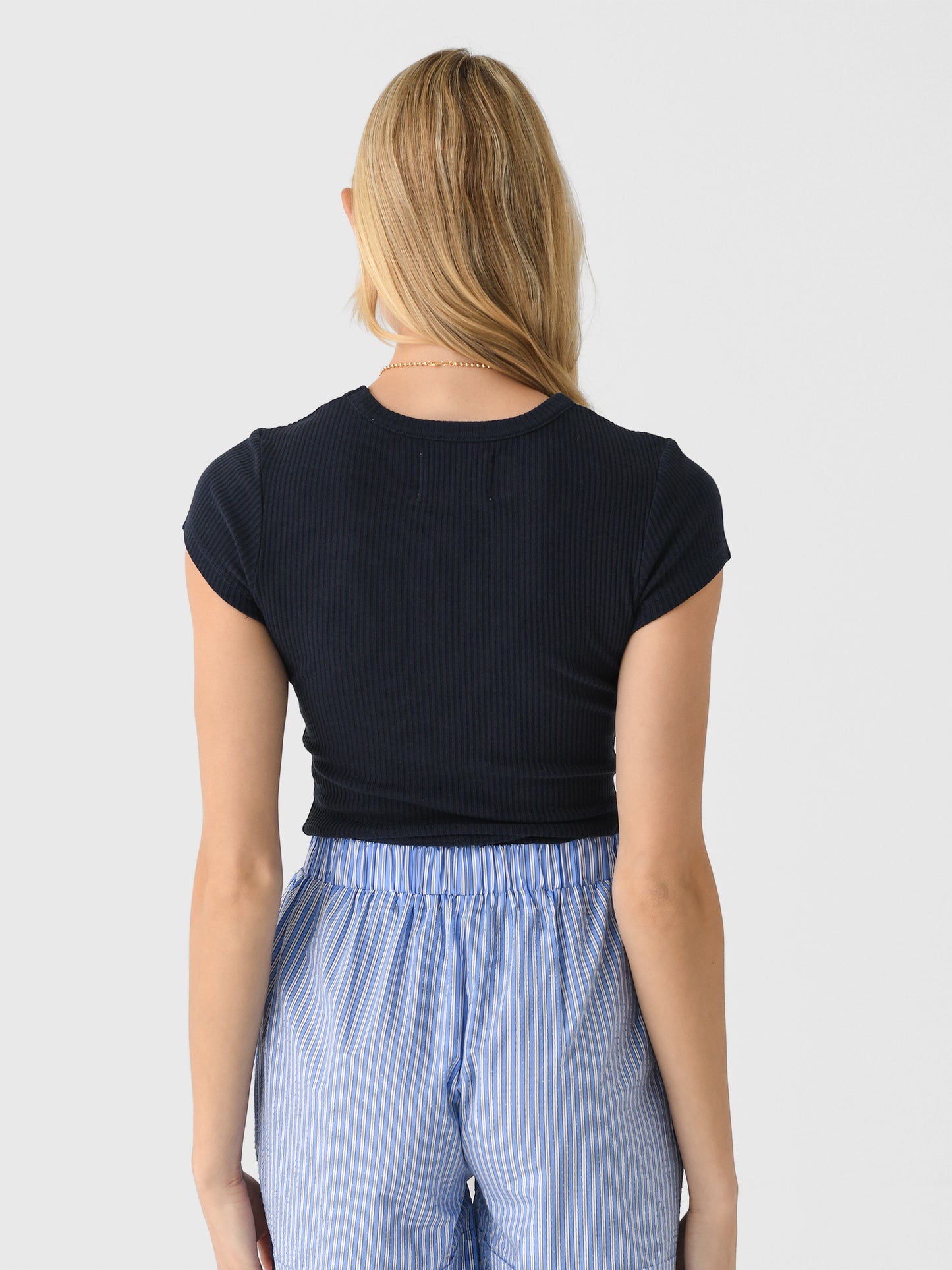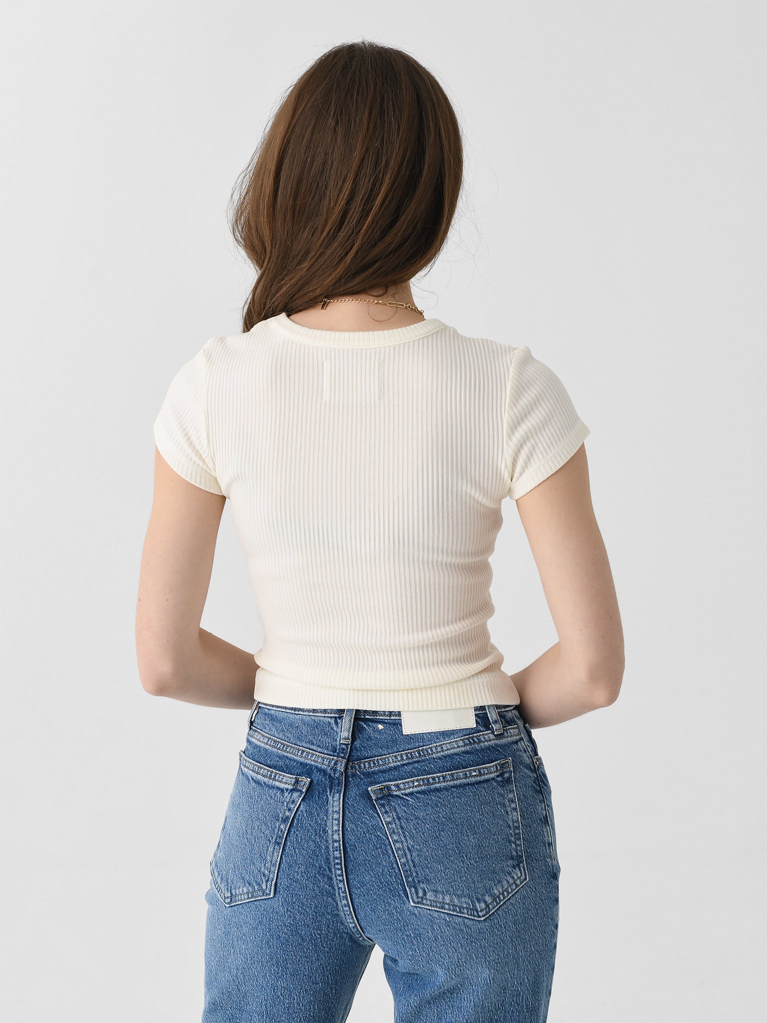 The Nello Tee offers breathable, body-contouring comfort with a flattering rib knit and feminine angled sleeves for elevated style.