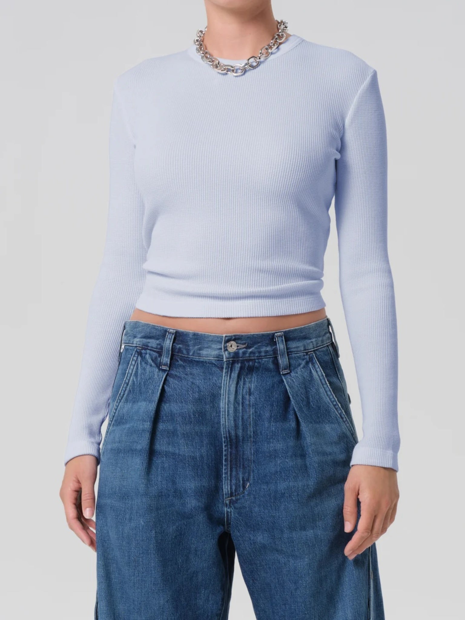 A long-sleeve shirt made from waffle knit regenerative cotton fabric.