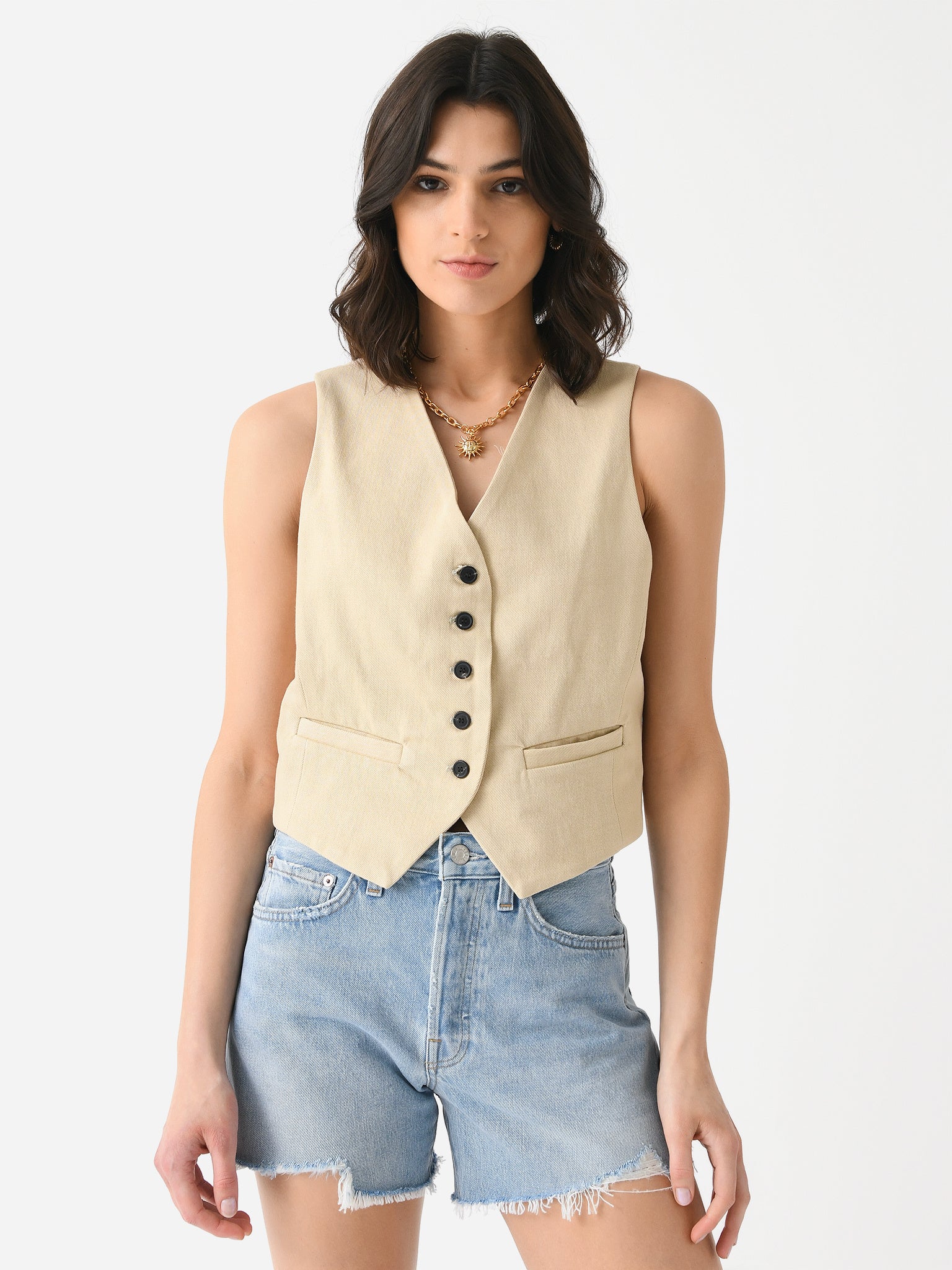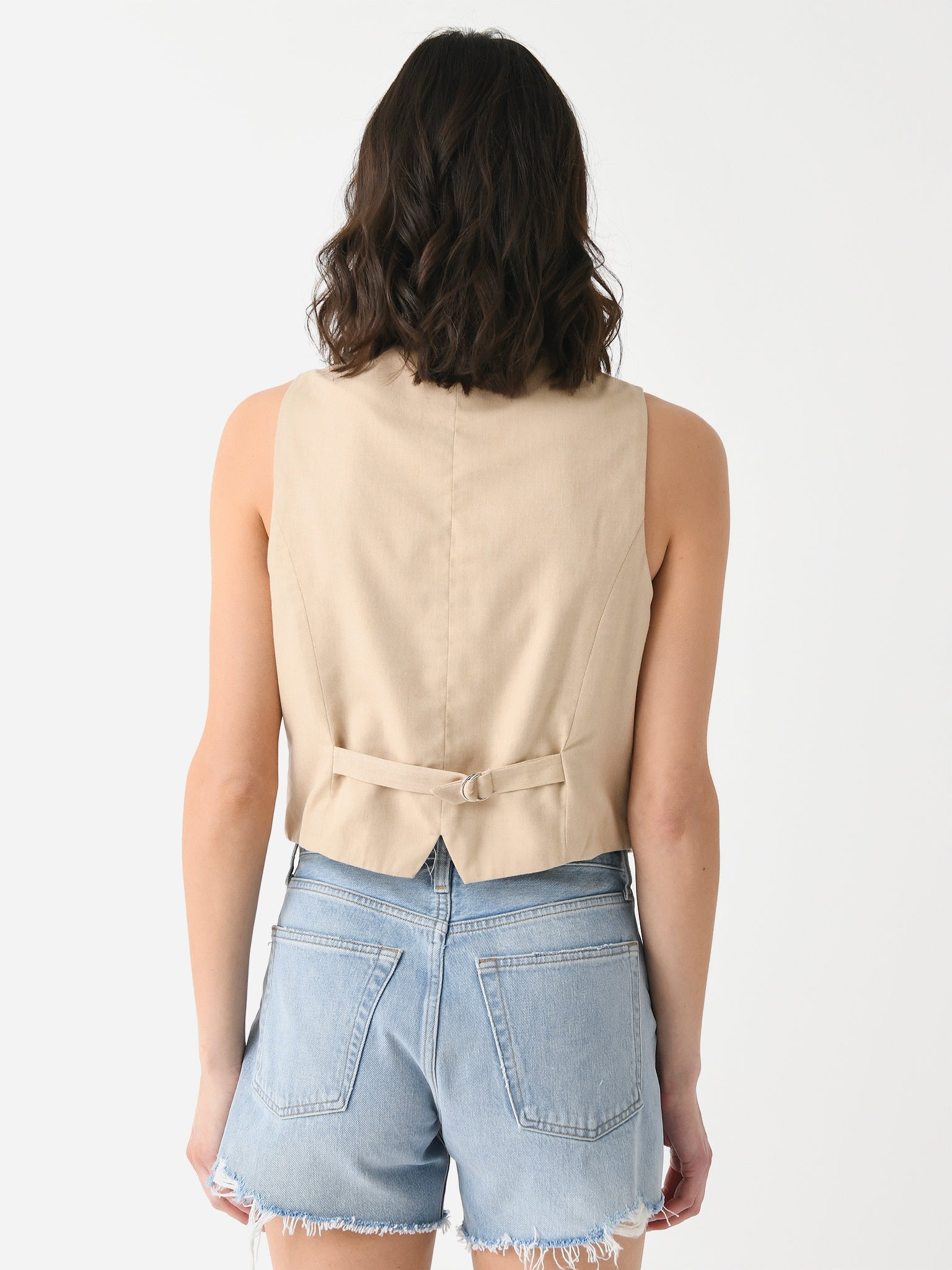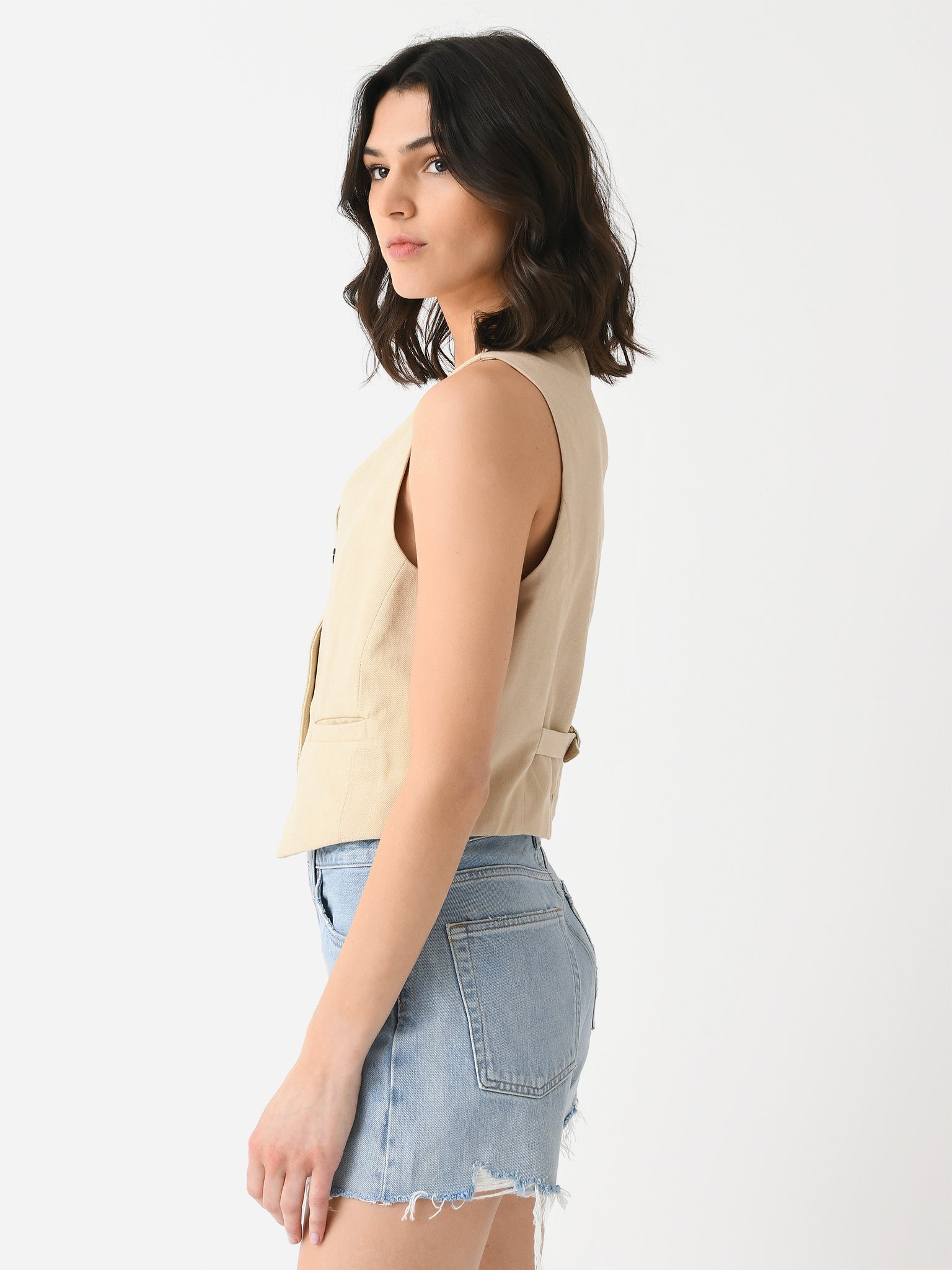 A tailored vest made from non-stretch cotton fabric.