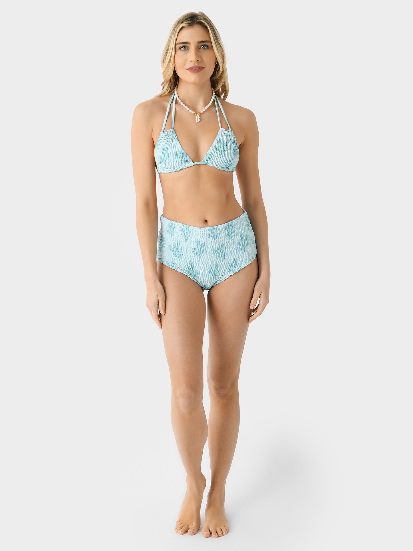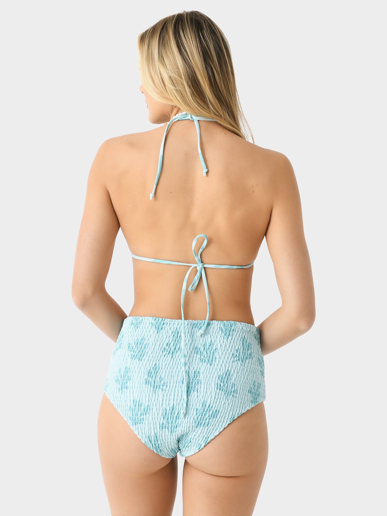 A classic triangle bikini top made from seamless smocked fabric with multi-way strap wearability.