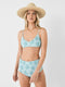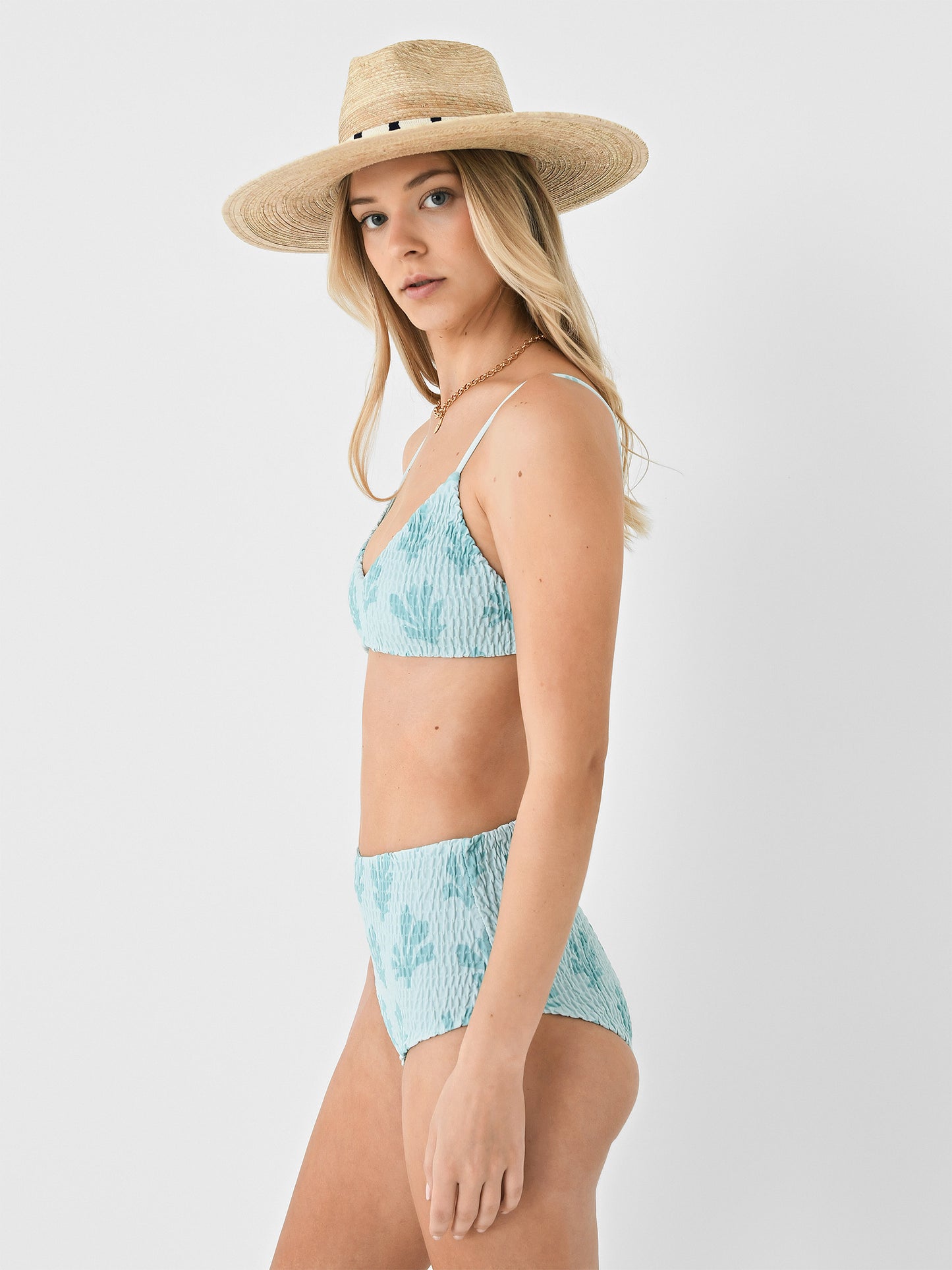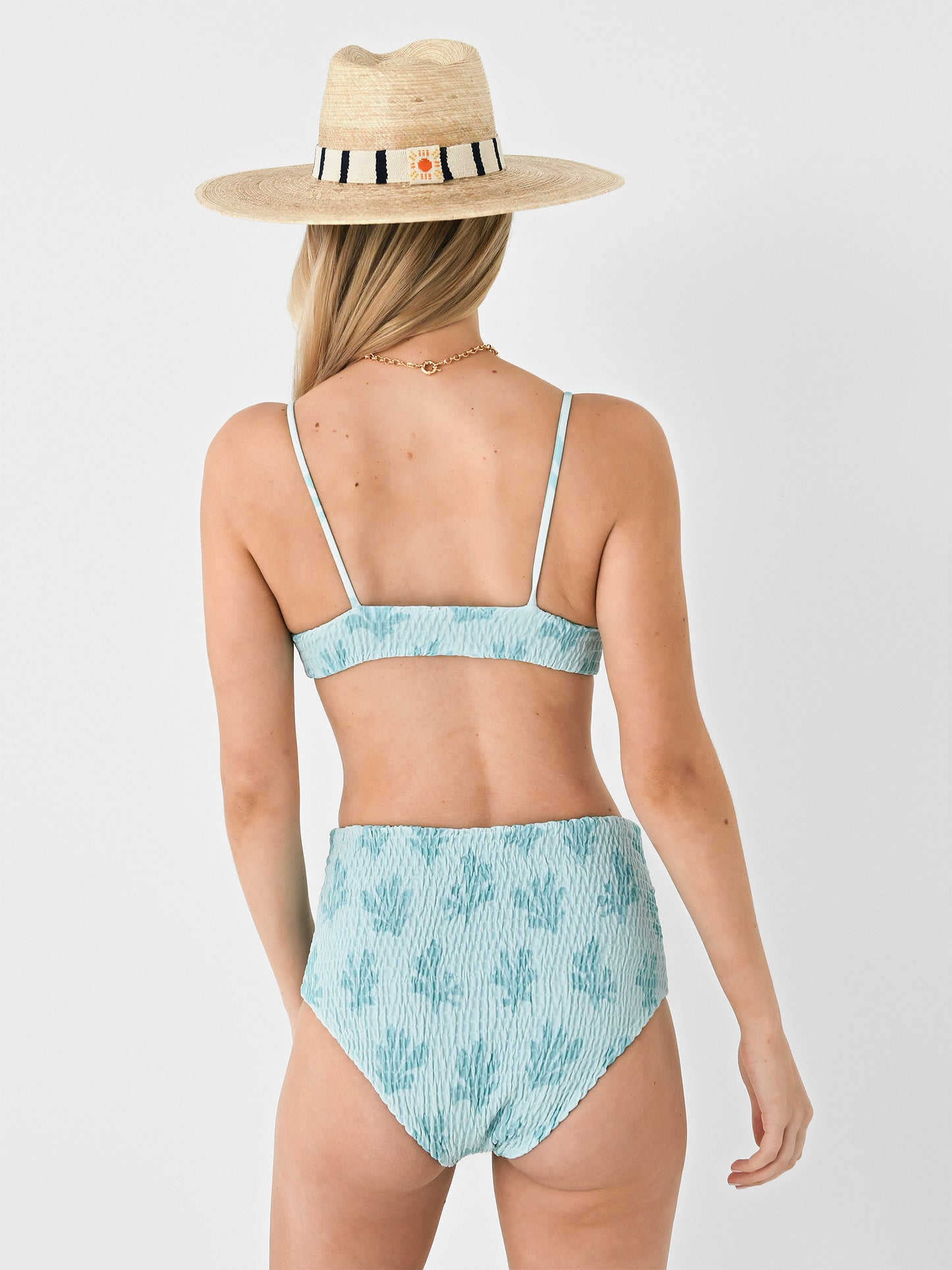 A bralette-style bikini top made from novelty printed smocked fabric.