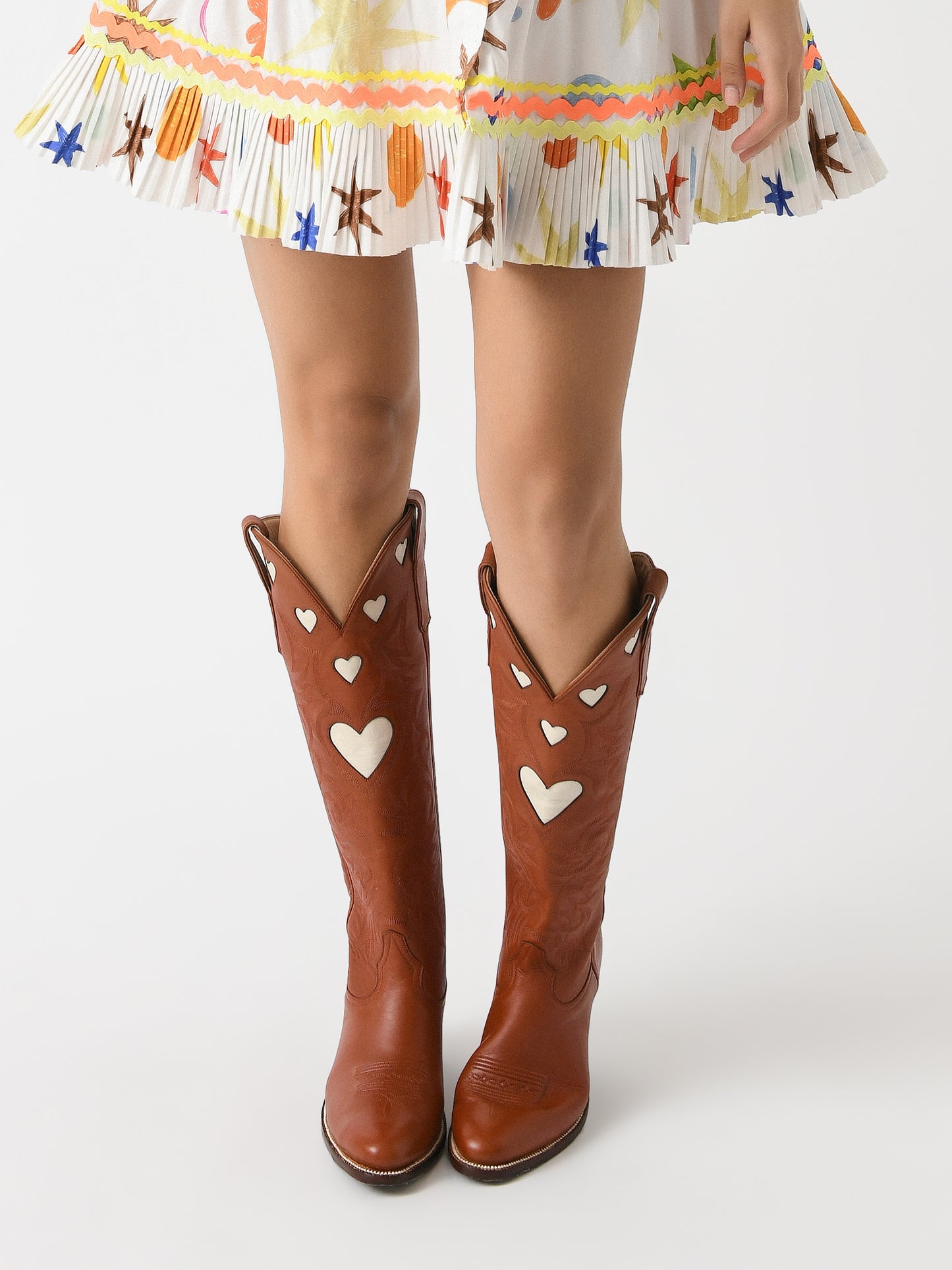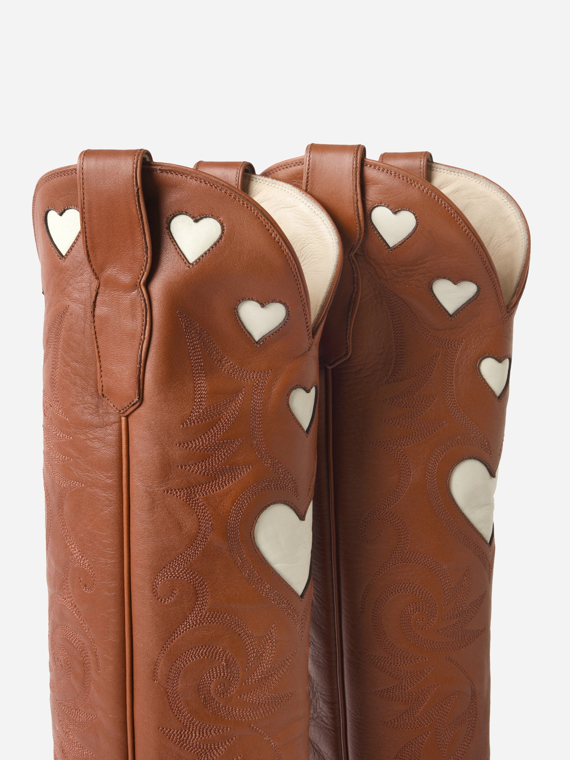 An extra tall pair of boots constructed from premium calfskin leather with stitched contrast heart designs.