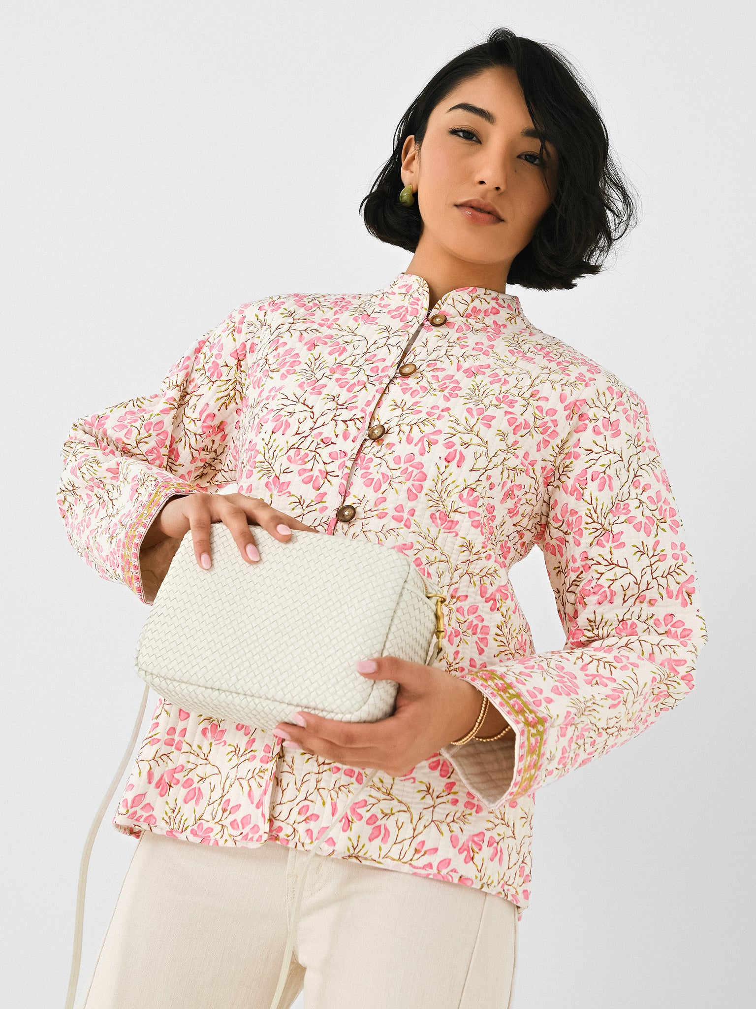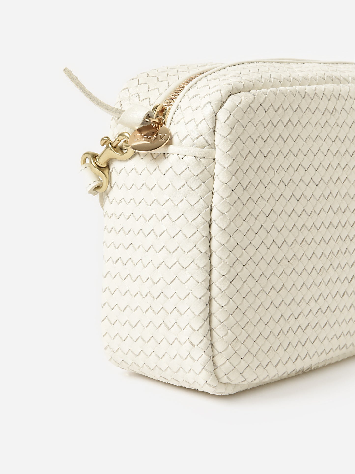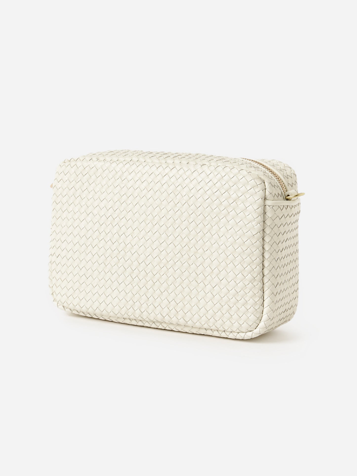 An everyday crossbody bag made from handwoven leather with a detachable strap.