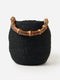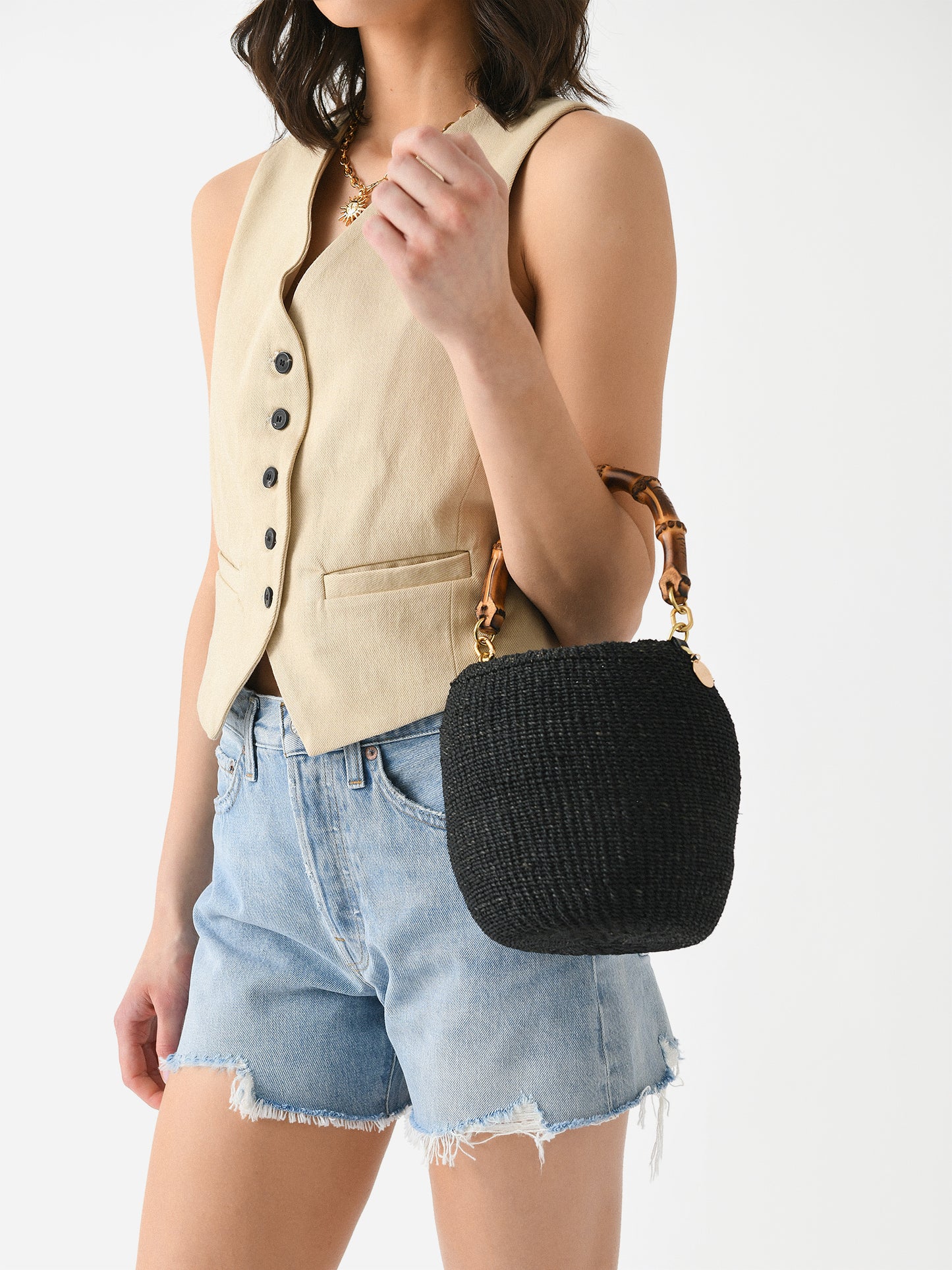 A natural straw handbag with a removable bamboo handle and a honeypot-inspired design.