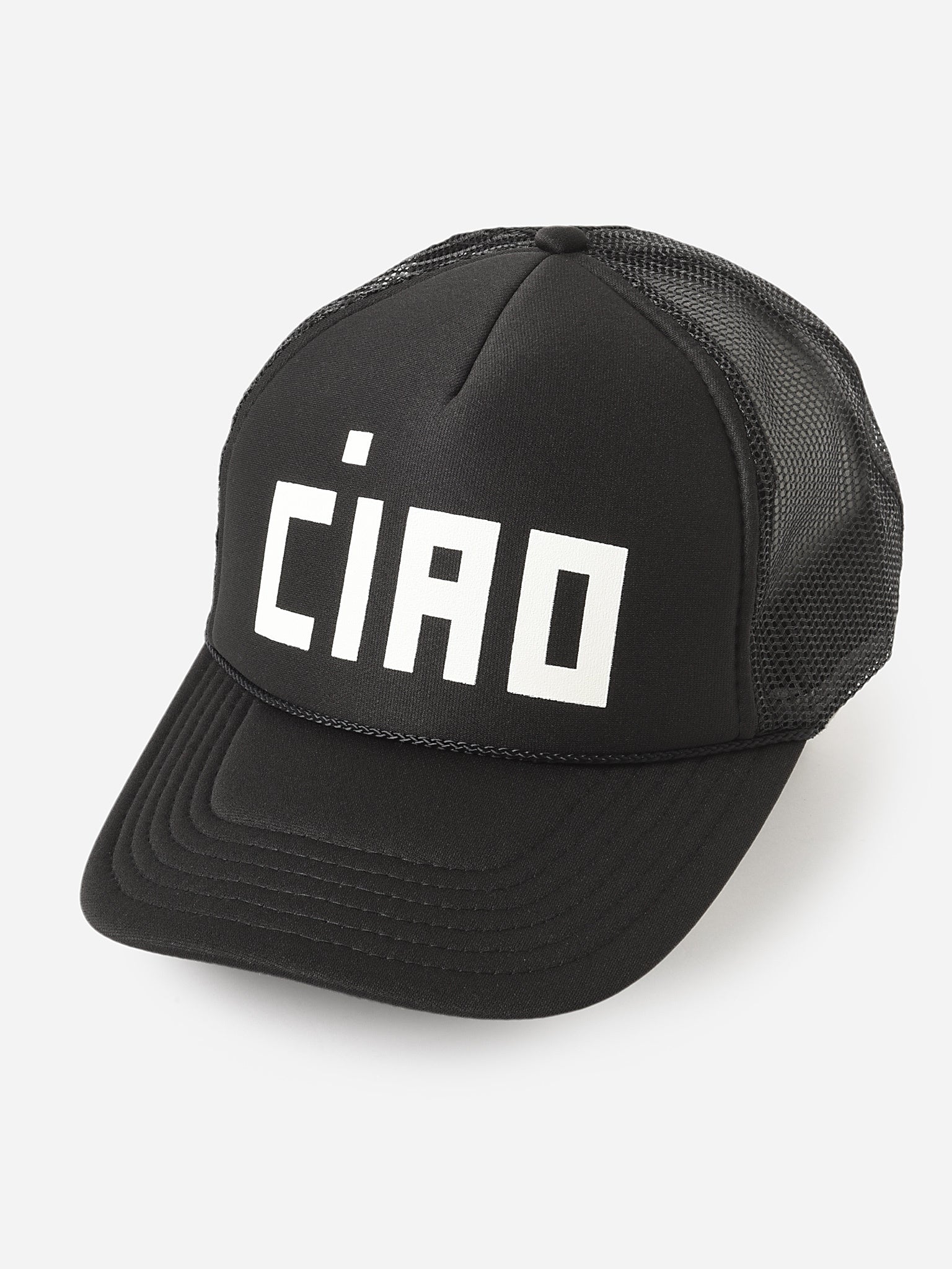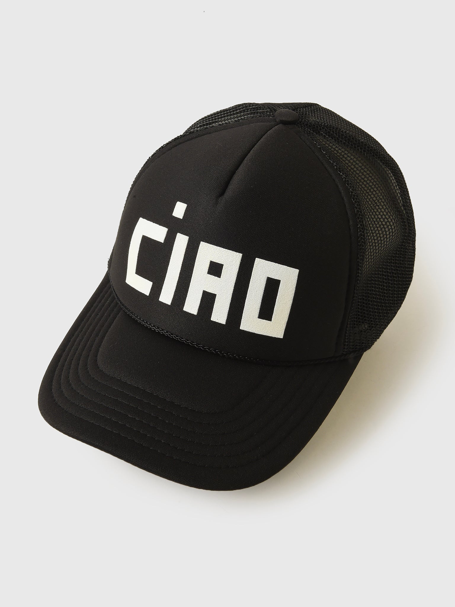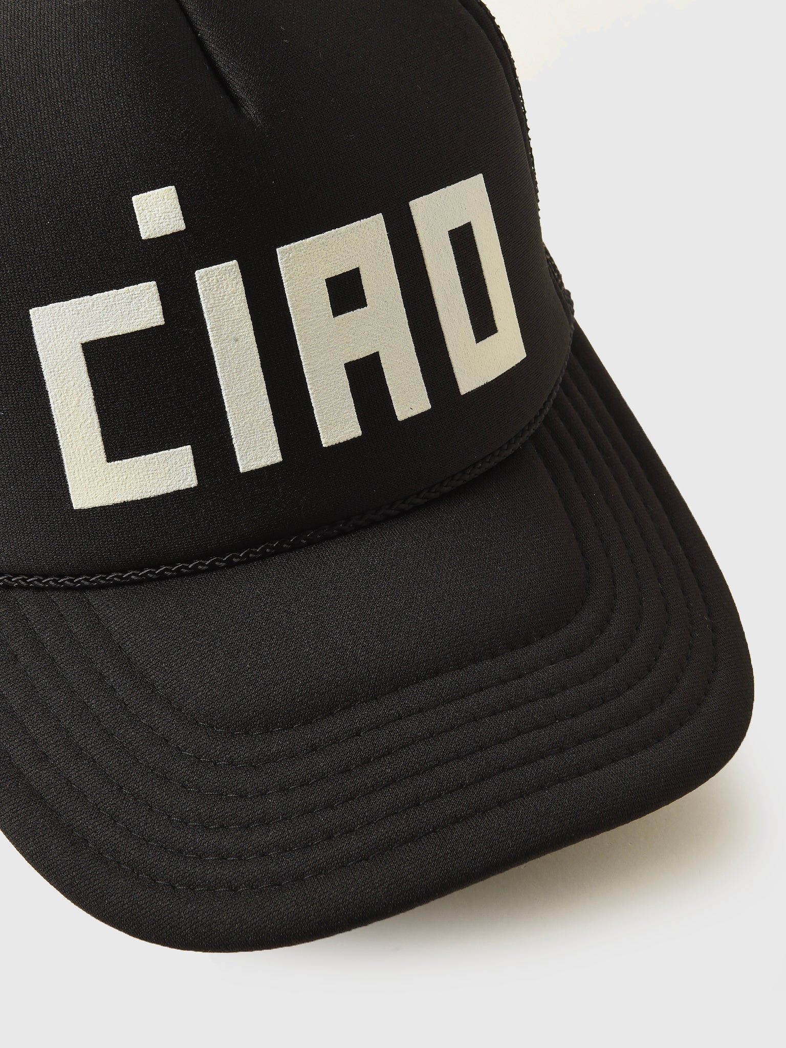 A classic trucker hat with a Ciao letter graphic and adjustable back.