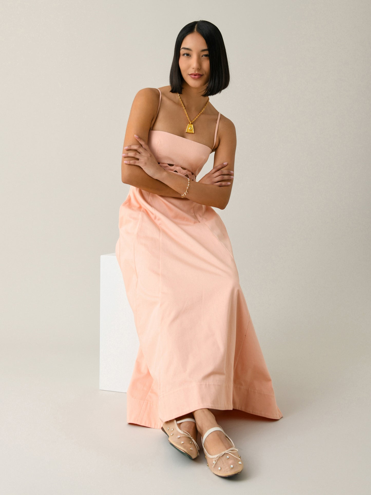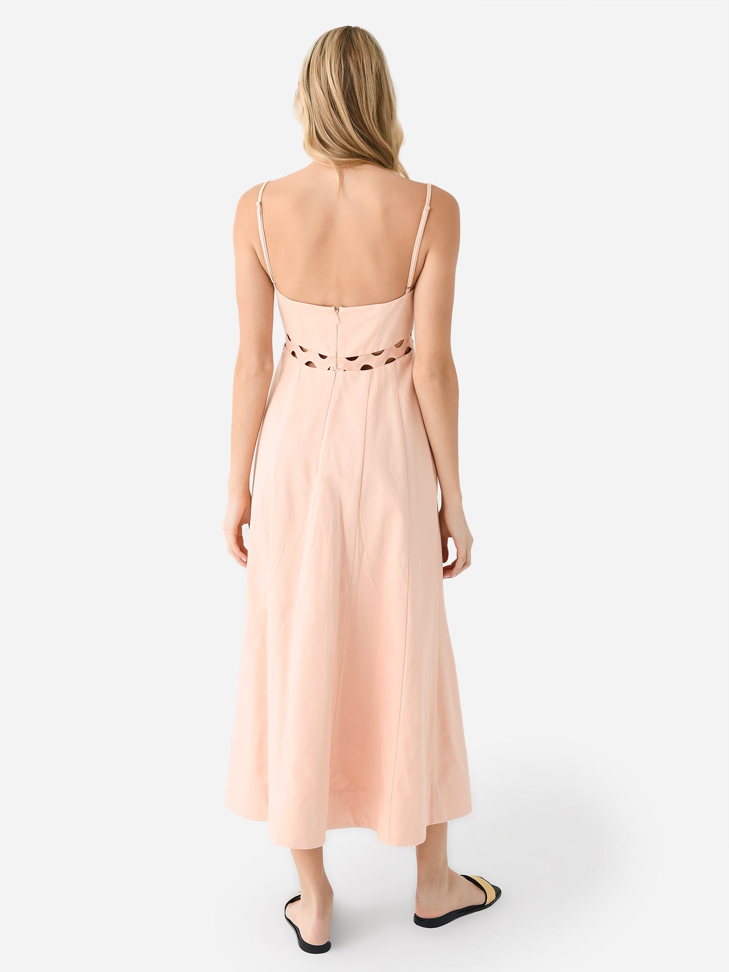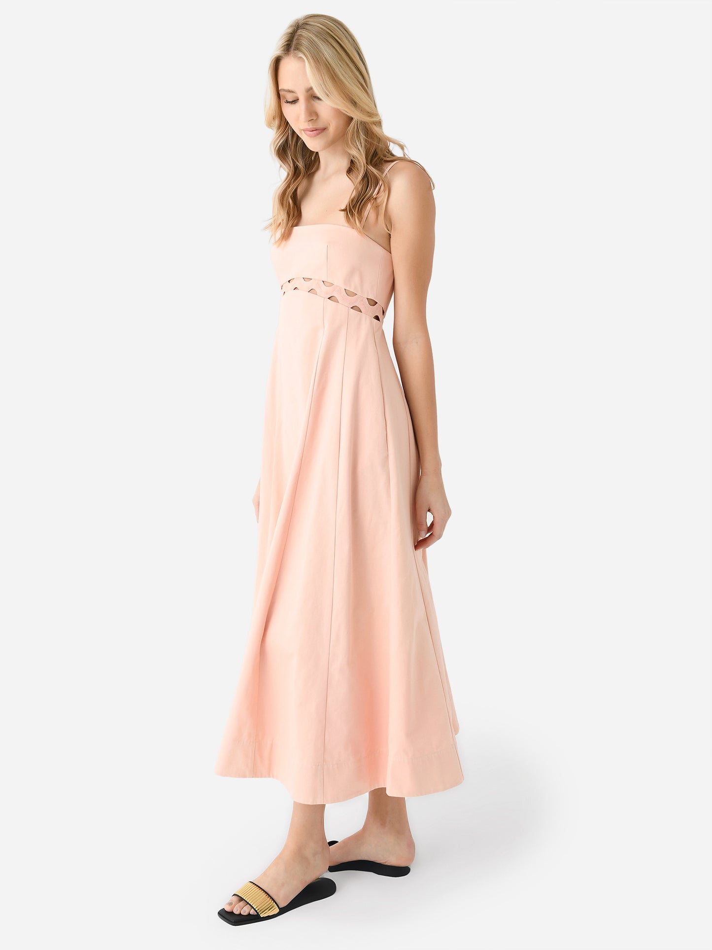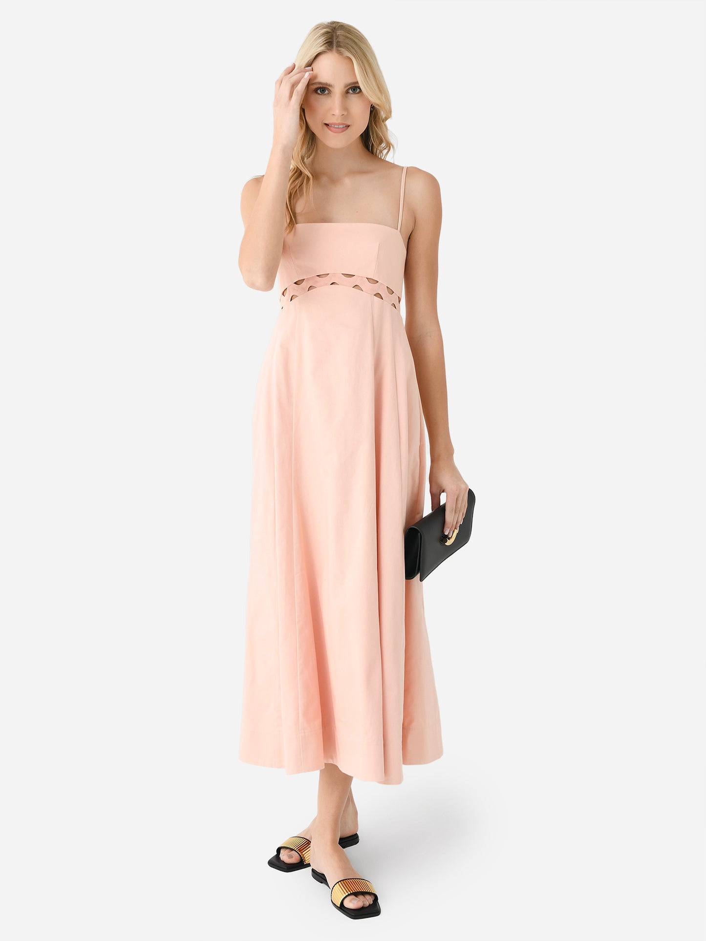 A mid-length dress with feminine cutouts and a full, paneled skirt.