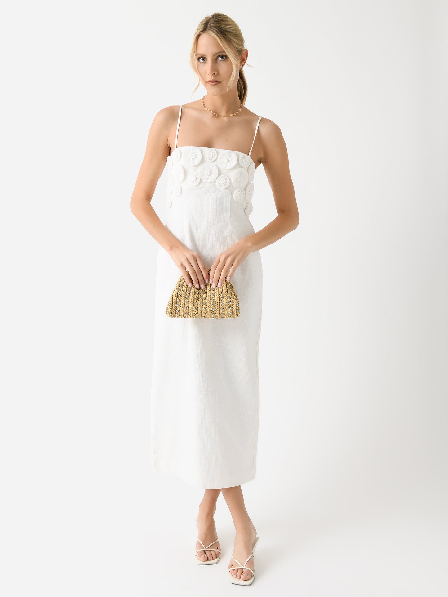 A longline dress made from textured cotton linen fabric with beautiful floral raffia appliqués along the bust.