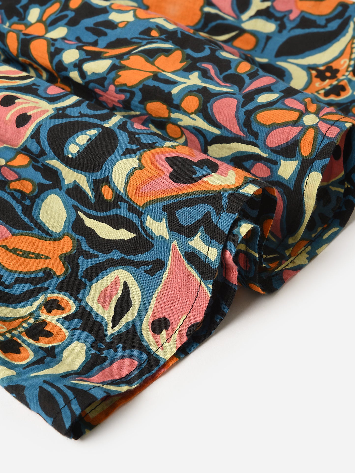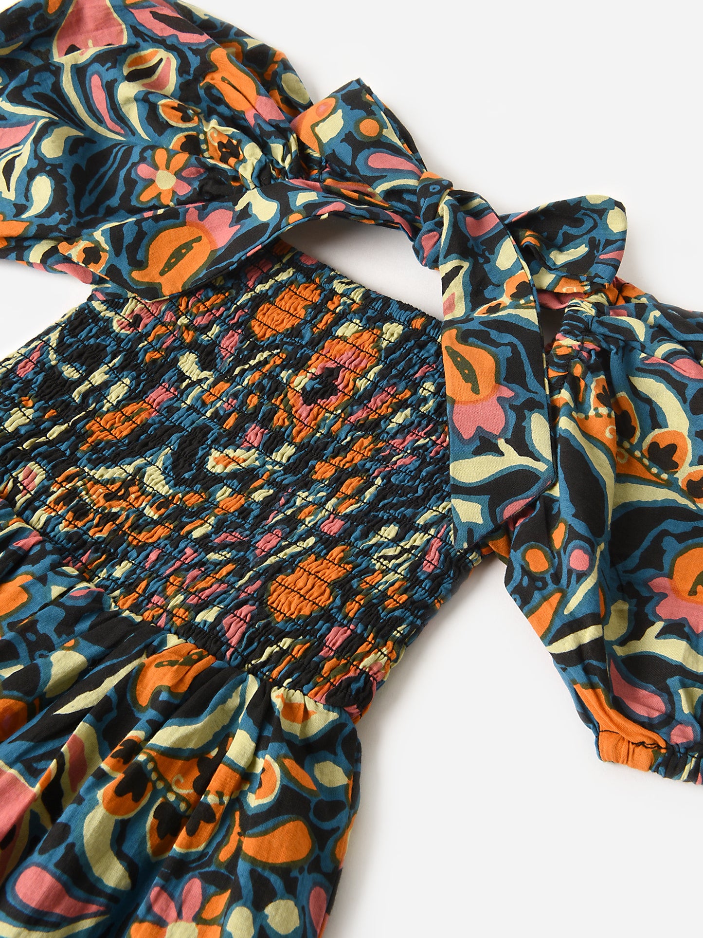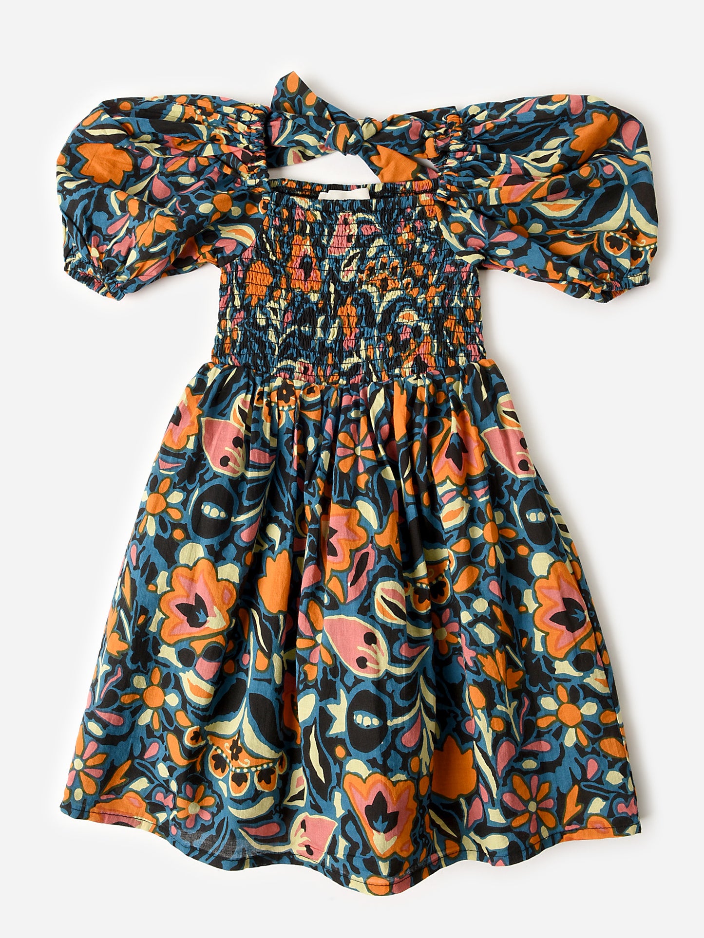 A colorful printed dress featuring elegant puff sleeves and a back tie detail.
