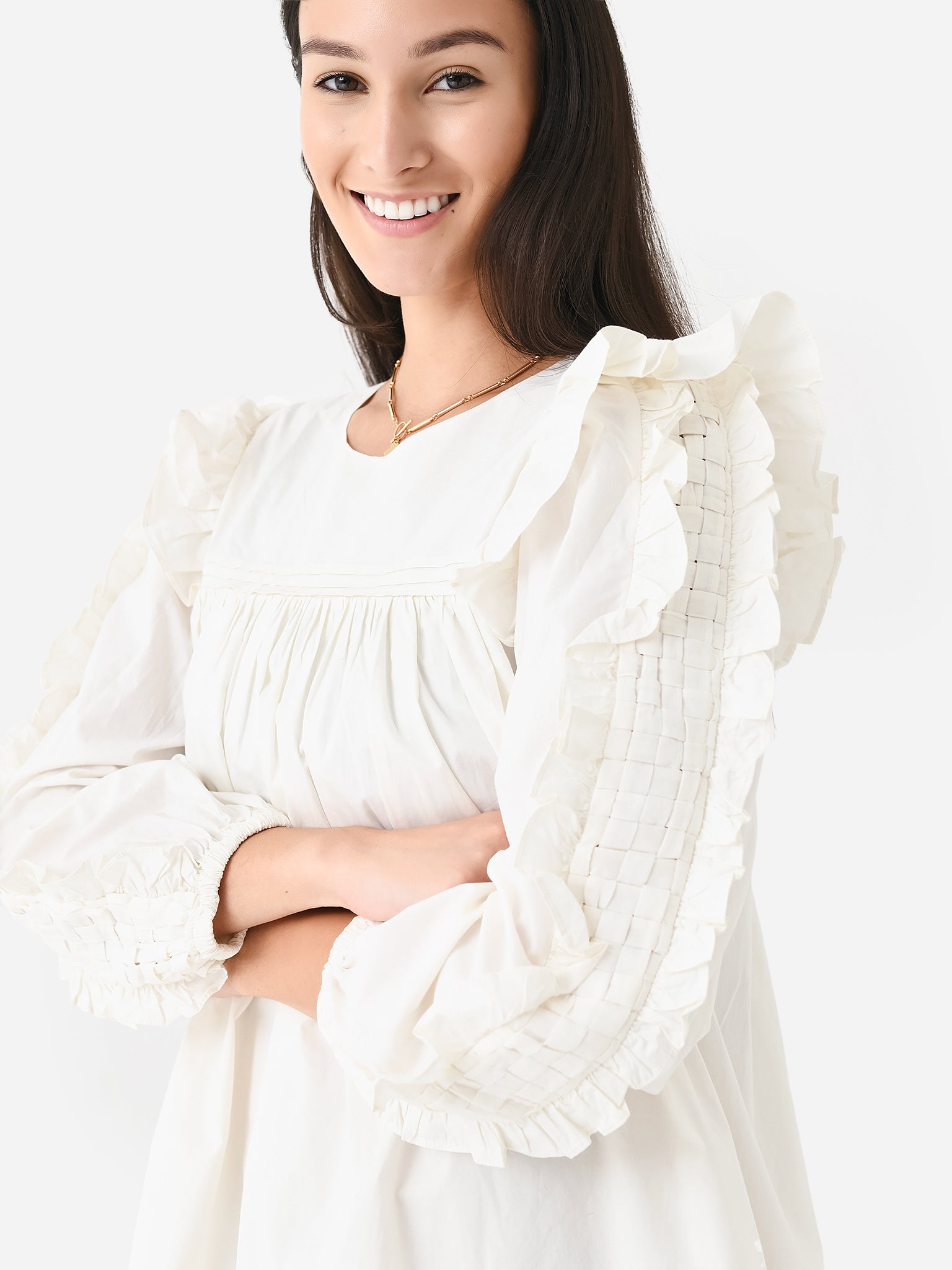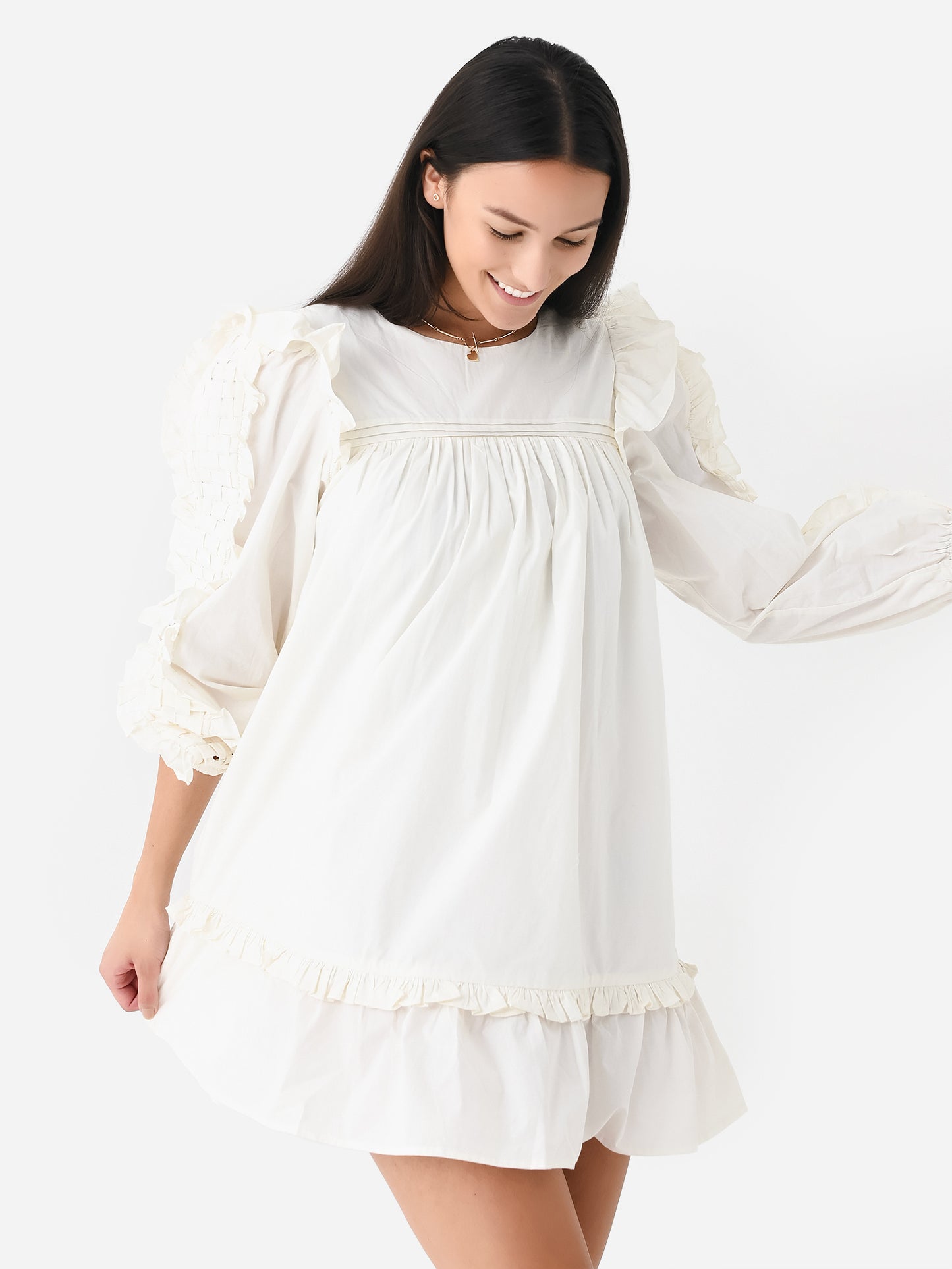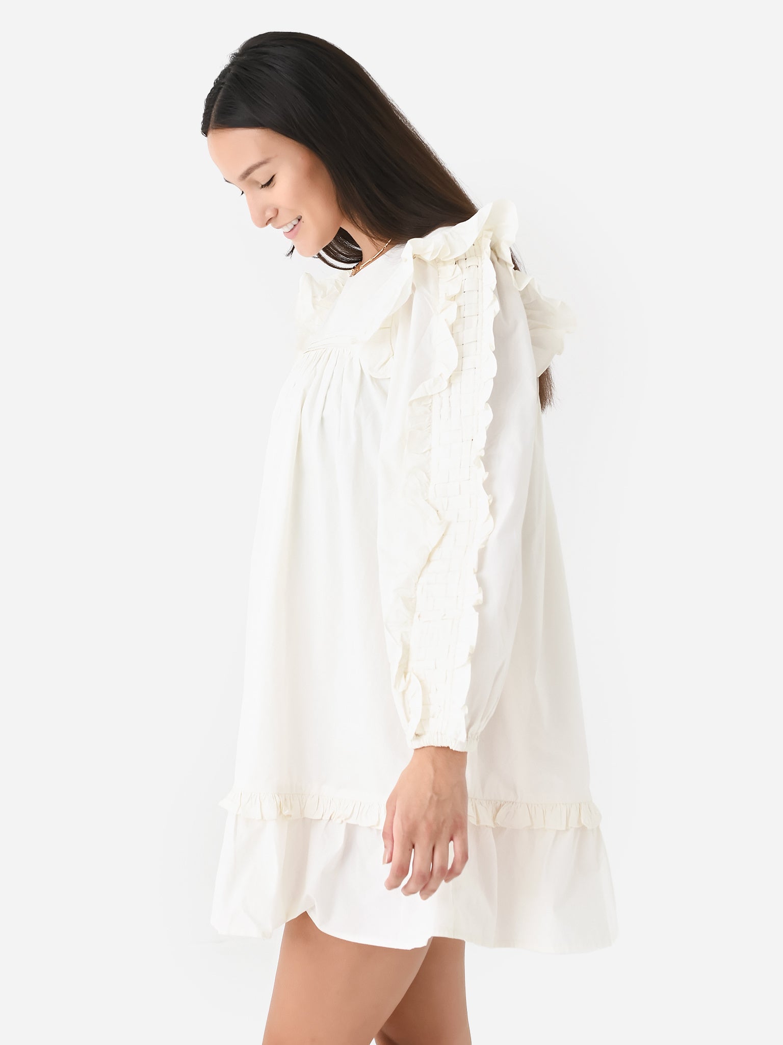 Lightweight mini dress with woven detailing on the yoke and sleeves with ruffle trim and a flounce hem.