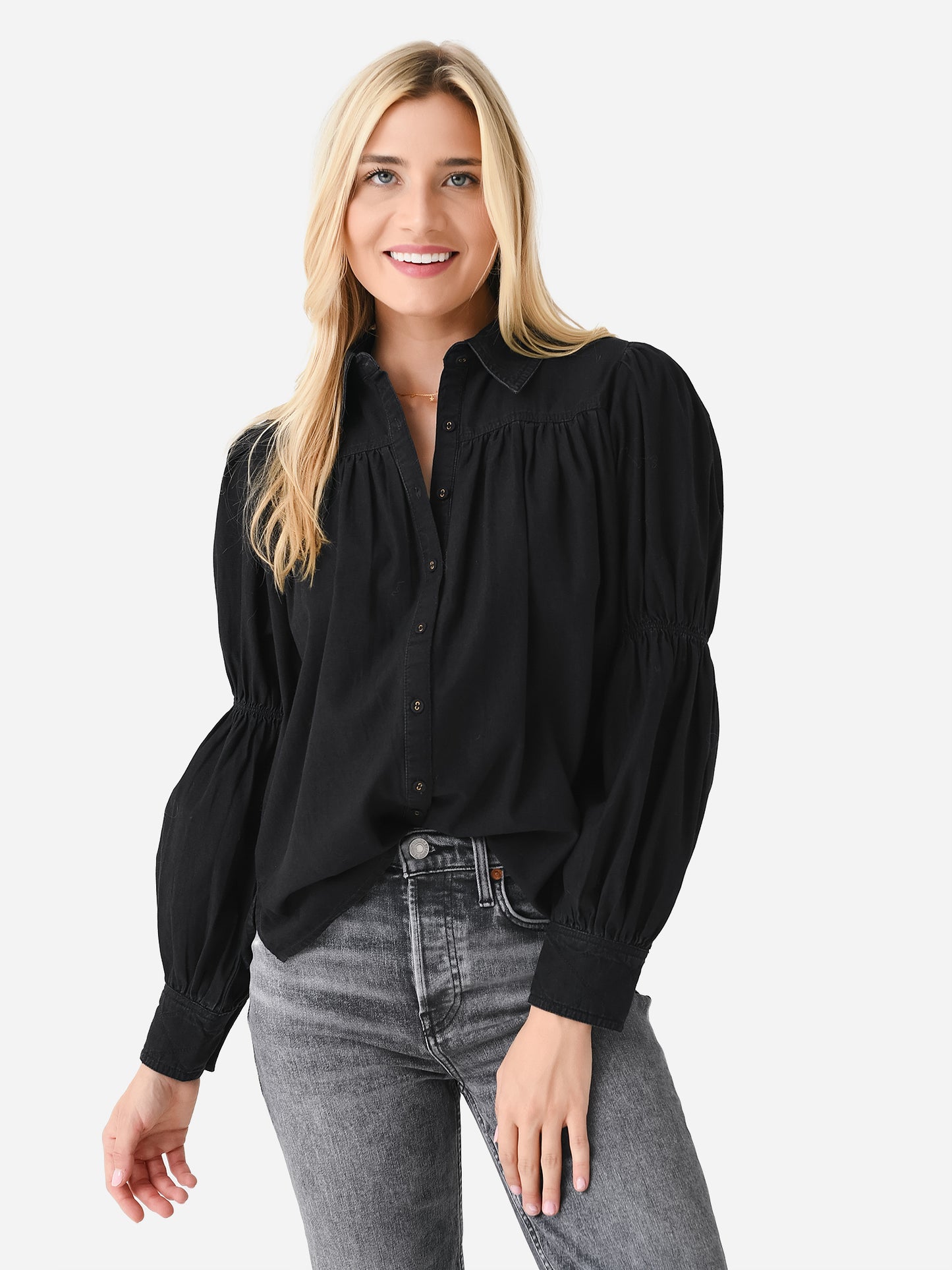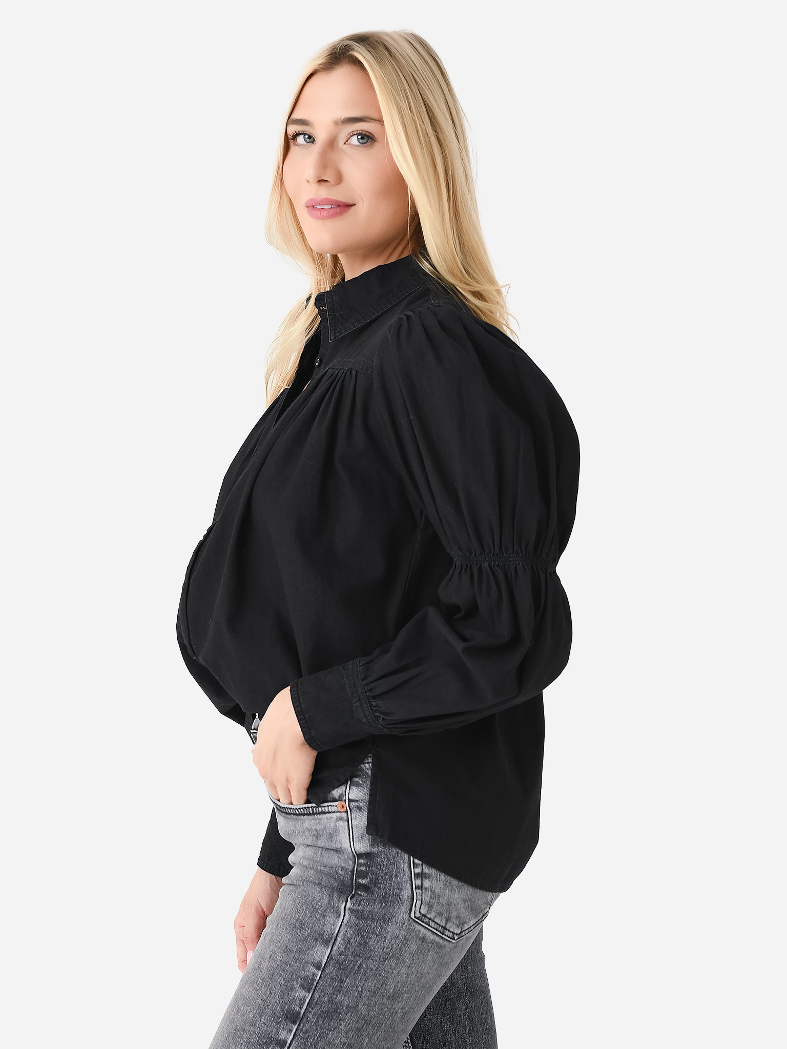 Lightweight button-down blouse with gathered details constructed from organic cotton.