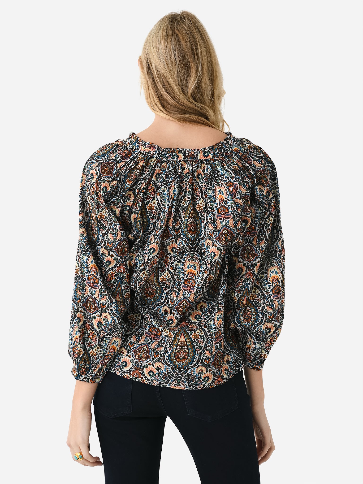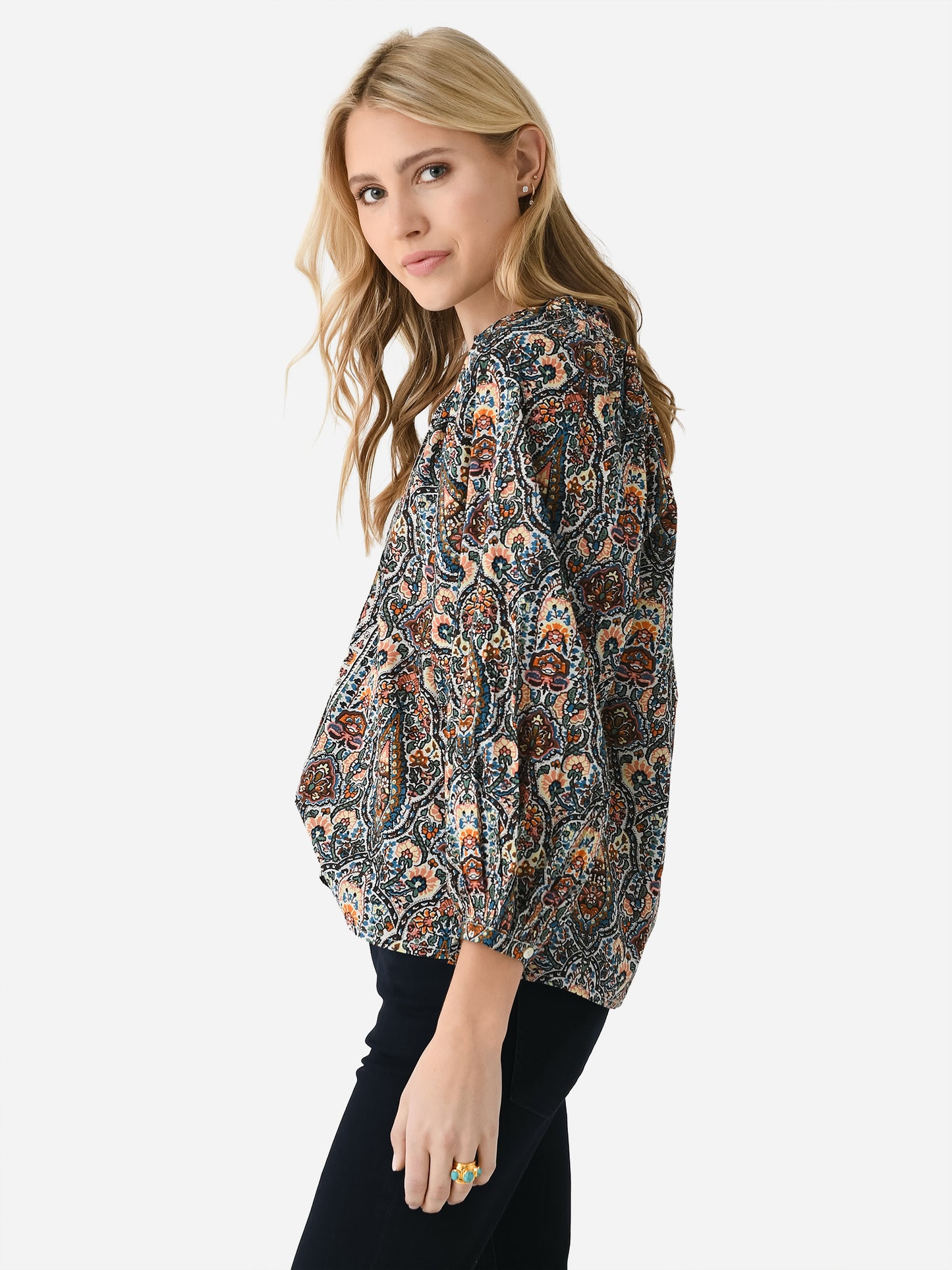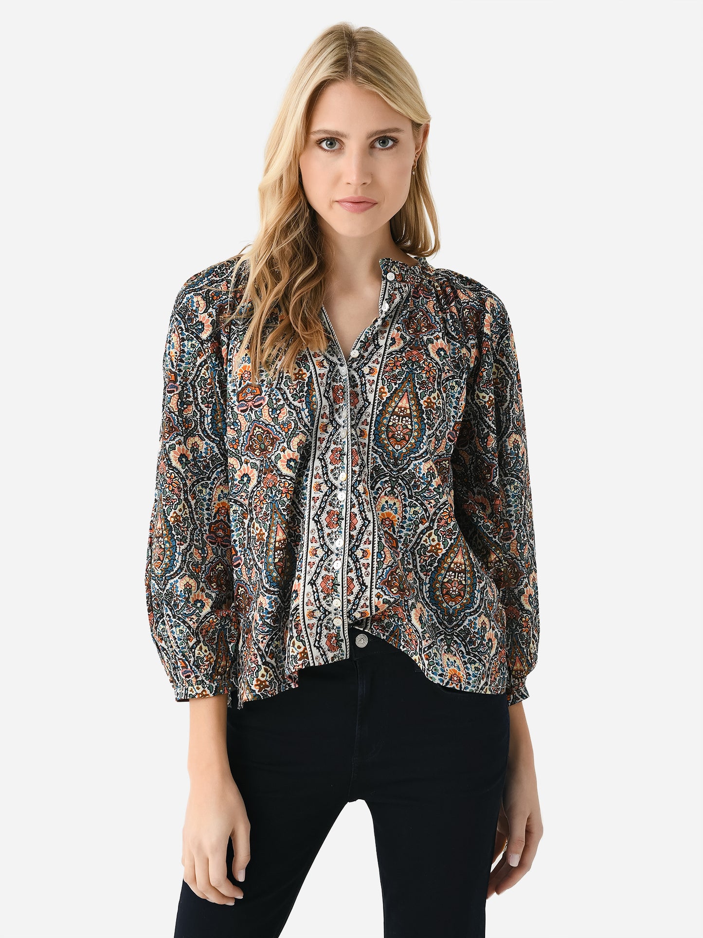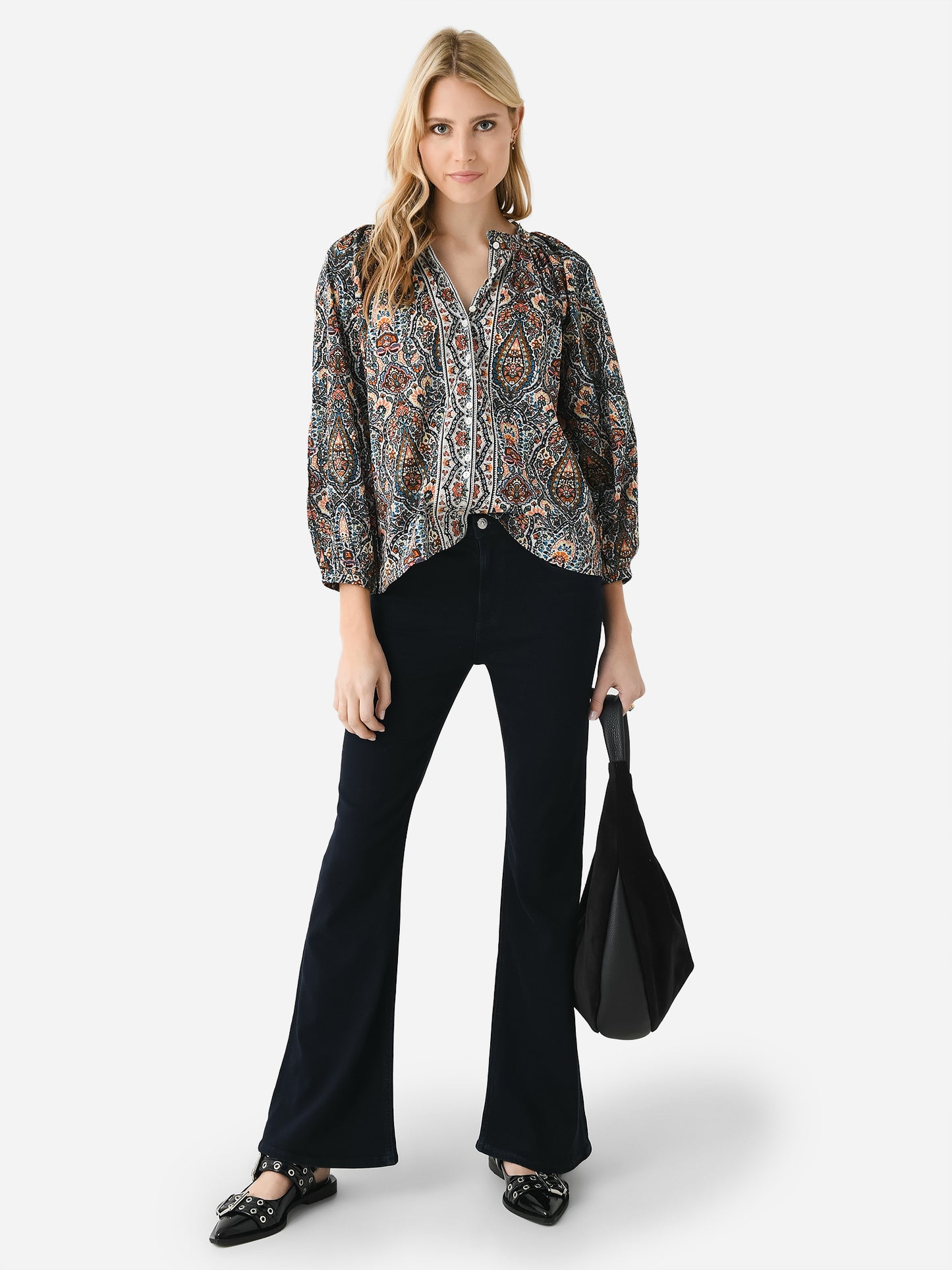A lightweight blouse made from organic cotton featuring a colorful abstract print and mother-of-pearl buttons.