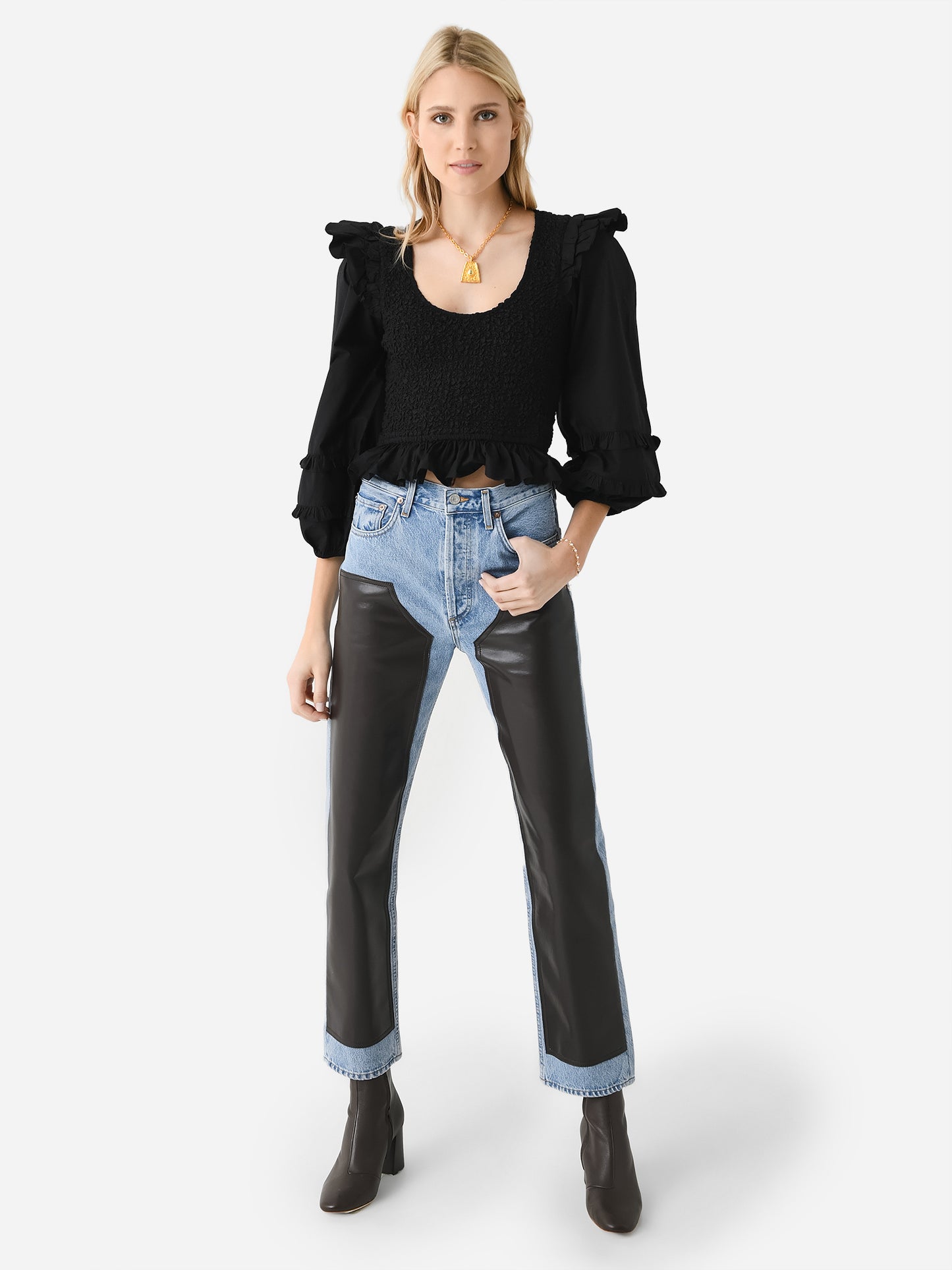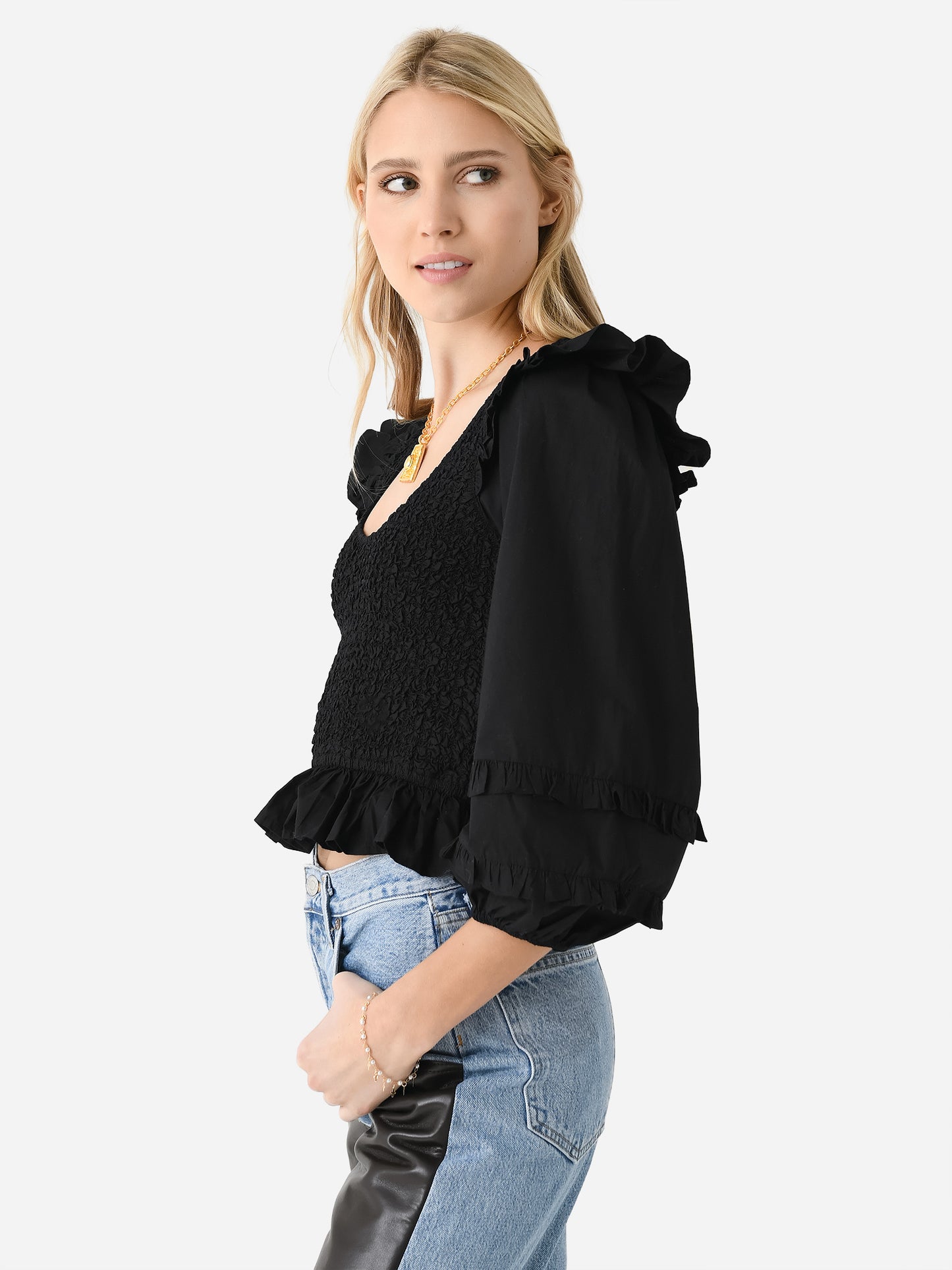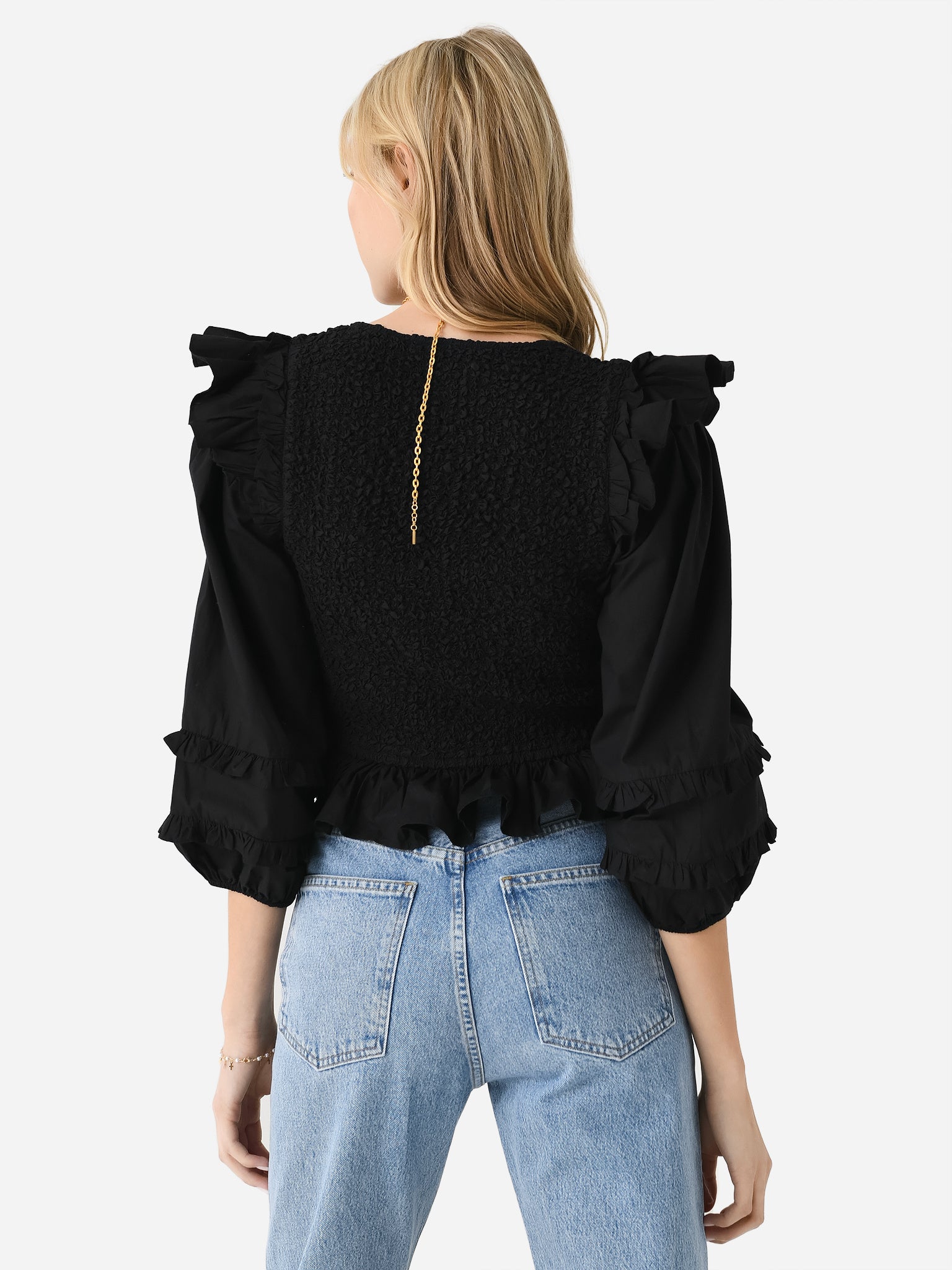 A feminine blouse featuring puff sleeves and ruffle trims throughout.