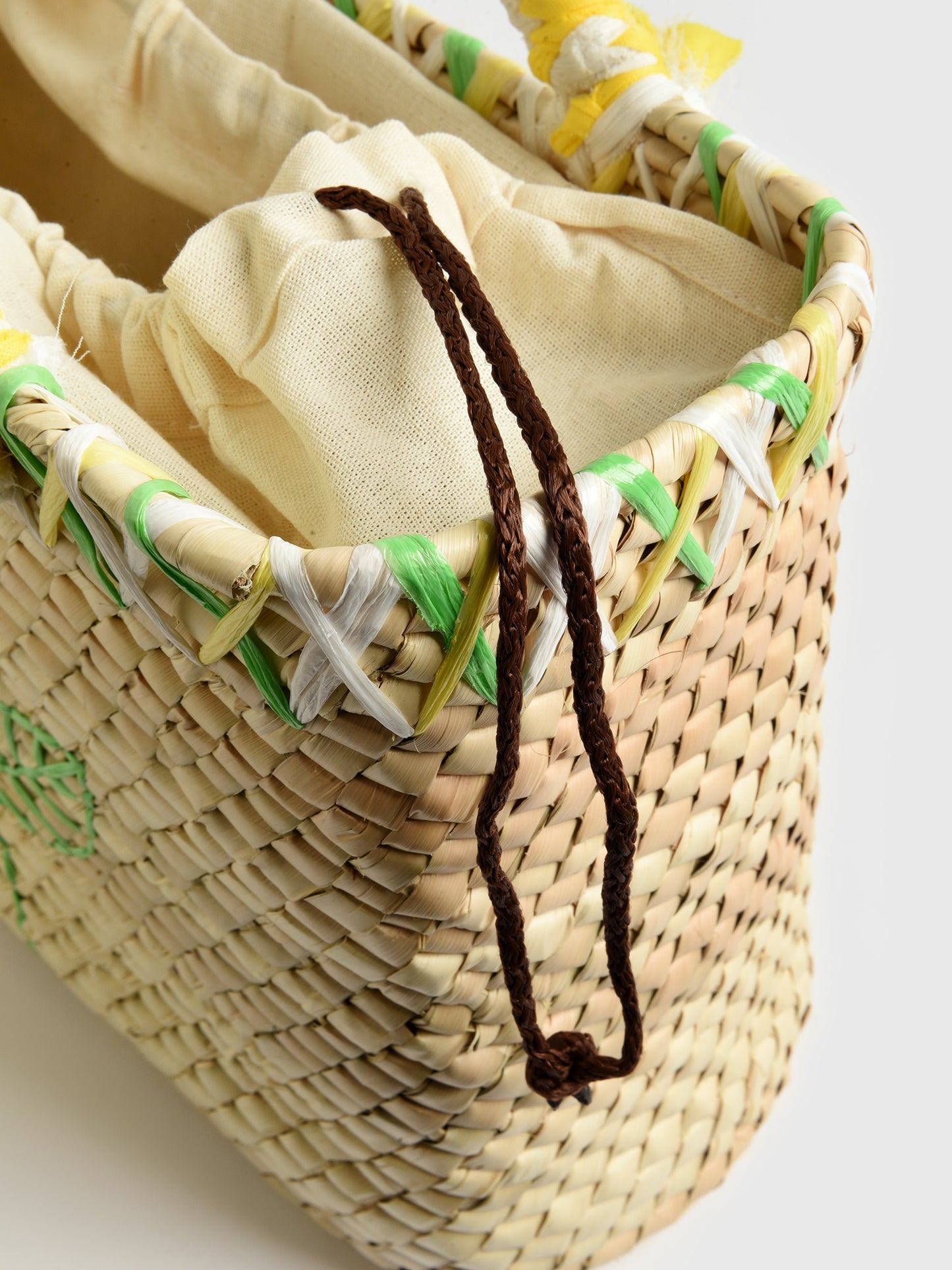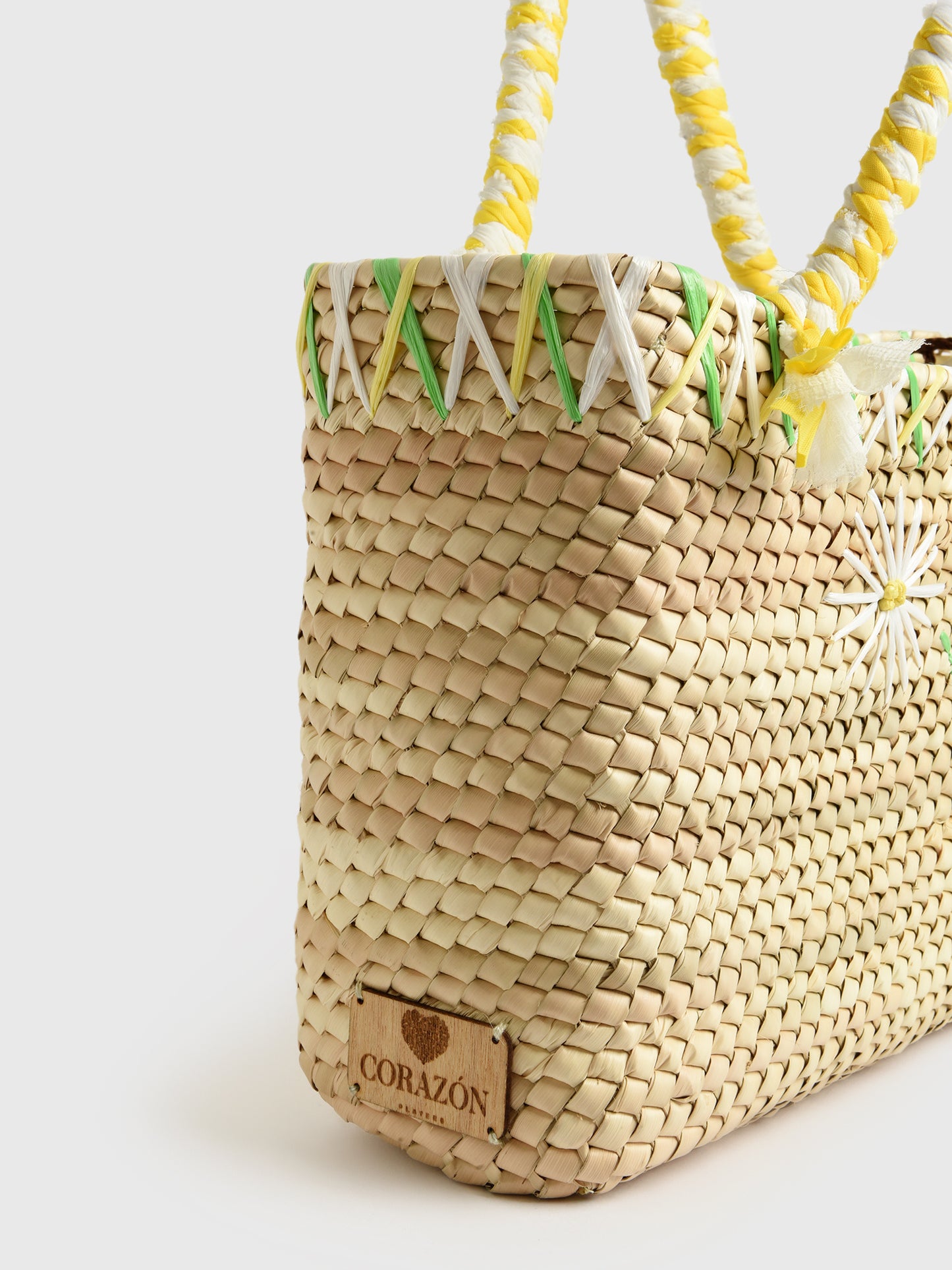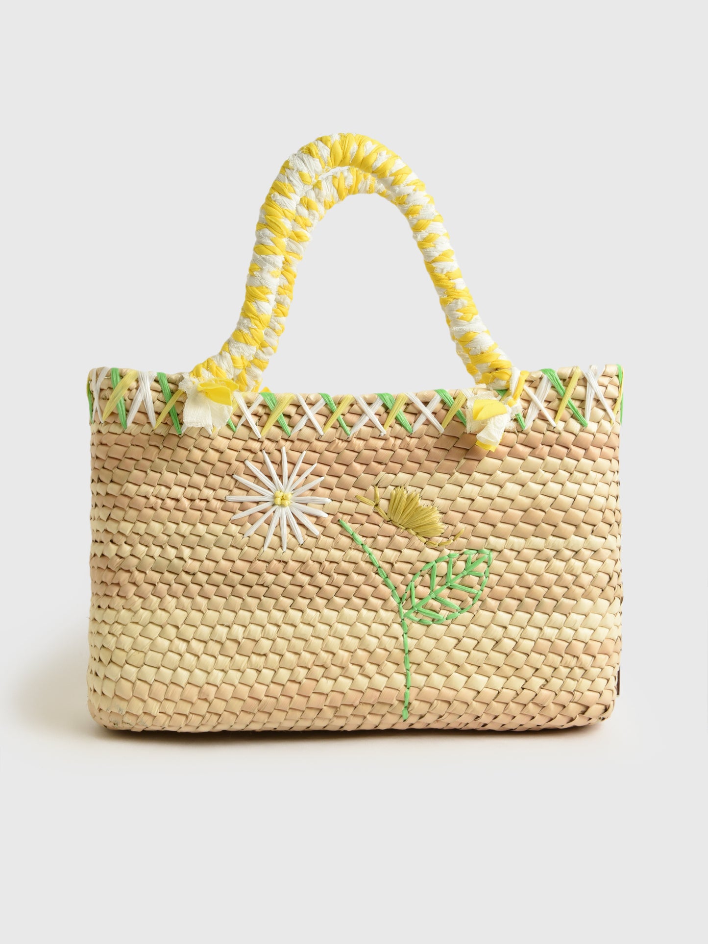 This cute tote bag is handmade from natural palm leaves and features a woven daisy design with matching handles.