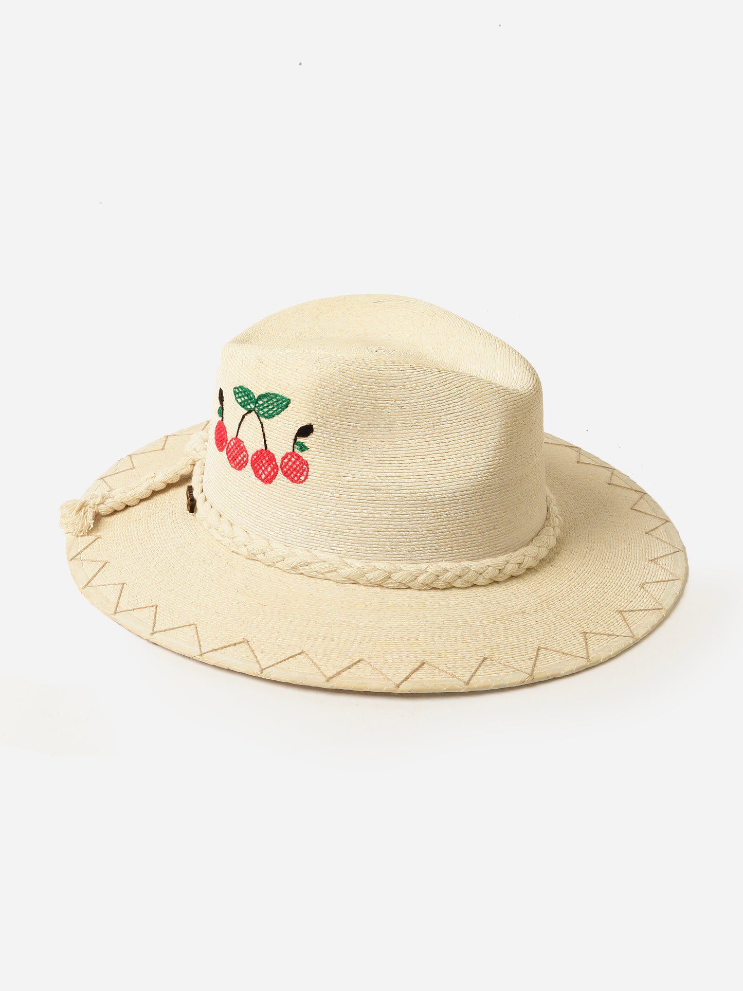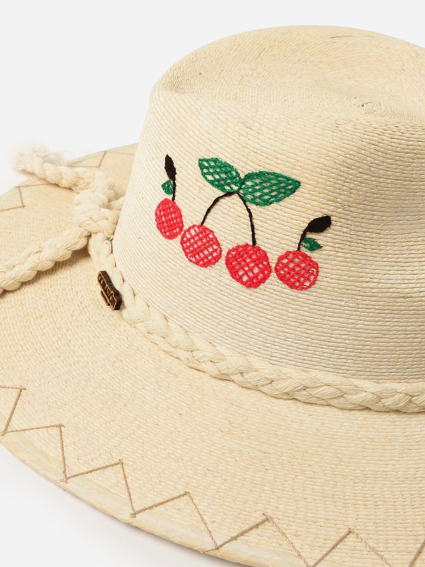 A handmade hat constructed from palm leaves with an embroidered cherry design.