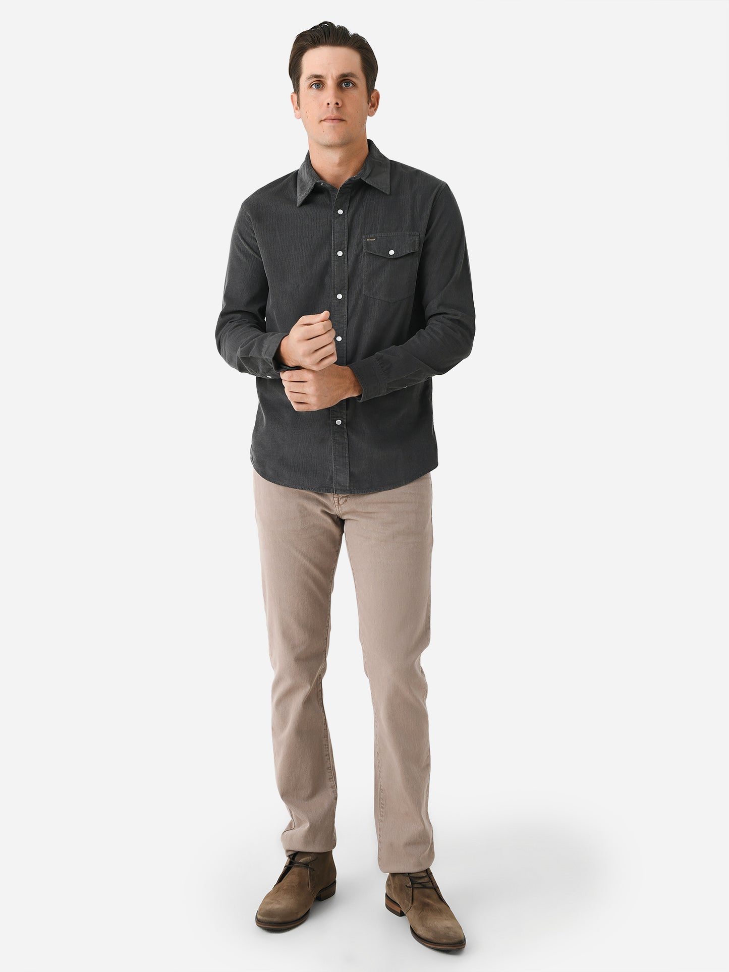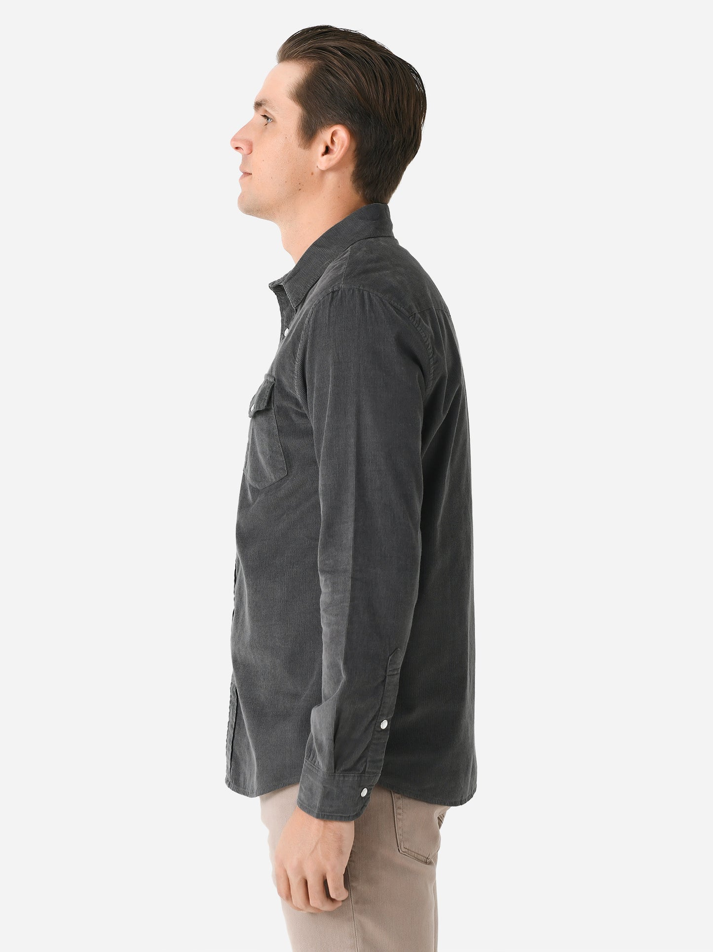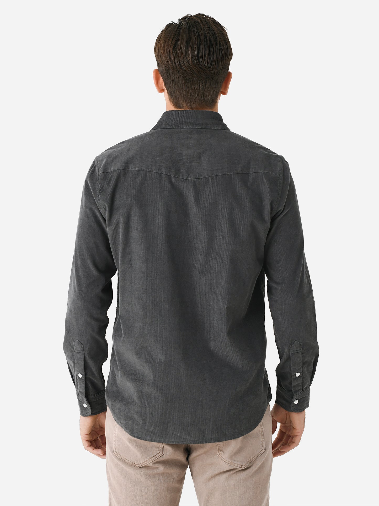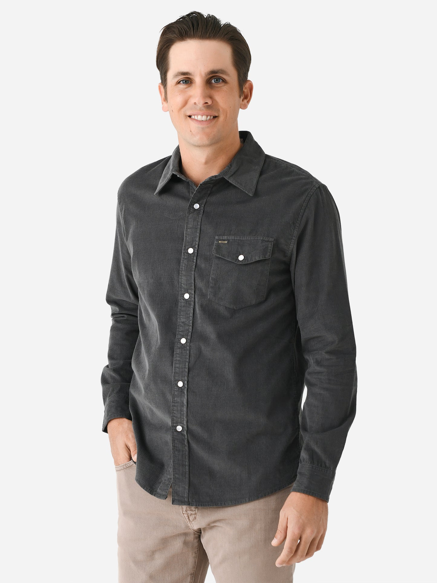 A casual button-down shirt made from thin wale corduroy with pearl snap buttons.